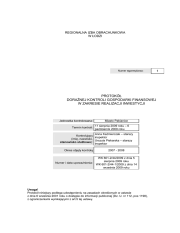REGIONALNA IZBA OBRACHUNKOWA W ŁODZI Numer egzemplarza: PROTOKÓŁ DORAŹNEJ KONTROLI GOSPODARKI FINANSOWEJ W ZAKRESIE REALIZACJI INWESTYCJI Jednostka kontrolowana: Termin kontroli: Miasto Pabianice 11 sierpnia 2009 roku – 6 październik 2009 roku Anna Kaźmierczak – starszy Kontrolujący inspektor (imię, nazwisko, Urszula Piekarska – starszy stanowisko słuŜbowe): inspektor Okres objęty kontrolą Numer i data upowaŜnienia: 2007 - 2008 WK 601-2/44/2009 z dnia 5 sierpnia 2009 roku WK 601-2/44-1/2009 z dnia 14 września 2009 roku Uwaga! Protokół niniejszy podlega udostępnieniu na zasadach określonych w ustawie z dnia 6 września 2001 roku o dostępie do informacji publicznej (Dz. U. nr 112, poz.1198), z ograniczeniami wynikającymi z art.5 tej ustawy. 1 PROTOKÓŁ Z KONTROLI DORAŹNEJ PRZEPROWADZONEJ W MIEŚCIE PABIANICE Regionalna Izba Obrachunkowa w Łodzi, ul. Zamenhofa 10 90-431 Łódź, tel. (0-42) 6366896, fax (0-42) 6367424 I. INFORMACJE WSTĘPNE DANE O JEDNOSTCE Miasto Pabianice obejmuje obszar o powierzchni 33 km2. PołoŜone jest w województwie Łódzkim, w Powiecie Pabianickim. Siedziba Urzędu Miejskiego mieści się przy ulicy Zamkowej 16 w Pabianicach, kod 95-200. Liczba mieszkańców Pabianic na dzień 31 grudnia 2008 roku wynosiła ogółem 69.982 osób, w tym 37.843 kobiet i 32.139 męŜczyzn. Miasto Pabianice posiada nadane numery: − NIP 7311962756, − REGON 472057715. Urząd Miejski w Pabianicach posiada nadane numery: − NIP 731-10-02-565, − REGON 000516910. Kontrola ma charakter doraźnej kontroli gospodarki finansowej w zakresie realizacji inwestycji. II. I. USTALENIA OGÓLNE KIEROWNICTWO JEDNOSTKI Przewodniczący rady miejskiej Funkcję Przewodniczącego Rady Miejskiej w Pabianicach od dnia 1 grudnia 2006 roku pełni GRZEGORZ MACKIEWICZ (uchwała nr I/1/2006 Rady Miejskiej w Pabianicach z dnia 1 grudnia 2006 roku). Prezydent i zastępcy Prezydenta Prezydentem Miasta Pabianic jest ZBIGNIEW DYCHTO wybrany w wyborach bezpośrednich w dniu 26 listopada 2006 roku (zaświadczenie Miejskiej Komisji Wyborczej z dnia 29 listopada 2006 roku). Zarządzeniem nr 14/2006/2007/V Prezydenta Miasta Pabianic z dnia 1 lutego 2007 roku funkcję Zastępcy Prezydenta Miasta Pabianic powierzono Jarosławowi Cichoszowi – jako I Zastępcy Prezydenta Miasta Pabianic. Zarządzeniem nr 113/2009/V Prezydenta Miasta Pabianic z dnia 1 czerwca 2009 roku funkcję Zastępcy Prezydenta Miasta Pabianic powierzono Małgorzacie Biegajło – jako II Zastępcy Prezydenta. Skarbnik miasta Skarbnikiem Miasta jest ElŜbieta Pluta powołana na to stanowisko uchwałą Rady Miejskiej w Pabianicach nr VIII/90/2007 z dnia 25 kwietnia 2007 roku. W okresie wcześniejszym Skarbnikiem Miasta była ElŜbieta Tkaczuk powołana na wymienione stanowisko uchwałą nr XLIV/441/2001 z dnia 31 maja 2001 roku Rady Miasta Pabianic. _____________________________________________________ 2 PROTOKÓŁ Z KONTROLI DORAŹNEJ PRZEPROWADZONEJ W MIEŚCIE PABIANICE Regionalna Izba Obrachunkowa w Łodzi, ul. Zamenhofa 10 90-431 Łódź, tel. (0-42) 6366896, fax (0-42) 6367424 Sekretarz miasta Sekretarzem Miasta Pabianic jest ADAM MARCZAK powołany na to stanowisko uchwałą nr XXXVI/338/04 Rady Miejskiej w Pabianicach z dnia 27 października 2004 roku. I.4.1. GMINNE JEDNOSTKI ORGANIZACYJNE Zgodnie z wprowadzonymi, uchwałą nr XXXIV/452/08 z dnia 29 października 2008 roku, zmianami dotyczącymi wykazu Miejskich Jednostek Organizacyjnych, stanowiącym załącznik nr 3 do statutu Miasta Pabianic, miejskimi jednostkami organizacyjnymi są: 1. Miejska Biblioteka Publiczna (księga rejestrowa nr 2/94), 2. Miejski Ośrodek Kultury (księga rejestrowa nr 3/94), 3. Muzeum Miasta Pabianic (księga rejestrowa nr 1/94), 4. śłobek Miejski, 5. Przedszkole Miejskie nr 2, 6. Przedszkole Miejskie nr 3, 7. Przedszkole Miejskie nr 4, 8. Przedszkole Miejskie nr 5, 9. Przedszkole Miejskie nr 6, 10. Przedszkole Miejskie nr 8, 11. Przedszkole Miejskie nr 11 z Oddziałami Integracyjnymi, 12. Przedszkole Miejskie nr 12, 13. Przedszkole Miejskie nr 13, 14. Przedszkole Miejskie nr 14, 15. Przedszkole Miejskie nr 15, 16. Przedszkole Miejskie nr 16 z Oddziałami Integracyjnymi i Specjalnymi, 17. Szkoła Podstawowa nr 1 z Klasami Integracyjnymi, 18. Szkoła Podstawowa nr 3, 19. Szkoła Podstawowa nr 5, 20. Szkoła Podstawowa nr 8 z Oddziałami Integracyjnymi, 21. Szkoła Podstawowa nr 9 z Oddziałami Integracyjnymi, 22. Szkoła Podstawowa nr 13, 23. Szkoła Podstawowa nr 14, 24. Szkoła Podstawowa nr 17, 25. Gimnazjum nr 1, 26. Gimnazjum nr 2, 27. Gimnazjum nr 3 z Oddziałami Integracyjnymi, 28. Miejski Ośrodek Sportu i Rekreacji, _____________________________________________________ 3 PROTOKÓŁ Z KONTROLI DORAŹNEJ PRZEPROWADZONEJ W MIEŚCIE PABIANICE Regionalna Izba Obrachunkowa w Łodzi, ul. Zamenhofa 10 90-431 Łódź, tel. (0-42) 6366896, fax (0-42) 6367424 29. Miejskie Centrum Pomocy Społecznej, 30. Zakład Gospodarki Mieszkaniowej, 31. Zarząd Dróg i Zieleni Miejskiej, 32. Schronisko dla Zwierząt, 33. Miejski Zakład Pogrzebowy. II. UNORMOWANIA WEWNĘTRZNE Statut miasta W okresie objętym kontrolą obowiązywał Statut Miasta Pabianic przyjęty uchwałą nr VIII/56/03 Rady Miasta Pabianic z dnia 26 lutego 2003 roku, do którego wprowadzone zostały zmiany następującymi uchwałami Rady Miejskiej w Pabianicach: − nr X/70/03 z dnia 23 kwietnia 2003 roku, − nr XXXV/325/04 z dnia 9 października 2004 roku, − nr LVI/488/05 z dnia 14 grudnia 2005 roku, − nr LXVI/556/06 z dnia 5 czerwca 2006 roku, − nr IX/91/07 z dnia 30 maja 2007 roku, − nr XXXIV/452/08 z dnia 29 października 2008 roku. Regulamin organizacyjny Urzędu Miejskiego w Pabianicach W okresie objętym kontrolą obowiązywał Regulamin Organizacyjny Urzędu Miejskiego w Pabianicach wprowadzony zarządzeniem nr 29/2006/IV Prezydenta Miasta Pabianic z dnia 29 marca 2006 roku. Do wspomnianego Regulaminu zostały wprowadzone zmiany następującymi zarządzeniami Pre