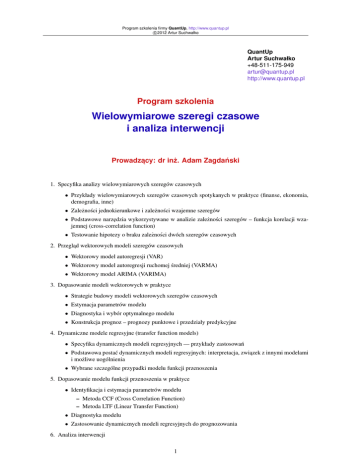 Program szkolenia firmy QuantUp, http://www.quantup.pl c 2012 Artur Suchwałko QuantUp Artur Suchwałko +48-511-175-949 [email protected] http://www.quantup.pl Program szkolenia Wielowymiarowe szeregi czasowe i analiza interwencji Prowadzacy: ˛ dr inż. Adam Zagdański 1. Specyfika analizy wielowymiarowych szeregów czasowych • Przykłady wielowymiarowych szeregów czasowych spotykanych w praktyce (finanse, ekonomia, demografia, inne) • Zależności jednokierunkowe i zależności wzajemne szeregów • Podstawowe narz˛edzia wykorzystywane w analizie zależności szeregów – funkcja korelacji wzajemnej (cross-correlation function) • Testowanie hipotezy o braku zależności dwóch szeregów czasowych 2. Przeglad ˛ wektorowych modeli szeregów czasowych • Wektorowy model autoregresji (VAR) • Wektorowy model autoregresji ruchomej średniej (VARMA) • Wektorowy model ARIMA (VARIMA) 3. Dopasowanie modeli wektorowych w praktyce • Strategie budowy modeli wektorowych szeregów czasowych • Estymacja parametrów modelu • Diagnostyka i wybór optymalnego modelu • Konstrukcja prognoz – prognozy punktowe i przedziały predykcyjne 4. Dynamiczne modele regresyjne (transfer function models) • Specyfika dynamicznych modeli regresyjnych — przykłady zastosowań • Podstawowa postać dynamicznych modeli regresyjnych: interpretacja, zwiazek ˛ z innymi modelami i możliwe uogólnienia • Wybrane szczególne przypadki modelu funkcji przenoszenia 5. Dopasowanie modelu funkcji przenoszenia w praktyce • Identyfikacja i estymacja parametrów modelu – Metoda CCF (Cross Correlation Function) – Metoda LTF (Linear Transfer Function) • Diagnostyka modelu • Zastosowanie dynamicznych modeli regresyjnych do prognozowania 6. Analiza interwencji 1 Program szkolenia firmy QuantUp, http://www.quantup.pl c 2012 Artur Suchwałko • Cel i przykłady stosowania analizy interwencji • Podstawowe modele stosowane w analizie interwencji • Dopasowanie modelu interwencji • Konstrukcja prognoz na bazie modelu interwencji 7. Wykrywanie i analiza obserwacji odstajacych ˛ (outliers) • Wpływ obserwacji odstajacych ˛ na analiz˛e i prognozowanie szeregów • Typy obserwacji odstajacych ˛ • Wykrywanie obserwacji odstajacych ˛ na bazie modeli ARIMA • Wykrywanie i analiza obserwacji odstajacych ˛ na bazie modeli interwencji – Metoda Chang-Tiao-Chen – Metoda Chen-Liu • Identyfikacja obserwacji odstajacych ˛ dla wybranych danych rzeczywistych 8. Wprowadzenie do analizy kointegracji • Idea kointegracji • Testy stopnia integracji i testy stacjonarności – Test Phillipsa-Perrona (PP test) – Test Dickeya-Fullera (ADF test) – Test Kwiatkowskiego-Phillipsa-Schmidta-Shina (KPSS test) • Testowanie kointegracji – metoda Engle’a i Grangera – metoda Johansena • Modele VAR i kointegracja 2