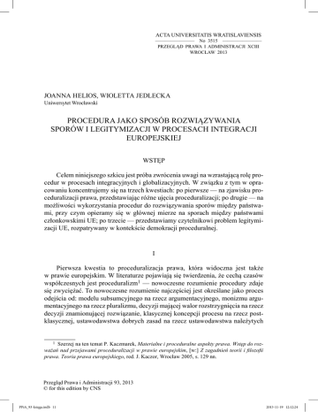 ACTA UNIVERSITATIS WRATISLAVIENSIS ———————— No 3515 ———————— PRZEGLĄD PRAWA I ADMINISTRACJI XCIII WROCŁAW 2013 JOANNA HELIOS, WIOLETTA JEDLECKA Uniwersytet Wrocławski PROCEDURA JAKO SPOSÓB ROZWIĄZYWANIA SPORÓW I LEGITYMIZACJI W PROCESACH INTEGRACJI EUROPEJSKIEJ WSTĘP Celem niniejszego szkicu jest próba zwrócenia uwagi na wzrastającą rolę procedur w procesach integracyjnych i globalizacyjnych. W związku z tym w opracowaniu koncentrujemy się na trzech kwestiach: po pierwsze — na zjawisku proceduralizacji prawa, przedstawiając różne ujęcia proceduralizacji; po drugie — na możliwości wykorzystania procedur do rozwiązywania sporów między państwami, przy czym opieramy się w głównej mierze na sporach między państwami członkowskimi UE; po trzecie — przedstawiamy czytelnikowi problem legitymizacji UE, rozpatrywany w kontekście demokracji proceduralnej. I Pierwsza kwestia to proceduralizacja prawa, która widoczna jest także w prawie europejskim. W literaturze pojawiają się twierdzenia, że cechą czasów współczesnych jest proceduralizm1 — nowoczesne rozumienie procedury zdaje się zwyciężać. To nowoczesne rozumienie najczęściej jest określane jako proces odejścia od: modelu subsumcyjnego na rzecz argumentacyjnego, monizmu argumentacyjnego na rzecz pluralizmu, decyzji mającej walor rozstrzygnięcia na rzecz decyzji znamionującej rozwiązanie, klasycznej koncepcji procesu na rzecz postklasycznej, ustawodawstwa dobrych zasad na rzecz ustawodawstwa należytych 1 Szerzej na ten temat P. Kaczmarek, Materialne i proceduralne aspekty prawa. Wstęp do rozważań nad przejawami proceduralizacji w prawie europejskim, [w:] Z zagadnień teorii i filozofii prawa. Teoria prawa europejskiego, red. J. Kaczor, Wrocław 2005, s. 129 nn. Przegląd Prawa i Administracji 93, 2013 © for this edition by CNS PPiA_93-księga.indb 11 2013-11-19 12:12:24 12 JOANNA HELIOS, WIOLETTA JEDLECKA gwarancji2. Nie są to jedyne możliwe ujęcia proceduralizacji3. Oczywiście istnieją też przeciwnicy twierdzenia, że autonomia prawa procesowego w stosowaniu prawa umacnia wolność i autonomię jednostki w porządku prawnym oraz ułatwia rozwiązywanie konfliktów w drodze konsensualnej4. Dawniej dominowało prawo materialne, co jeszcze jest widoczne w literaturze (na tle analizy poszczególnych poglądów na temat relacji prawo materialne–prawo proceduralne przeważa ujęcie tradycyjne5, w myśl którego procedura pełni funkcję służebną wobec prawa materialnego6). W dzisiejszych czasach pojawiają się natomiast twierdzenia, że procedura jest przede wszystkim7. W literaturze odnajdujemy poglądy wyraźnie opowiadające się za uznaniem prymatu przepisów procesowych8. Taki stan wynika z faktu, że we współczesnym państwie przepisy, mające za przedmiot postępowanie, przejawiają zasadniczy ustrojowo polityczny charakter. W demokratycznym cywilizowanym państwie prawa przepisy proceduralne są najważniejsze. Ich rozwój stanowi o postępie i zwiększaniu praworządności9. Ta sytuacja 2 L. Morawski, Główne problemy współczesnej filozofii prawa. Prawo w toku przemian, Warszawa 1999, s. 151 nn. 3 P. Kaczmarek, Dwa ujęcia proceduralizacji prawa, [w:] Z zagadnień teorii i filozofii prawa. W poszukiwaniu podstaw prawa, red. A. Sulikowski, Wrocław 2006, s. 215. 4 W. Lang, Prawo procesowe a prawo materialne. Wzajemne relacje, [w:] Prawo w XXI wieku. Księga pamiątkowa 50-lecia Instytutu Nauk Prawnych Polskiej Akademii Nauk, red. W. Czapliński, Warszawa 2006, s. 427 nn. 5 Celem egzystencji norm procesowych jest wprowadzanie w życie norm prawa materialnego. W ujęciu dynamicznym postępowanie cywilne jest aktywnością ożywiającą normy materialne i określone przez nie prawa podmiotowe. Jednakże autor podkreśla, że wprawdzie o doniosłości postępowania cywilnego decyduje ranga, jaka łączy się z prawem materialnym na określonym etapie rozwoju stosunków społeczno-gospodarczych, ale o efektywności tego prawa decyduje efektywność samego postępowania. K. Korzan, Praworządność a zagadnienie jedności postępowania cywilnego z punktu widzenia stosunku do prawa materialnego, [w:] Studia z prawa cywilnego, „Prace Naukowe Uniwersytetu Śląskiego” 729, Katowice 1986, s. 21–22. 6 Dla przykładu por. J. Filipek, Glosa do wyroku NSA z 23 maja 1984 roku, II S.A. 79/84, OSPiKA 1985, nr 3, poz. 53, s. 128; W. Dawidowicz, Postępowanie administracyjne. Zarys wykładu, Warszawa 1983, s. 30–31; W. Broniewicz, Normy, przesłanki i zarzuty jurysdykcyjne w procesie cywilnym (Przyczynek do zagadnienia stosunku prawa materialnego i prawa procesowego), „Studia Prawno-Ekonomiczne” 2, 1969, s. 74 nn.; S. Waltoś, Współzależność prawa karnego materialnego i procesowego, „Zeszyty Naukowe Uniwersytetu Jagiellońskiego CCCCXXV. Prace Prawnicze” 1977, z. 74; także A. Wąsek, Związek prawa karnego materialnego z procedurą karną, „Studia Iuridica” 33, 1997. 7 Por. S. Kaźmierczyk, Założenia o refleksjach nad teorią prawa europejskiego, [w:] Z zagadnień teorii i filozofii prawa. Teoria prawa europejskiego, s. 27–28. 8 Czynności procesowe nie mają tylko i wyłącznie charakteru usługowo-pomocniczego wobec czynności materialnoprawnych. M. Piekarski, Czynności materialnoprawne a procesowe w sprawach cywilnych, „Studia Prawnicze” 1973, nr 37, s. 114 nn. 9 J. Łętowski, Recenzja podręcznika B. Adamiak i J. Borkowskiego, Polskie postępowanie administracyjne, Warszawa 1992, „Państwo i Prawo” 1993, nr 4, s. 128. Przegląd Prawa i Administracji 93, 2013 © for this edition by CNS PPiA_93-księga.indb 12 2013-11-06 10:11:47 PROCEDURA JAKO SPOSÓB ROZWIĄZYWANIA SPORÓW I LEGITYMIZACJI 13 jest związana z wolnością10 jednostki i potrzebą jej ochrony11. Wolność jednostki stanowi wartość państwa prawnego12, w związku z czym kładziony jest nacisk na procedury13. Za pomocą stosownych procedur obywate