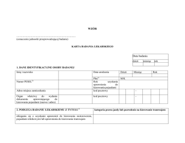 WZÓR ............................................................................................ (oznaczenie jednostki przeprowadzającej badanie) KARTA BADANIA LEKARSKIEGO Data badania dzień miesiąc rok 1. DANE IDENTYFIKACYJNE OSOBY BADANEJ Imię i nazwisko 2) Numer PESEL Adres miejsca zamieszkania Organ właściwy do wydania dokumentu uprawniającego do kierowania pojazdami (nazwa i adres) 2. PODLEGA BADANIU LEKARSKIEMU Z TYTUŁU 1) ubiegania się o uzyskanie uprawnień do kierowania motorowerem, pojazdami silnikowymi lub uprawnienia do kierowania tramwajem Data urodzenia Dzień Płeć1) Rok uzyskania uprawnienia do kierowania pojazdami kod pocztowy M/K kod pocztowy Miesiąc Rok - kategoria prawa jazdy lub pozwolenie na kierowanie tramwajem przedłużenia ważności prawa jazdy określonej kategorii lub pozwolenia na kierowanie tramwajem ubiegania się o przywrócenie uprawnienia do kierowania pojazdem cofniętego ze względu na stan zdrowia kierowania motorowerem, pojazdem silnikowym lub tramwajem w stanie nietrzeźwości, w stanie po użyciu alkoholu lub środka działającego podobnie do alkoholu uzasadnionych i poważnych zastrzeżeń co do stanu zdrowia osoby posiadającej prawo jazdy lub pozwolenie na kierowanie tramwajem występowania o zezwolenie na kierowanie pojazdem uprzywilejowanym lub przewożącym wartości pieniężne albo o przedłużenie ważności tego dokumentu 3. BADANIE OGÓLNE STANU ZDROWIA Badanie podmiotowe Lp. Podstawowe problemy zdrowotne 1. Dolegliwości zgłaszane przez osobę badaną 2. Urazy czaszki 3. Urazy kończyn górnych (kkg), kończyn dolnych (kkd), kręgosłupa 4. Incydenty nagłej utraty świadomości TAK NIE Uwagi lekarza 5. Choroby układu nerwowego, w tym padaczka 6. Choroby psychiczne 7. Choroby układu ruchu 8. Choroby układu krążenia 9. Cukrzyca 10. Choroby układu oddechowego, zaburzenia oddychania podczas snu 11. Choroby układu pokarmowego 12. Choroby endokrynologiczne 13. Choroby układu moczowego 14. Przebyte hospitalizacje, w tym zabiegi operacyjne Leczenie w poradni specjalistycznej (jeżeli tak, to w jakiej? od kiedy?) 15. w tym B. Badanie przedmiotowe3) L.p. Narząd (układ) 1. Budowa ciała 1.1. Głowa Brak zmian patologicznych Opis stwierdzonej patologii 1.2. Blizny skórne i ubytki kostne czaszki 1.3. Ruchomość gałek ocznych, kształt i reakcje źrenic 1.4. Asymetria twarzy, zbaczanie języka 2. Tarczyca 3. Układ oddechowy: - odgłos opukowy …………………………………………. - szmer oddechowy …………………………………………. 4. Układ krążenia 4.1. Miarowość 4.2. Tony serca: szmery 4.3. Tętno na tętnicach obwodowych 4.4. Tętno ......./min. 4.5. RR (w spoczynku) ........... mmHg 5. Brzuch 5.1. Bolesność; opory patologiczne 5.2. Przepukliny 5.3. Wątroba 5.4. Nerki 6. Układ ruchu 6.1. Badanie górnych: 6.1.1. siła mięśniowa 6.1.2. chwytność rąk 6.1.3. ograniczenie ruchomości stawów: sprawności kończyn a) palców i nadgarstków ..................................................... b) łokciowych ………………..………………… c) barkowych ………………...……………….. 6.2. Badanie sprawności kończyn dolnych: 6.2.1 ograniczenie ruchomości stawów: a) stopy i skokowego ………………………………… b) kolanowego i biodrowego ………………………………… Ruchomość kręgosłupa: 6.3. a) odcinka szyjnego b) odcinka lędźwiowego 6.4. Badanie chodu 6.5. Anomalie wrodzone lub pourazowe 7. Układ nerwowy 7.1. Objawy móżdżkowe: - koordynacja ruchowa 7.2. Niedowłady, górnych 7.3. Niedowłady, porażenia kończyn dolnych 7.4. Zaniki mięśniowe 7.5. Objaw Babińskiego 8. Stan psychiczny porażenia kończyn C. Skierowania na badania pomocnicze albo konsultacje specjalistyczne: ……………………………………………………………………… .......................................................................................................................................................................................….............................…………… …………………………………………………………………………............................................................................................................................ ………………….. (data) …………………………………….. (podpis i pieczątka uprawnionego lekarza) 4. BADANIE NARZĄDU WZROKU Imię i nazwisko badanego ………………………………………………………………………………………………………………………………. numer PESEL2) ………………………………………………………….……………………………………………………………………………… Adres miejsca zamieszkania …………………………………………………………………………………………………………………………… Podlega badaniu lekarskiemu z tytułu (wpisać na podstawie części 2 karty badania lekarskiego – tylko w przypadku badania wykonywanego przez lekarza posiadającego specjalizację w dziedzinie okulistyki) ............................................................................................................................................................................................................................................ ............................................................................................................................................................................................................................................ Wywiad chorobowy TAK Lp. 1. Przebyte choroby, urazy i operacje 2. Korekcja okularowa 3. Soczewki kontaktowe NIE Jeżeli TAK, to podać dane od ilu lat? od ilu lat? Badanie przedmiotowe Lp. 1. 2. Oko prawe Ostrość wzroku bez korekcji Ostrość wzroku z korekcją (podać korekcję i uzyskaną ostrość) Oko lewe Opis patologii O