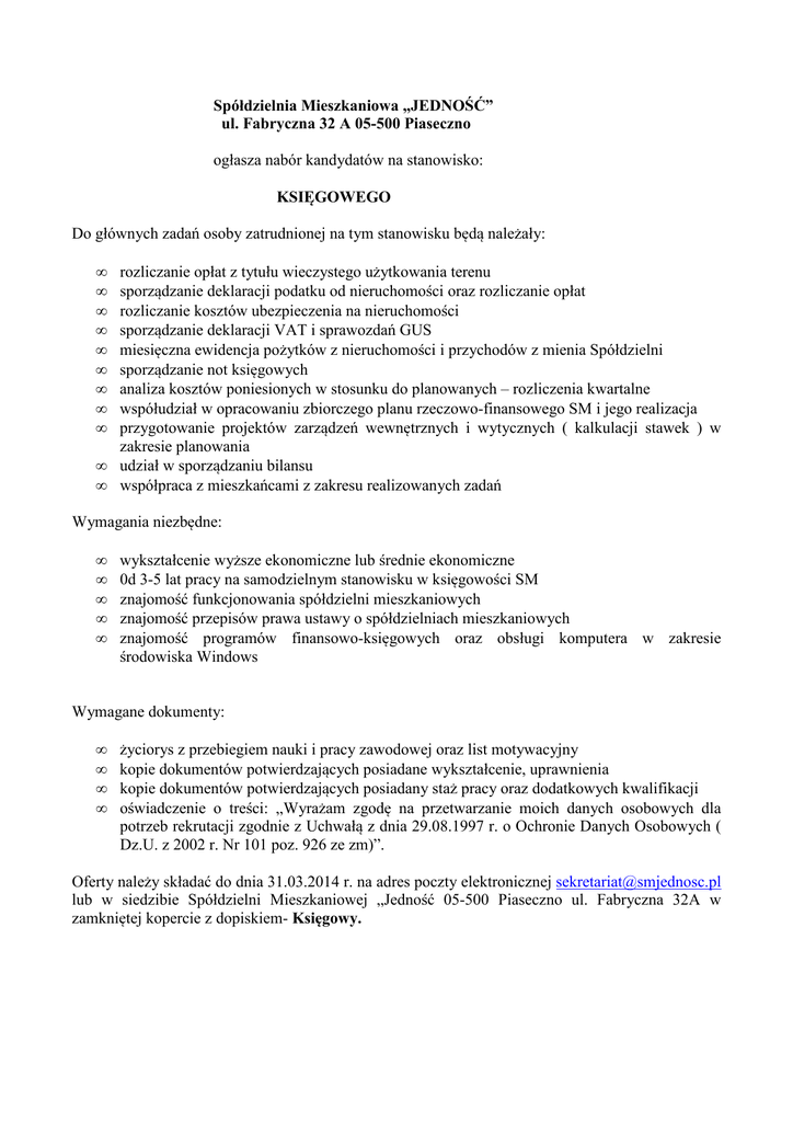 Spółdzielnia Mieszkaniowa „JEDNOŚĆ” ul. Fabryczna 32 A 05-500 Piaseczno ogłasza nabór kandydatów na stanowisko: KSIĘGOWEGO Do głównych zadań osoby zatrudnionej na tym stanowisku będą należały: • • • • • • • • • • • rozliczanie opłat z tytułu wieczystego użytkowania terenu sporządzanie deklaracji podatku od nieruchomości oraz rozliczanie opłat rozliczanie kosztów ubezpieczenia na nieruchomości sporządzanie deklaracji VAT i sprawozdań GUS miesięczna ewidencja pożytków z nieruchomości i przychodów z mienia Spółdzielni sporządzanie not księgowych analiza kosztów poniesionych w stosunku do planowanych – rozliczenia kwartalne współudział w opracowaniu zbiorczego planu rzeczowo-finansowego SM i jego realizacja przygotowanie projektów zarządzeń wewnętrznych i wytycznych ( kalkulacji stawek ) w zakresie planowania udział w sporządzaniu bilansu współpraca z mieszkańcami z zakresu realizowanych zadań Wymagania niezbędne: • • • • • wykształcenie wyższe ekonomiczne lub średnie ekonomiczne 0d 3-5 lat pracy na samodzielnym stanowisku w księgowości SM znajomość funkcjonowania spółdzielni mieszkaniowych znajomość przepisów prawa ustawy o spółdzielniach mieszkaniowych znajomość programów finansowo-księgowych oraz obsługi komputera w zakresie środowiska Windows Wymagane dokumenty: • • • • życiorys z przebiegiem nauki i pracy zawodowej oraz list motywacyjny kopie dokumentów potwierdzających posiadane wykształcenie, uprawnienia kopie dokumentów potwierdzających posiadany staż pracy oraz dodatkowych kwalifikacji oświadczenie o treści: „Wyrażam zgodę na przetwarzanie moich danych osobowych dla potrzeb rekrutacji zgodnie z Uchwałą z dnia 29.08.1997 r. o Ochronie Danych Osobowych ( Dz.U. z 2002 r. Nr 101 poz. 926 ze zm)”. Oferty należy składać do dnia 31.03.2014 r. na adres poczty elektronicznej [email protected] lub w siedzibie Spółdzielni Mieszkaniowej „Jedność 05-500 Piaseczno ul. Fabryczna 32A w zamkniętej kopercie z dopiskiem- Księgowy.