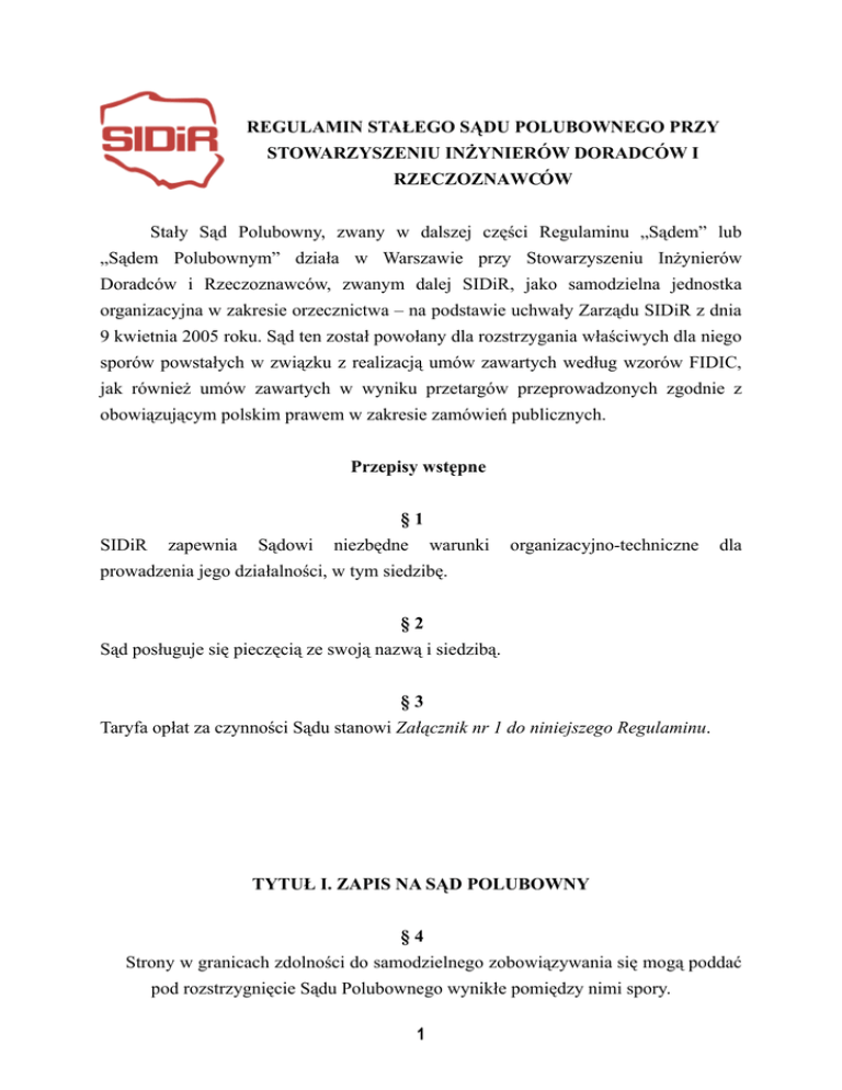 REGULAMIN STAŁEGO SĄDU POLUBOWNEGO PRZY STOWARZYSZENIU INŻYNIERÓW DORADCÓW I RZECZOZNAWCÓW Stały Sąd Polubowny, zwany w dalszej części Regulaminu „Sądem” lub „Sądem Polubownym” działa w Warszawie przy Stowarzyszeniu Inżynierów Doradców i Rzeczoznawców, zwanym dalej SIDiR, jako samodzielna jednostka organizacyjna w zakresie orzecznictwa – na podstawie uchwały Zarządu SIDiR z dnia 9 kwietnia 2005 roku. Sąd ten został powołany dla rozstrzygania właściwych dla niego sporów powstałych w związku z realizacją umów zawartych według wzorów FIDIC, jak również umów zawartych w wyniku przetargów przeprowadzonych zgodnie z obowiązującym polskim prawem w zakresie zamówień publicznych. Przepisy wstępne §1 SIDiR zapewnia Sądowi niezbędne warunki organizacyjno-techniczne dla prowadzenia jego działalności, w tym siedzibę. §2 Sąd posługuje się pieczęcią ze swoją nazwą i siedzibą. §3 Taryfa opłat za czynności Sądu stanowi Załącznik nr 1 do niniejszego Regulaminu. TYTUŁ I. ZAPIS NA SĄD POLUBOWNY §4 Strony w granicach zdolności do samodzielnego zobowiązywania się mogą poddać pod rozstrzygnięcie Sądu Polubownego wynikłe pomiędzy nimi spory. 1 Sąd może przyjąć do rozstrzygnięcia spór bez względu na obywatelstwo, kraj zamieszkania lub siedziby stron. Dopóki strony obowiązuje umowa o poddanie sporu pod rozstrzygnięcie sądu polubownego, nie można żądać rozpoznania sporu przez sąd powszechny. §5 1. Sąd będzie właściwy do rozpoznania sporu gdy: a) przed powstaniem sporu, strony zamieściły w umowie klauzulę, z której wynika, że zgodziły się na poddanie ich sporów do rozstrzygnięcia Sądowi Polubownemu (klauzula arbitrażowa). b) po powstaniu sporu, strony wyrażając zgodę aby dany spór został rozstrzygnięty przez Sąd Polubowny, zawarły pisemną umowę o arbitraż. c) strony mogą uzgodnić, że postępowanie przed Sądem Polubownym w ich sprawie będzie w określony sposób odbiegało od postanowień niniejszego Regulaminu dotyczących przebiegu postępowania przed tym Sądem. 2. Umowa o poddanie sporu pod rozstrzygnięcie Sądu Polubownego (zapis na sąd polubowny) powinna być sporządzona na piśmie i podpisana przez obie strony. §6 W zapisie na sąd polubowny strony mogą przewidzieć powołanie sądu polubownego drugiej instancji. §7 Zapis na sąd polubowny może zawierać wskazanie arbitrów i arbitra przewodniczącego lub liczbę arbitrów i sposób ich powołania oraz ich arbitra przewodniczącego. §8 Wzór klauzuli arbitrażowej stanowi Załącznik nr 2 do niniejszego Regulaminu. 2 TYTUŁ II. ARBITRZY §9 Arbitrzy wyznaczeni do rozstrzygnięcia sporu lub arbiter rozstrzygający spór samodzielnie mogą orzec o właściwości Sądu Polubownego dla rozstrzygnięcia sporu. § 10 Sąd Polubowny składa się z : 1. Prezesa Sądu i jego zastępców - Wiceprezesów, 2. Arbitrów, 3. Sekretarza Sądu i jego zastępcy. § 11 1. Prezes Sądu Polubownego reprezentuje Sąd Polubowny we wszystkich sprawach, a także organizuje i kieruje pracami Sądu Polubownego. 2. Za wyjątkiem dokonania wpisu i wykreślenia arbitrów z listy arbitrów Wiceprezesi mogą Prezesa Sądu zastępować we wszystkich sprawach. 3. Wszystkie czynności w sprawie, w której Prezes Sądu Polubownego został powołany na arbitra, wykonują Wiceprezesi. 4. Prezes Sądu oraz zastępujący go Wiceprezesi tworzą łącznie Prezydium Sądu. § 12 Arbitrem Sądu Polubownego może być tylko osoba spełniająca następujące warunki: 1. jest obywatelem polskim, 2. jest nieskazitelnego charakteru, 3. korzysta z pełni praw publicznych, 4. ma pełną zdolność do czynności prawnych, 5. jest nie karana. 6. nie jest sędzią państwowym. § 13 Jeżeli arbitrzy nie zostali wyznaczeni w zapisie na sąd polubowny, a wyznaczenie ich należy do stron, strona która wyznaczyła swego arbitra (arbitrów), zawiadomi o tym przeciwnika, wzywając go aby w ciągu tygodnia od 3 otrzymania wezwania wyznaczył swego arbitra (arbitrów) i zawiadomił ją o swym wyborze. Zawiadomienia dokonywa się listem poleconym Wyznaczeni arbitrzy wybiorą arbitra przewodniczącego, jeżeli zapis na sąd polubowny nie stanowi inaczej. § 14 Jeżeli strona przeciwna na wezwanie nie wyznaczy w terminie swego arbitra lub jeżeli arbitrzy nie zgodzili się na wybór arbitra przewodniczącego, Prezes Sądu na wniosek strony wyznaczy arbitra lub arbitra przewodniczącego z listy arbitrów, chyba, że zapis stanowi inaczej. Postanowienie Prezesa Sądu w sprawie wyznaczenia arbitra lub arbitra przewodniczącego może być wydane na posiedzeniu niejawnym. Na postanowienie przysługuje zażalenie. § 15 W braku odmiennej umowy zapis na sąd polubowny traci moc, gdy arbiter lub arbiter przewodniczący wyznaczony wspólnie przez strony w zapisie uchyli się od wykonania swego obowiązku lub gdy wykonanie tego obowiązku z innych przyczyn stanie się niemożliwe, a nie nastąpi wyznaczenie arbitra lub arbitra przewodniczącego w sposób wskazany w paragrafie poprzedzającym. § 16 1. Prezes Sądu prowadzi listę arbitrów. Wpisu na listę i wykreślenie z listy arbitrów dokonuje Prezes Sądu Polubownego na podstawie podjętej przez Zarząd SIDiR uchwały. 2. Lista arbitrów zawiera dane dotyczące arbitrów, w szczególności informacje o kwalifikacjach zawodowych oraz znajomości języków obcych. Na listę arbitrów mogą być wpisane osoby, które dają należytą rękojmię wykonywania funkcji arbitra i zgodzą się na umieszczenie na liście arbitrów. 3. Na wniosek stron Prezes Sądu może powołać do rozstrzygnięcia sprawy osobę spełniającą wymagania przewidziane w § 12 nie wpisaną na listę arbitrów. 4. Prezes Sądu może zwolnić wyznaczonego arbitra od rozpoznania sprawy tylko z ważnych powodów. 4 § 17 Administrację Sekretariatu Sądu prowadzi SIDiR. Sekretariatem Sądu kieruje Sekretarz Sądu i jego zastępca. Sprawowanie funkcji sekretarza można powi