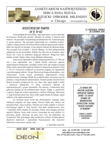 SANKTUARIUM NAJŚWIĘTSZEGO SERCA PANA JEZUSA JEZUICKI OŚRODEK MILENIJNY w Chicago www.jezuici.org Niszczycielski pomysł Łk 9, 51-62 13. Niedziela zwykła 26 czerwca 2016 Jezus podążał do Jerozolimy. Jego nauczanie i życie zmierzały ku końcowi. Szedł jako prorok i Mesjasz do miasta, w którym miał umrzeć. Na początku mesjańskiego posłannictwa nie został przyjęty w swym mieście. Zły początek zapowiadał też i niedobry koniec. Ludzie z miejscowości, do której chciał wejść po opuszczeniu Galilei, także nie chcieli Go przyjąć, a tym samym zmusili do dłuższej drogi. Nie przyjęto tam uczniów i Jezusa dlatego, że byli pielgrzymami udającymi się do Jerozolimy. Każdy, kto chce iść za Jezusem, musi liczyć się z tym, że niektórzy mogą go odrzucić. Mogą być takie miasta, wioski i domy, które wieją chłodem odrzucenia. Jezus uczył Apostołów miłości nieprzyjaciół (Łk 6, 27-30), ale oni o tym zapomnieli. Jan i Jakub chcieli zniszczyć ogniem niegościnnych Samarytan i postąpić wobec nich, jak niegdyś uczynił Eliasz, który sprowadził ogień na żołnierzy chcących go pojmać (2 Krl 1, 10-12). Uczniowie zasłużyli na Jezusową naganę, bo zapomnieli o przebaczającej miłości. Droga Mistrza jest drogą miłosierdzia, a nie zniszczenia! Uczeń Jezusa przemienia nieprzyjaciół swoim przebaczeniem i posługą. Modli się za takich ludzi, nie gorszy się ich postawą i niegościnnym zachowaniem. Synami gromu nazwał Jezus dwóch uczniów pytających Go, czy chce, aby ogień spadł z nieba i zniszczył Samarytan. Ci dwaj uczniowie należeli do najwierniejszych z grona Apostołów. Ich emocje i wzburzenie były gniewną reakcją na złe potraktowanie Jezusa. Nigdy w gorliwości o sprawy Boga nie wolno zapomnieć o miłości bliźniego, albowiem w Jego Kościele może być użyty tylko ogień Ducha Świętego, ogień miłości, a nie ogień nienawiści! Za Jezusem przez świat idą chrześcijanie, szukając ludzi zdolnych rozgrzać się Jego nauką. Zawsze będą tacy, którzy nie przyjmą Pana i Jego uczniów. Nikomu nie wolno zapalać w świecie niszczącego ognia w imię Jezusa! Jest dość miejscowości, serc i umysłów, które chętnie Go przyjmą. Nasze serca pragną szczerze ugościć Mistrza. Jezus stale wzywa i powołuje do swej służby. Co powiemy, kiedy zatrzyma się przy nas? Czy nie będziemy się wymawiać? Pan, powołując, daje możliwość wyboru. Trzeba opuścić duchowo martwych i apostolsko bezczynnych, aby Jezusowi ofiarować swoje serce, umysł i siły. o. Stanisław Groń SJ RADIO DEON WNWI 1080 AM ,,To winno być naszym zajęciem: zwyciężać samego siebie i co dzień stawać się wewnętrznie silniejszym i bodaj trochę postąpić w dobrym.’’ Tomasz a kempis o naśladowaniu chrystusa pon. - pt. 12:00 AM - 11:00 AM całą dobę www.radiodeon.com Tel. (773) 283 2425 / Fax. (773) 283 2435 PORZĄDEK MSZY ŚWIĘTYCH Poniedziałek - pi¹tek: 8:00, 18:00, 19:00 I piątek miesiąca: 8:00, 18:00 i 19:00 Środa: 19:00 - nowenna do Matki Bożej Nieustającej Pomocy Sobota: 8:00 i 19:00 , tylko w I sobotę miesiąca o 17:00 dla chorych, Niedziela: 8:00 (radiowa), 9:30, 11:00, 13:00, 19:00, 20:30 SpowiedŸ św.: od poniedziałku do soboty - 7:30 i 18:30, w niedzielę - pó³ godziny przed ka¿d¹ Msz¹ Œwiêt¹, W 1. pi¹tek miesi¹ca - od 17:30 do 20:00 -=- Adoracja Najświętszego Sakramentu - od poniedziałku do czwartku - od 18:30 do 19:00 sobota - od 18:00 do 19:00 Sanktuarium Najświętszego Serca Pana Jezusa Jezuicki Ośrodek Milenijny 5835 W. Irving Park Rd.; Chicago, IL 60634, tel. 773 777 7000 fax 773 427 0126 www.jezuici.org e-mail: [email protected] Audycje Radia DEON: tel. 773 283 2425 Fax. 773 283 2435 www. radiodeon.com e-mail: [email protected] Biuro czynne: od poniedziałku do soboty: 8:30 - 9:00, 15:30 - 20:30 niedziela: 8:30 - 15:00 Biblioteka czynna: niedziela: 10:30 - 14:30 Kawiarenka czynna: niedz.: 10:00 - 15:00 Sacred Heart Mission House 4105 N. Avers Ave., Chicago, IL 60618 tel. 773 588 74 76; fax 773 588 65 17 Rektor Sanktuarium i Przełożony Jezuitów o. Tomasz Oleniacz , SJ (773-588-7476 - ext. 224) o. Józef Birecki, SJ (773-777-7000 - ext. 121) o. Jerzy Mordarski, SJ (773-588-7476 - ext. 234) o. Jerzy Karpiński, SJ (773-588-7476 - ext. 237) o. Paweł Witon, SJ (773-588-7476 - ext. 227) br. Adam Poręba, SJ (773-777-7000 - ext. 122) Wszelkie ofiary i donacje prosimy kierowaæ na adres Sanktuarium. Donacje s¹ wolne od podatku i mo¿na je odpisywaæ przy rozliczeniu z IRS. TRANSMISJE RADIOWE I INTERNETOWE w internecie pod adresem: http://75.145.184.1/polishmass niedziela: godz 8:00, Radio WCEV 1450 Codziennie przez całą dobę: Kamera internetowa z Sanktuarium (obraz i dźwięk; używać Internet Explorer): www.jezuici.org - link „Transmisje na żywo” – wpisać jako użytkownik i hasło: 5835 INTENCJE MSZY ŚWIĘTYCH Niedziela, 26 VI 8:00 + Janina Dys w rocznicę śmierci 9:30 Zbiorowa 11:00 + Jan Loś o szczęście wieczne 13:00 + Mikołaj Lewsza w 15. rocznicę śmierci 19:00 Zbiorowa 20:30 + + Jan i Janina Ronek, + Janina Janoczak Poniedziałek, 27 VI 8:00 + + Maria i Franciszek Baranek 18:00 dziękczynna za otrzymane łaski w czasie pobytu w Ameryce o miłosierdzie Boże, zdrowie, Boże błogosławieństwo i opiekę Matki Bożej dla Alicji 19:00 Zbiorowa Wtorek, 28 VI 8:00 + Piotr oraz zmarli z rodziny 18:00 dziękczynna za otrzymane łaski w czasie pobytu w Ameryce o miłosierdzie Boże, zdrowie, Boże błogosławieństwo i opiekę Matki Bożej dla Alicji 19:00 Zbiorowa Środa, 29 VI 8:00 za Dobroczyńców Jezuickiego Ośrodka Milenijnego 18:00 + Anna Kalata w 18. rocznicę śmierci 19:00 Zbiorowa Czwartek, 30 VI 8:00 + Sławomir Czabała w 22. rocznicę śmierci 18:00 + Władysław Ledwoń w 3. rocznicę śmierci 19:00 Zbiorowa Piątek, 1 VII 8:00 o Boże błogosławieństwo i opiekę Matki Bożej dla Mateusza 18:00 Zbiorowa 19:00 Wynagradzająca Najświętszemu Sercu Pana Jezusa i z