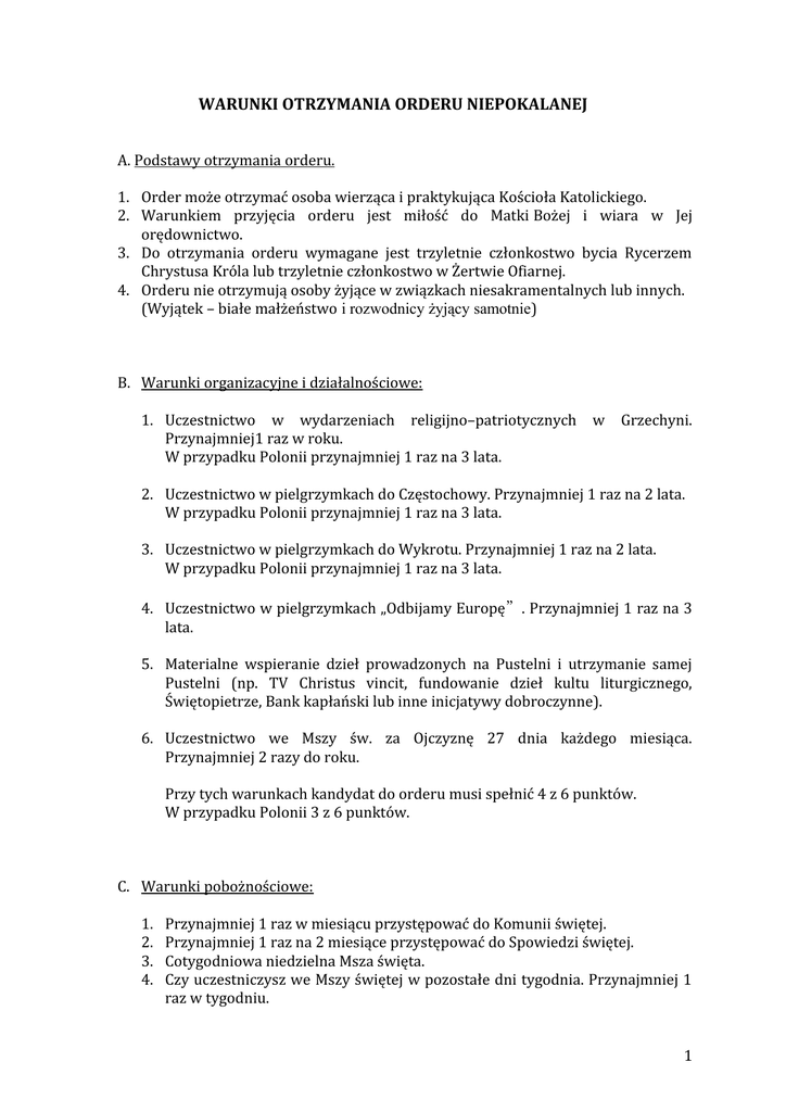 WARUNKI OTRZYMANIA ORDERU NIEPOKALANEJ A. Podstawy otrzymania orderu. 1. Order może otrzymać osoba wierząca i praktykująca Kościoła Katolickiego. 2. Warunkiem przyjęcia orderu jest miłość do Matki Bożej i wiara w Jej orędownictwo. 3. Do otrzymania orderu wymagane jest trzyletnie członkostwo bycia Rycerzem Chrystusa Króla lub trzyletnie członkostwo w Żertwie Ofiarnej. 4. Orderu nie otrzymują osoby żyjące w związkach niesakramentalnych lub innych. (Wyjątek – białe małżeństwo i rozwodnicy żyjący samotnie) B. Warunki organizacyjne i działalnościowe: 1. Uczestnictwo w wydarzeniach religijno–patriotycznych Przynajmniej1 raz w roku. W przypadku Polonii przynajmniej 1 raz na 3 lata. w Grzechyni. 2. Uczestnictwo w pielgrzymkach do Częstochowy. Przynajmniej 1 raz na 2 lata. W przypadku Polonii przynajmniej 1 raz na 3 lata. 3. Uczestnictwo w pielgrzymkach do Wykrotu. Przynajmniej 1 raz na 2 lata. W przypadku Polonii przynajmniej 1 raz na 3 lata. 4. Uczestnictwo w pielgrzymkach „Odbijamy Europę”. Przynajmniej 1 raz na 3 lata. 5. Materialne wspieranie dzieł prowadzonych na Pustelni i utrzymanie samej Pustelni (np. TV Christus vincit, fundowanie dzieł kultu liturgicznego, Świętopietrze, Bank kapłański lub inne inicjatywy dobroczynne). 6. Uczestnictwo we Mszy św. za Ojczyznę 27 dnia każdego miesiąca. Przynajmniej 2 razy do roku. Przy tych warunkach kandydat do orderu musi spełnić 4 z 6 punktów. W przypadku Polonii 3 z 6 punktów. C. Warunki pobożnościowe: 1. 2. 3. 4. Przynajmniej 1 raz w miesiącu przystępować do Komunii świętej. Przynajmniej 1 raz na 2 miesiące przystępować do Spowiedzi świętej. Cotygodniowa niedzielna Msza święta. Czy uczestniczysz we Mszy świętej w pozostałe dni tygodnia. Przynajmniej 1 raz w tygodniu. 1 5. Adoracja Najświętszego Sakramentu (15 minut) w dowolnym kościele. Osobiste nawiedzenie Pana Jezusa. Nie musi być wystawiony Pan Jezus w Najświętszym Sakramencie. Przynajmniej 2 razy na tydzień. 6. Uczestnictwo w nabożeństwach parafialnych (roraty, Droga Krzyżowa, Gorzkie żale, majówki przy figurkach, nabożeństwa: majowe, czerwcowe i różańcowe, różne oktawy, odpusty parafialne lub inne nabożeństwa, adwentowe i wielkopostne rekolekcje parafialne). Przynajmniej 15 razy na rok. 7. Pierwsze piątki miesiąca. 8. Pierwsze soboty miesiąca. 9. Pacierze ranne i wieczorne. 10. Modlitwa Anioł Pański (godz. 6:00, 12:00, 18:00 lub 21:00). Przynajmniej 6 razy w tygodniu. 11. Czy kiedy cię zastanie modlitwa Anioł Pański w miejscu publicznym, klękasz na kolana? 12. Czy odmawiasz Koronkę do Miłosierdzia Bożego? Przynajmniej 4 razy na tydzień. 13. Czy odmawiasz Różaniec święty. Przynajmniej 1 raz w tygodniu. 14. Czy odmawiasz modlitwę św. Brygidy Szwedzkiej –Tajemnica Szczęścia? 15. Czy odmawiasz modlitwę św. Brygidy Szwedzkiej – 7 Ojcze nasz i 7 Zdrowaś Maryjo ku czci Najdroższej Krwi Pana Jezusa? 16. Czy odprawiasz Drogę Krzyżową raz na miesiąc? 17. Czy odmawiasz nowennę do Chrystusa Króla raz na rok? 18. Czy modlisz się za kapłanów? 19. Czy uczestniczysz we Mszach świętych w święta kościelne? (św. Józef, Wniebowstąpienie Pańskie, św. Piotr i Paweł, Wniebowzięcie Matki Bożej, Dzień Zaduszny, Niepokalane Poczęcie i w drugie dni świąt Bożego Narodzenia, Wielkanocy i w Zielone Święta Zesłania Ducha Świętego). 20. Czy modlisz się za zmarłych? 21. Czy korzystasz z daru odpustów zupełnych? 22. Czy modlisz się do Ducha Świętego przed różnymi swoimi działaniami? 23. Czy pamiętasz o przyjaźni z twoim Aniołem Stróżem? 24. Czy pamiętasz o przyjaźni ze swoim świętym patronem? 25. Czy przestrzegasz 1 Regułę Mariańską? 26. Czy przestrzegasz 2 Regułę Mariańską? 27. Czy przestrzegasz 3 Regułę Mariańską? 28. Czy przestrzegasz 4 Regułę Mariańską? 29. Czy przestrzegasz 5 Regułę Mariańską? 30. Czy przestrzegasz 6 Regułę Mariańską? 31. Czy przestrzegasz 7 Regułę Mariańską? 32. Czy przestrzegasz 8 Regułę Mariańską? 33. Czy przestrzegasz 9 Regułę Mariańską? 34. Czy przestrzegasz 10 Regułę Mariańską? 35. Czy przestrzegasz 11 Regułę Mariańską? 36. Czy pościsz od mięsa w piątki? 37. Czy pościsz o chlebie i wodzie w środy i w piątki? Przynajmniej 3 razy w miesiącu? 38. Czy brałeś udział w pokutnej pielgrzymce na Pustelni 13 dnia miesiąca? (Przynajmniej 1 raz na 3 lata). 2 39. Czy brałeś udział w Jerychu Różańcowym w Grzechyni? Przynajmniej 1 raz na 2 lata. 40. Czy przyjmujesz Komunię świętą na kolanach i do ust? 41. Czy przyklękasz przed Najświętszym Sakramentem? 42. Czy w Kościele zachowujesz skupienie i ciszę? 43. Czy do Kościoła chodzisz ubrany odświętnie i godnie? 44. Czy żegnasz się przechodząc obok Kościoła, cmentarza, figur i kapliczek przydrożnych? 45. Czy ściągasz czapką przechodząc obok kościoła? W przypadku kobiet wystarczy się przeżegnać. 46. Czy używasz pozdrowienia: „Niech będzie pochwalony Jezus Chrystus?” (rozmowy telefoniczne, maile, wchodząc do mieszkania, sklepu, banku, na ulicy) Przynajmniej 5 razy dziennie. 47. Czy czytasz Pismo święte? 48. Czy czytasz zalecanych mistyków? 49. Czy czytasz nasze Orędzia na Czasy Ostateczne, które właśnie nadeszły? 50. Czy posiadasz Niezbędnik Rycerza Chrystusa Króla? 51. Czy posiadasz Niezbędnik łaciński Orationes & hymni? 52. Czy posiadasz Regułę Mariańską? 53. Czy posiadasz rycerski różaniec? 54. Czy posiadasz Modlitewnik za konających i zmarłych? 55. Czy posiadasz podręcznik do Mszy św. trydenckiej Ordo Missae? 56. Czy posiadasz Modlitewnik grunwaldzki? 57. Czy posiadasz Żywoty Świętych? 58. Czy posiadasz któryś z tomów Orędzi na Czasy Ostateczne, które właśnie nadeszły? 59. Czy posiadasz któryś z tomów Kompendium z Orędzi na Czasy Ostateczne, które właśnie nadeszły? 60. Czy posiadasz Kalendarz Wiary Ojców? 61. Czy obchodzisz uroczystości np. Dzień kobiet, dzień 