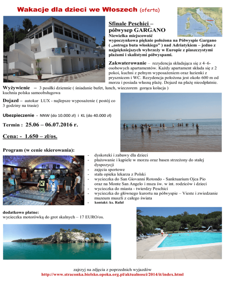 Wakacje dla dzieci we Włoszech (oferta) Sfinale Peschici – półwysep GARGANO Niewielka miejscowość wypoczynkowa pięknie położona na Półwyspie Gargano ( „ostroga buta włoskiego” ) nad Adriatykiem – jedno z najpiękniejszych wybrzeży w Europie z piaszczystymi plażami i skalistymi półwyspami. Zakwaterowanie – rezydencja składająca się z 4–6osobowych apartamentów. Każdy apartament składa się z 2 pokoi, kuchni z pełnym wyposażeniem oraz łazienki z prysznicem i WC. Rezydencja położona jest około 600 m od morza i posiada własną plażę. Dojazd na plażę nieodpłatnie. Wyżywienie – 3 posiłki dziennie ( śniadanie bufet, lunch, wieczorem gorąca kolacja ) kuchnia polska samoobsługowa Dojazd – autokar LUX - najlepsze wyposażenie ( postój co 3 godziny na trasie) Ubezpieczenie - NNW (do 10.000 zł) i KL (do 40.000 zł) Termin : 25.06 – 06.07.2016 r. Cena: - 1.650 – zł/os. Program (w cenie skierowania): - dyskoteki i zabawy dla dzieci plażowanie i kąpiele w morzu oraz basen strzeżony do stałej dyspozycji zajęcia sportowe stała opieka lekarza z Polski wycieczka do San Giovanni Rotondo - Sanktuarium Ojca Pio oraz na Monte San Angelo i msza św. w int. rodziców i dzieci wycieczka do miasta - twierdzy Peschici wycieczka do głównego kurortu na półwyspie – Vieste i zwiedzanie muzeum muszli z całego świata kontakt: ks. Rafał dodatkowo płatne: wycieczka motorówką do grot skalnych – 17 EURO/os. zajrzyj na zdjęcia z poprzednich wyjazdów http://www.straconka.bielsko.opoka.org.pl/aktualnosci/2014/it/index.html