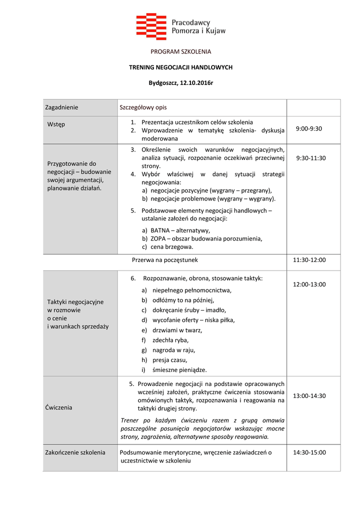PROGRAM SZKOLENIA TRENING NEGOCJACJI HANDLOWYCH Bydgoszcz, 12.10.2016r Zagadnienie Wstęp Przygotowanie do negocjacji – budowanie swojej argumentacji, planowanie działań. Szczegółowy opis 1. Prezentacja uczestnikom celów szkolenia 2. Wprowadzenie w tematykę szkolenia- dyskusja moderowana 3. Określenie swoich warunków negocjacyjnych, analiza sytuacji, rozpoznanie oczekiwań przeciwnej strony. 4. Wybór właściwej w danej sytuacji strategii negocjowania: a) negocjacje pozycyjne (wygrany – przegrany), b) negocjacje problemowe (wygrany – wygrany). 9:00-9:30 9:30-11:30 5. Podstawowe elementy negocjacji handlowych – ustalanie założeń do negocjacji: a) BATNA – alternatywy, b) ZOPA – obszar budowania porozumienia, c) cena brzegowa. Przerwa na poczęstunek 6. Taktyki negocjacyjne w rozmowie o cenie i warunkach sprzedaży Ćwiczenia Rozpoznawanie, obrona, stosowanie taktyk: a) b) c) d) e) f) g) h) i) niepełnego pełnomocnictwa, odłóżmy to na później, dokręcanie śruby – imadło, wycofanie oferty – niska piłka, drzwiami w twarz, zdechła ryba, nagroda w raju, presja czasu, śmieszne pieniądze. 5. Prowadzenie negocjacji na podstawie opracowanych wcześniej założeń, praktyczne ćwiczenia stosowania omówionych taktyk, rozpoznawania i reagowania na taktyki drugiej strony. 11:30-12:00 12:00-13:00 13:00-14:30 Trener po każdym ćwiczeniu razem z grupą omawia poszczególne posunięcia negocjatorów wskazując mocne strony, zagrożenia, alternatywne sposoby reagowania. Zakończenie szkolenia Podsumowanie merytoryczne, wręczenie zaświadczeń o uczestnictwie w szkoleniu 14:30-15:00