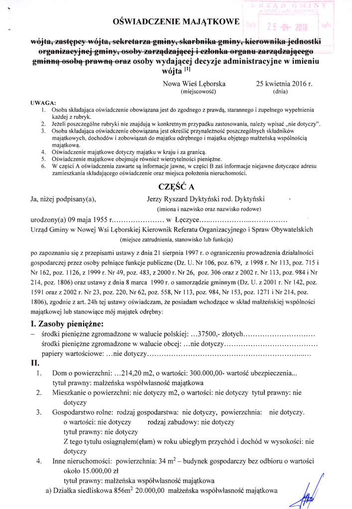 OŚWIADCZENIE MAJĄTKOWE wójta, zastępcy wójta, sekretarza gminy, skarbnika gminy, kierownika jednostki organizacyjnej gminy, osoby-zarządzającej i eztoaka organa zarządzającego gminną osobą prawną oraz osoby wydającej decyzje administracyjne w imieniu wójta 1,1 Nowa Wieś Lęborska 25 kwietnia 2016 r. (miejscowość) (dnia) UWAGA: 1. Osoba składająca oświadczenie obowiązana jest do zgodnego z prawdą, starannego i zupełnego wypełnienia każdej z rubryk. 2. Jeżeli poszczególne rubryki nie znajdują w konkretnym przypadku zastosowania, należy wpisać „nie dotyczy”. 3. Osoba składająca oświadczenie obowiązana jest określić przynależność poszczególnych składników majątkowych, dochodów i zobowiązań do majątku odrębnego i majątku objętego małżeńską wspólnością majątkową. 4. Oświadczenie majątkowe dotyczy majątku w kraju i za granicą. 5. Oświadczenie majątkowe obejmuje również wierzytelności pieniężne. 6. W części A oświadczenia zawarte są informacje jawne, w części B zaś informacje niejawne dotyczące adresu zamieszkania składającego oświadczenie oraz miejsca położenia nieruchomości. CZĘŚĆ A Ja, niżej podpisany(a), Jerzy Ryszard Dyktyński rod. Dyktyński (imiona i nazwisko oraz nazwisko rodowe) urodzony(a) 09 maja 1955 r.............................. w Łęczyce..................................................... Urząd Gminy w Nowej Wsi Lęborskiej Kierownik Referatu Organizacyjnego i Spraw Obywatelskich (miejsce zatrudnienia, stanowisko lub funkcja) po zapoznaniu się z przepisami ustawy z dnia 21 sierpnia 1997 r. o ograniczeniu prowadzenia działalności gospodarczej przez osoby pełniące funkcje publiczne (Dz. U. Nr 106, poz. 679, z 1998 r. Nr 113, poz. 715 i Nr 162, poz. 1126, z 1999 r. Nr 49, poz. 483, z 2000 r. Nr 26, poz. 306 oraz z 2002 r. Nr 113, poz. 984 i Nr 214, poz. 1806) oraz ustawy z dnia 8 marca 1990 r. o samorządzie gminnym (Dz. U. z 2001 r. Nr 142, poz. 1591 oraz z 2002 r. Nr 23, poz. 220, Nr 62, poz. 558, Nr 113, poz. 984, Nr 153, poz. 1271 i Nr 214, poz. 1806), zgodnie z art. 24h tej ustawy oświadczam, że posiadam wchodzące w skład małżeńskiej wspólności majątkowej lub stanowiące mój majątek odrębny: I. Zasoby pieniężne: - środki pieniężne zgromadzone w walucie polskiej: .. .37500,- złotych.......................................... środki pieniężne zgromadzone w walucie obcej: ...nie dotyczy...................................................... papiery wartościowe: ...nie dotyczy................................................................................................ II. 1. Dom o powierzchni: ...214,20 m2, o wartości: 300.000,00- wartość ubezpieczenia... tytuł prawny: małżeńska współwłasność majątkowa 2. Mieszkanie o powierzchni: nie dotyczy m2, o wartości: nie dotyczy tytuł prawny: nie dotyczy 3. Gospodarstwo rolne: rodzaj gospodarstwa: nie dotyczy, powierzchnia: nie dotyczy. o wartości: nie dotyczy rodzaj zabudowy: nie dotyczy tytuł prawny: nie dotyczy Z tego tytułu osiągnąłem(ęłam) w roku ubiegłym przychód i dochód w wysokości: nie dotyczy 4. Inne nieruchomości: powierzchnia: 34 m2 - budynek gospodarczy bez odbioru o wartości około 15.000,00 zł tytuł prawny: małżeńska współwłasność majątkowa a) Działka siedliskowa 856m2 20.000,00 małżeńska współwłasność majątkowa III. Posiadam udziały w spółkach handlowych-należy podać liczbę i emitenta udziałów: nie dotyczy udziały te stanowią pakiet większy niż 10% udziałów w spółce: nie dotyczy Z tego tytułu osiągnąłem(ęłam) w roku ubiegłym dochód w wysokości: nie dotyczy IV. Posiadam akcje w spółkach handlowych - należy podać liczbę i emitenta akcji: nie dotyczy akcje te stanowią pakiet większy niż 10% akcji w spółce: nie dotyczy............................................ Z tego tytułu osiągnąłem(ęłam) w roku ubiegłym dochód w wysokości: nie dotyczy V. Nabyłem(am) (nabył mój małżonek, z wyłączeniem mienia przynależnego do jego majątku odrębnego) od Skarbu Państwa, innej państwowej osoby prawnej, jednostek samorządu terytorialnego, ich związków lub od komunalnej osoby prawnej następujące mienie, które podlegało zbyciu w drodze przetargu - należy podać opis mienia i datę nabycia, od k o g o :......... ...nie dotyczy............................................................................................................................................. VI. 1. Prowadzę działalność gospodarczą*21 (należy podać formę prawną i przedmiot działalności):......... ...nie dotyczy............................................................................................................................................. - osobiście nie dotyczy.................................................................................................. - wspólnie z innymi osobam i.. .nie dotyczy............................................................................ Z tego tytułu osiągnąłem(ęłam) w roku ubiegłym przychód i dochód w w ysokości:................... .. ....... nie dotyczy.......................................................................................... 2. Zarządzam działalnością gospodarczą lub jestem przedstawicielem, pełnomocnikiem takiej działalności (należy podać formę prawną i przedmiot działalności): osobiście...nie dotyczy.................................................................................................... wspólnie z innymi osobami ...nie dotyczy............................................................... Z tego tytułu osiągnąłem(ęłam) w roku ubiegłym dochód w wysokości: ...nie dotyczy VII. 1. W spółkach handlowych (nazwa, siedziba spółki): ... nie d o ty c z y ................................... - jestem członkiem zarządu (od kiedy):........nie d o ty c z y ........................................................... - jes