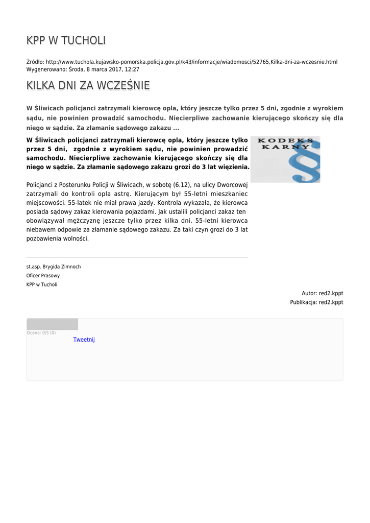 KPP W TUCHOLI Źródło: http://www.tuchola.kujawsko-pomorska.policja.gov.pl/k43/informacje/wiadomosci/52765,Kilka-dni-za-wczesnie.html Wygenerowano: Środa, 8 marca 2017, 12:27 KILKA DNI ZA WCZEŚNIE W Śliwicach policjanci zatrzymali kierowcę opla, który jeszcze tylko przez 5 dni, zgodnie z wyrokiem sądu, nie powinien prowadzić samochodu. Niecierpliwe zachowanie kierującego skończy się dla niego w sądzie. Za złamanie sądowego zakazu ... W Śliwicach policjanci zatrzymali kierowcę opla, który jeszcze tylko przez 5 dni, zgodnie z wyrokiem sądu, nie powinien prowadzić samochodu. Niecierpliwe zachowanie kierującego skończy się dla niego w sądzie. Za złamanie sądowego zakazu grozi do 3 lat więzienia. Policjanci z Posterunku Policji w Śliwicach, w sobotę (6.12), na ulicy Dworcowej zatrzymali do kontroli opla astrę. Kierującym był 55-letni mieszkaniec miejscowości. 55-latek nie miał prawa jazdy. Kontrola wykazała, że kierowca posiada sądowy zakaz kierowania pojazdami. Jak ustalili policjanci zakaz ten obowiązywał mężczyznę jeszcze tylko przez kilka dni. 55-letni kierowca niebawem odpowie za złamanie sądowego zakazu. Za taki czyn grozi do 3 lat pozbawienia wolności. st.asp. Brygida Zimnoch Oficer Prasowy KPP w Tucholi Autor: red2.kppt Publikacja: red2.kppt Ocena: 0/5 (0) Tweetnij