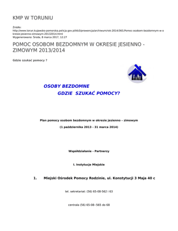 KMP W TORUNIU Źródło: http://www.torun.kujawsko-pomorska.policja.gov.pl/kb3/prewencja/archiwum/rok-2014/363,Pomoc-osobom-bezdomnym-w-o kresie-jesienno-zimowym-20132014.html Wygenerowano: Środa, 8 marca 2017, 12:27 POMOC OSOBOM BEZDOMNYM W OKRESIE JESIENNO ZIMOWYM 2013/2014 Gdzie szukać pomocy ? OSOBY BEZDOMNE GDZIE SZUKAĆ POMOCY? Plan pomocy osobom bezdomnym w okresie jesienno – zimowym (1 października 2013 - 31 marca 2014) Współdziałanie - Partnerzy I. Instytucje Miejskie 1. Miejski Ośrodek Pomocy Rodzinie, ul. Konstytucji 3 Maja 40 c tel. sekretariat: (56) 65-08-562 i 63 centrala (56) 65-08--565 do 68 fax: (56) 648-64-47 http://www.mopr.torun.pl internetowe centrum pomocy [email protected] telefon zaufania- (56)622-00-00 (od poniedziałku do piątku 17-21) 2. Miejskie Schronisko dla Bezdomnych Mężczyzn, ul. Skłodowskiej- Curie 82-84, [email protected] 3. Straż Miejska, ul. Grudziądzka 157, tel. (56)622-58-77, tel. bezpłatny 986 4. Komenda Miejska Policji ,ul. Grudziądzka 17, tel. (56)641-28-11, (56)641-23-80, 997 5. Komisariat Policji – Toruń Śródmieście ul. PCK 2 tel. (56)641-28-11, (56)641-23-83 6. Komisariat „Toruń Podgórz” ul. Poznańska 129, tel. (56)641-24-70, 7. Komisariat „Toruń Rubinkowo” Dziewulskiego 1, tel. (56)641-25-70 8. Urząd Miasta Torunia, Wydział Zdrowia i Polityki Społecznej, ul. Legionów 220, tel. (56)623-71-05, 12. Urząd Miasta Torunia, Wydział Ochrony Ludności, ul. Legionów 70/76, tel. (56)6119310 II Organizacje pozarządowe 1. Polski Czerwony Krzyż Kujawsko- Pomorski Oddział Okręgowy w Bydgoszczy - Ośrodek PCK w Toruniu ul. Szczecińska 13, tel. (56)657-22-52, [email protected], 2. Polski Komitet Pomocy Społecznej ul. Fałata 35/37, tel. (56)622-48-98, [email protected], 3.Toruńskie Centrum ,,Caritas”, ul. Szosa Bydgoska 1, tel. (56)654-05-43, [email protected], 4.Centrum Pielęgnacji ,,Caritas”, ul. Wyszyńskiego 7/9, tel. (56)659-03-97, cpielę[email protected], 5. Toruński Dom dla Osób Bezdomnych i Najuboższych „MONAR- MARKOT” ul. Dybowska 1, tel. (56)651-35-96 tel. Kom. 601796001 lub 501738193 [email protected] Radziwon Piotr Schronienie 1. Miejskie Schronisko dla Bezdomnych Mężczyzn ul. Skłodowskiej- Curie 82-84,, tel. (56)623-33-36, czynne 24h [email protected] 2. Noclegownia przy Miejskim Schronisku dla Bezdomnych Mężczyzn w Toruniu. tel. (56)623-28-54 3. Toruński Dom dla Osób Bezdomnych i Najuboższych „MONAR- MARKOT” ul. Dybowska 1, tel. (56)651-35-96 tel. Kom. 601796001 lub 501738193 4. Toruńskie Centrum ,,Caritas” Noclegownia dla bezdomnych kobiet ul. Szosa Bydgoska 1, tel. (56)654-05-43 * MOPR w ramach realizacji programu na rzecz ofiar przemocy (kobiety z dziećmi) ma do dyspozycji: - 3 pokoje w T.C. ,,Caritas” - 14 miejsc - kierowanie i finansowanie pomocy przez MOPR na podstawie decyzji administracyjnej - wsparcie specjalistyczne (psychologiczne, pedagogiczne, prawne) 5. Dział Interwencji Kryzysowej i Poradnictwa Specjalistycznego ul. Skłodowskiej- Curie 82-84 tel. (56) 650-85-64 lub (56) 654-00-30 miejsca dla bezdomnych kobiet z dziećmi w tym miejsca dla ofiar przemocy domowej Koordynator: Miejski Ośrodek Pomocy Rodzinie ul. Konstytucji 3 Maja 40c. Pracownik socjalny ds. bezdomności ul. Skłodowskiej- Curie 82-84, budynek noclegowni tel. kom. 517 – 583 – 507 Niezbędne ubranie Na podstawie uzgodnień pomiędzy Miejskim Ośrodkiem Pomocy Rodzinie, a organizacjami pozarządowymi pomoc charytatywna w postaci wydawania odzieży realizują: · Kujawsko- Pomorski Oddział Okręgowy Polskiego Czerwonego Krzyża w Bydgoszcz - Ośrodek PCK w Toruniu ul. Szczecińska 13, tel. (56)657-22-52 · Polski Komitet Pomocy Społecznej, ul. Fałata 35/37, tel (56)622-48-98 · Toruńskie Centrum ,,Caritas”, ul. Szosa Bydgoska 1, tel. (56)654-05-43 · Centrum Pielęgnacji ,,Caritas”, ul. Wyszyńskiego 7/9, tel. (56)659-03-97 · Toruński Dom dla Osób Bezdomnych i Najuboższych „MONAR- MARKOT” ul. Dybowska 1, tel. tel. (56)651-35-96 tel. Kom. 601796001 lub 501738193 · Miejski Ośrodek Pomocy Rodzinie ul. Konstytucji 3 Maja 40c, tel. (56)650-85-65 - pomoc udzielana na podstawie decyzji administracyjnej. Gorący posiłek 1. Miejski Ośrodek Pomocy Rodzinie w Toruniu - „bony obiadowe” finansowane i wydawane przez Miejski Ośrodek Pomocy Rodzinie, ul. Konstytucji 3 Maja 40c, tel. (56)650-85-65 na podstawie decyzji administracyjnej. - miejsce wydawania posiłków: Disco – Bar, ul. Kujawska 18 2. Miejskie Schronisko dla Bezdomnych Mężczyzn, ul. Skłodowskiej- Curie 82-84, tel. (56)623-33-36- 1 gorący posiłek dziennie wydawany na podstawie decyzji administracyjnej. Pomoc charytatywna: · Toruńskie Centrum ,,Caritas”, ul. Szosa Bydgoska 1, tel. (56)654-05-43 - ciepły posiłek oraz łaźnia, czysta odzież: wtorek i piątek 8.00-10.00, środki czystości, konsultacja pielęgniarska: poniedziałek- piątek godz.12.00-14.00; · Centrum Pielęgnacji ,,Caritas”, ul. Wyszyńskiego 7/9, tel. (56)659-03-97 - gorący posiłek, żywność oraz czysta odzież, pomoc higieniczna, pomoc pielęgniarska: poniedziałek- piątek 8.00-10.00 i 16.00-18.00 · Toruński Dom dla Osób Bezdomnych i Najuboższych „MONAR- MARKOT” ul. Dybowska 1, tel. (56)651-35-96 - gorący posiłek, suchy prowiant oraz czysta odzież, środki czystości · Główny realizator, dyżur 24h- Miejskiego Schroniska dla Bezdomnych Mężczyzn, ul. Skłodowskiej – Curie 82-84, Autor: Publikacja: Ocena: 0/5 (0) Tweetnij