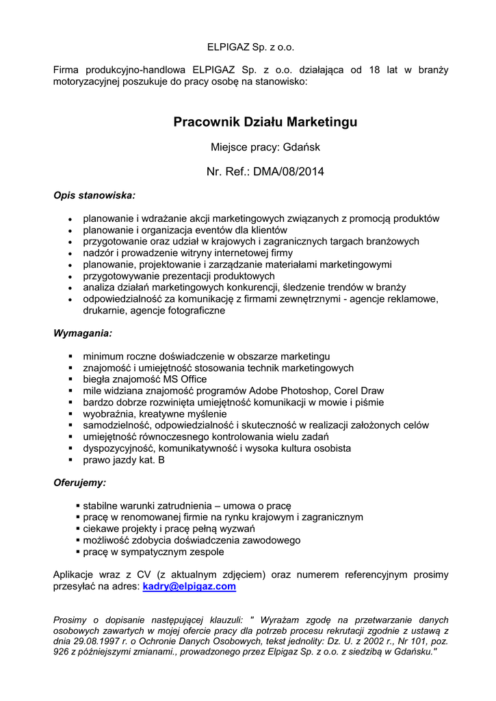 ELPIGAZ Sp. z o.o. Firma produkcyjno-handlowa ELPIGAZ Sp. z o.o. działająca od 18 lat w branży motoryzacyjnej poszukuje do pracy osobę na stanowisko: Pracownik Działu Marketingu Miejsce pracy: Gdańsk Nr. Ref.: DMA/08/2014 Opis stanowiska: planowanie i wdrażanie akcji marketingowych związanych z promocją produktów planowanie i organizacja eventów dla klientów przygotowanie oraz udział w krajowych i zagranicznych targach branżowych nadzór i prowadzenie witryny internetowej firmy planowanie, projektowanie i zarządzanie materiałami marketingowymi przygotowywanie prezentacji produktowych analiza działań marketingowych konkurencji, śledzenie trendów w branży odpowiedzialność za komunikację z firmami zewnętrznymi - agencje reklamowe, drukarnie, agencje fotograficzne Wymagania: minimum roczne doświadczenie w obszarze marketingu znajomość i umiejętność stosowania technik marketingowych biegła znajomość MS Office mile widziana znajomość programów Adobe Photoshop, Corel Draw bardzo dobrze rozwinięta umiejętność komunikacji w mowie i piśmie wyobraźnia, kreatywne myślenie samodzielność, odpowiedzialność i skuteczność w realizacji założonych celów umiejętność równoczesnego kontrolowania wielu zadań dyspozycyjność, komunikatywność i wysoka kultura osobista prawo jazdy kat. B Oferujemy: stabilne warunki zatrudnienia – umowa o pracę pracę w renomowanej firmie na rynku krajowym i zagranicznym ciekawe projekty i pracę pełną wyzwań możliwość zdobycia doświadczenia zawodowego pracę w sympatycznym zespole Aplikacje wraz z CV (z aktualnym zdjęciem) oraz numerem referencyjnym prosimy przesyłać na adres: [email protected] Prosimy o dopisanie następującej klauzuli: " Wyrażam zgodę na przetwarzanie danych osobowych zawartych w mojej ofercie pracy dla potrzeb procesu rekrutacji zgodnie z ustawą z dnia 29.08.1997 r. o Ochronie Danych Osobowych, tekst jednolity: Dz. U. z 2002 r., Nr 101, poz. 926 z późniejszymi zmianami., prowadzonego przez Elpigaz Sp. z o.o. z siedzibą w Gdańsku."
