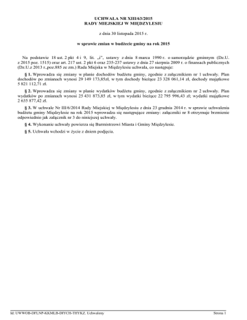 UCHWAŁA NR XIII/63/2015 RADY MIEJSKIEJ W MIĘDZYLESIU z dnia 30 listopada 2015 r. w sprawie zmian w budżecie gminy na rok 2015 Na podstawie 18 ust. 2 pkt 4 i 9, lit. „i”, ustawy z dnia 8 marca 1990 r. o samorządzie gminnym (Dz.U. z 2015 poz. 1515) oraz art. 217 ust. 2 pkt 6 oraz 235-237 ustawy z dnia 27 sierpnia 2009 r. o finansach publicznych (Dz.U.z 2013 r.,poz.885 ze zm.) Rada Miejska w Międzylesiu uchwala, co następuje: § 1. Wprowadza się zmiany w planie dochodów budżetu gminy, zgodnie z załącznikiem nr 1 uchwały. Plan dochodów po zmianach wynosi 29 149 173,85zł, w tym dochody bieżące 23 328 061,14 zł, dochody majątkowe 5 821 112,71 zł. § 2. Wprowadza się zmiany w planie wydatków budżetu gminy, zgodnie z załącznikiem nr 2 uchwały. Plan wydatków po zmianach wynosi 25 431 873,85 zł, w tym wydatki bieżące 22 795 996,43 zł; wydatki majątkowe 2 635 877,42 zł. § 3. W uchwale Nr III/6/2014 Rady Miejskiej w Międzylesiu z dnia 23 grudnia 2014 r. w sprawie uchwalenia budżetu gminy Międzylesie na rok 2015 wprowadza się następujące zmiany: załączniki nr 8 otrzymuje brzmienie odpowiednio jak załącznik nr 3 do niniejszej uchwały. § 4. Wykonanie uchwały powierza się Burmistrzowi Miasta i Gminy Międzylesie. § 5. Uchwała wchodzi w życie z dniem podjęcia. Id: UWWOB-DFLNP-KKMLB-DIYCH-THYKZ. Uchwalony Strona 1 Uzasadnienie 1) Zmian w budżecie w zakresie dochodów dokonano z tytułu: - dział 600 rozdział 60016 – zwiększenia o kwotę 2 259,45 zł z tytułu odszkodowania od ubezpieczyciela za uszkodzoną barierkę na moście przy drodze gminnej w Jaworku, - dział 754 rozdział 75412 – zwiększenia o kwotę 3 000 zł z tytułu otrzymanej darowizny na zakup i montaż układów nowego selektywnego alarmowania jednostki, - dział 758 rozdział 75801 – zwiększenia o kwotę 40 761 zł części oświatowej subwencji ogólnej z tytułu rezerwy na remont dachu na budynku Zespołu Szkół w Międzylesiu uszkodzonego podczas nawałnicy w dniu 08 lipca 2015, - dział 801 rozdział 80195 zwiększenia o kwotę 2 880,93 zł z tytułu odszkodowania od ubezpieczyciela za uszkodzony dach na budynku Zespołu Szkół w Międzylesiu podczas nawałnicy w dniu 08 lipca 2015, - dział 921 rozdział 92105 – zwiększenia o kwotę 500 zł z tytułu otrzymanej darowizny od Nadleśnictwa w Międzylesiu dla sołectwa Domaszków na dofinansowanie zakupu paczek mikołajowych. 2) Zmian w budżecie w zakresie wydatków dokonano:- dział 600 rozdział 60016 – zwiększenia o kwotę 2 259,45 zł na remont barierki na moście przy drodze gminnej w Jaworku, - dział 750 rozdział 75023 – przeniesienia kwoty 12 000 zł do rozdziału 92109 - z tytułu zwiększenia dotacji podmiotowej dla MGOK Międzylesie, dział 754 rozdział 75412 – zwiększenia o kwotę 3 000 zł na zakupu montaż układów nowego selektywnego alarmowania jednostki, - dział 801 rozdział 80195 - zwiększenia o kwotę 84 404,93 na remont dachu na budynku Zespołu Szkół w Międzylesiu ( w tym przesunięcie kwoty 40 40 763 z środków zabezpieczonych w planie Urzędu Miasta i Gminy na bieżące remonty szkół), - dział 921 rozdział 92105 – zwiększenia o kwotę 500 zł z tytułu dofinansowania paczek mikołajowych dla sołectwa Domaszków 3) Zmiany w załączniku nr 3 – dotacje udzielone z budżetu gminy w 2015 roku dla jednostek sektora finansów publicznych: - zwiększono dotację podmiotową dla Miejsko-Gminnego Ośrodka Kultury w Międzylesiu o kwotę 12 000 zł, wartość dotacji po zmianie wynosi 378 546 zł. Id: UWWOB-DFLNP-KKMLB-DIYCH-THYKZ. Uchwalony Strona 1 Zmiany w planie dochodów budżetu gminy na 2015 rok. Załącznik Nr 1 do Uchwały Nr XIII/63/2015Rady Miejskiej w Międzylesiu z dnia 30.11.2015 r. Dział Rozdział Paragraf 600 Treść Przed zmianą Transport i łączność 60095 0970 754 2 259,45 1 258 685,13 Pozostała działalność 5 195,68 2 259,45 7 455,13 Wpływy z różnych dochodów 5 195,68 2 259,45 7 455,13 81 159,16 3 000,00 84 159,16 80 159,16 3 000,00 83 159,16 6 600,00 3 000,00 9 600,00 9 411 953,11 40 761,00 9 452 714,11 4 652 897,00 40 761,00 4 693 658,00 4 652 897,00 40 761,00 4 693 658,00 307 910,72 2 880,93 310 791,65 3 912,00 2 880,93 6 792,93 0,00 2 880,93 2 880,93 573 845,00 500,00 574 345,00 11 302,00 500,00 11 802,00 4 300,00 500,00 4 800,00 29 099 772,47 49 401,38 29 149 173,85 publiczne i ochrona przeciwpożarowa Ochotnicze straże pożarne 0960 758 Otrzymane spadki, zapisy i darowizny w postaci pieniężnej Różne rozliczenia 75801 2920 801 Część oświatowa subwencji ogólnej dla jednostek samorządu terytorialnego Subwencje ogólne z budżetu państwa Oświata i wychowanie 80195 Pozostała działalność 0970 921 Wpływy z różnych dochodów Kultura i ochrona dziedzictwa narodowego 92105 Pozostałe zadania w zakresie kultury 0960 Po zmianie 1 256 425,68 Bezpieczeństwo 75412 Zmiana Otrzymane spadki, zapisy i darowizny w postaci pieniężnej Razem: Id: UWWOB-DFLNP-KKMLB-DIYCH-THYKZ. Uchwalony Strona 1 Zmiany w planie wydatków budżetu gminy na 2015 rok. Załącznik Nr 2 do Uchwały Nr XIII/63/2015Rady Miejskiej w Międzylesiu z dnia 30.11.2015 r. Dział Rozdział Paragraf 600 Treść Przed zmianą Transport i łączność 60016 750 75023 4270 754 75412 2 259,45 2 446 965,53 696 602,38 2 259,45 698 861,83 Zakup usług remontowych 80 893,35 2 259,45 83 152,80 Administracja publiczna 2 849 852,72 - 12 000,00 2 837 852,72 Urzędy gmin (miast i miast na prawach powiatu) 2 568 518,72 - 12 000,00 2 556 518,72 Zakup usług remontowych 111 696,35 - 12 000,00 99 696,35 Bezpieczeństwo 463 337,93 3 000,00 466 337,93 417 733,93 3 000,00 420 733,93 58 610,00 3 000,00 61 610,00 Oświata i wychowanie 7 615 432,72 43 641,93 7 659 074,65 Szkoły podstawowe 3 361 752,15 - 20 381,00 3 341 371,15 28 248,00 - 20 381,00 7 867,00 1 986 422,57 - 20 382,00 1 966 040,57 56 800,00 - 20 382,00 36 418,00 120 285,00 84 404,93 204 689,93 0,00 84 404,93 84 404,93 1 472 151,31 