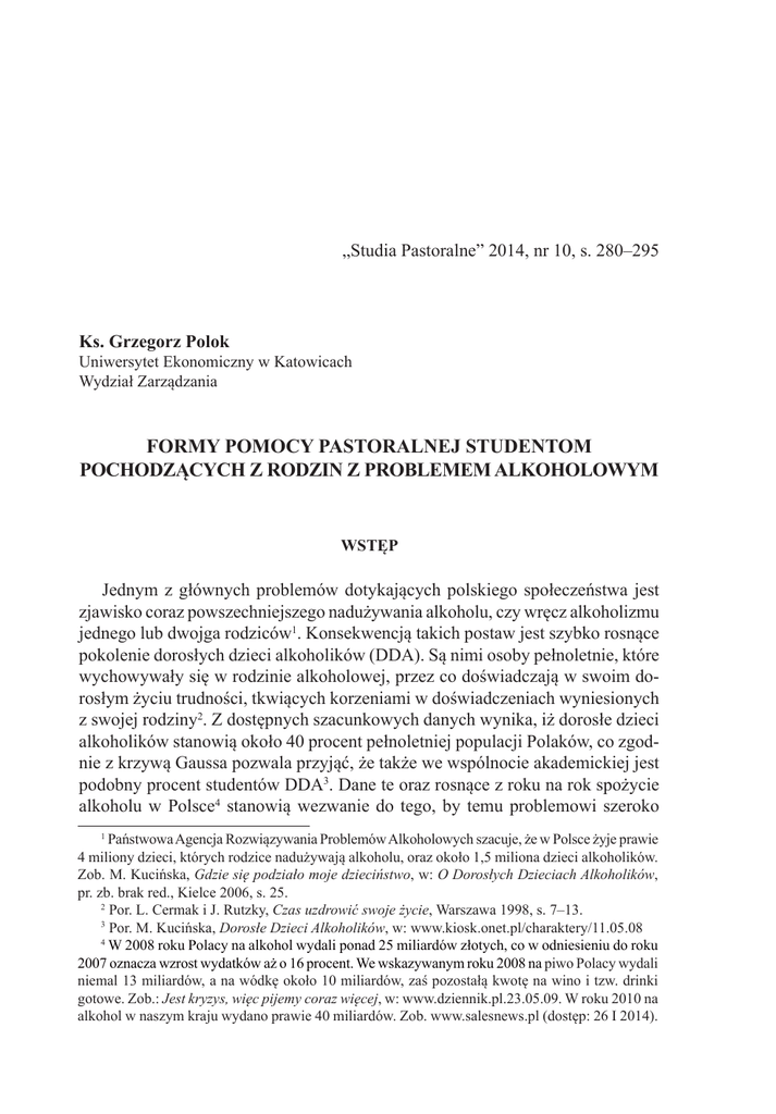 „Studia Pastoralne” 2014, nr 10, s. 280–295 Ks. Grzegorz Polok Uniwersytet Ekonomiczny w Katowicach Wydział Zarządzania FORMY POMOCY PASTORALNEJ STUDENTOM POCHODZĄCYCH Z RODZIN Z PROBLEMEM ALKOHOLOWYM WSTĘP Jednym z głównych problemów dotykających polskiego społeczeństwa jest zjawisko coraz powszechniejszego nadużywania alkoholu, czy wręcz alkoholizmu jednego lub dwojga rodziców1. Konsekwencją takich postaw jest szybko rosnące pokolenie dorosłych dzieci alkoholików (DDA). Są nimi osoby pełnoletnie, które wychowywały się w rodzinie alkoholowej, przez co doświadczają w swoim dorosłym życiu trudności, tkwiących korzeniami w doświadczeniach wyniesionych z swojej rodziny2. Z dostępnych szacunkowych danych wynika, iż dorosłe dzieci alkoholików stanowią około 40 procent pełnoletniej populacji Polaków, co zgodnie z krzywą Gaussa pozwala przyjąć, że także we wspólnocie akademickiej jest podobny procent studentów DDA3. Dane te oraz rosnące z roku na rok spożycie alkoholu w Polsce4 stanowią wezwanie do tego, by temu problemowi szeroko 1 Państwowa Agencja Rozwiązywania Problemów Alkoholowych szacuje, że w Polsce żyje prawie 4 miliony dzieci, których rodzice nadużywają alkoholu, oraz około 1,5 miliona dzieci alkoholików. Zob. M. Kucińska, Gdzie się podziało moje dzieciństwo, w: O Dorosłych Dzieciach Alkoholików, pr. zb. brak red., Kielce 2006, s. 25. 2 Por. L. Cermak i J. Rutzky, Czas uzdrowić swoje życie, Warszawa 1998, s. 7–13. 3 Por. M. Kucińska, Dorosłe Dzieci Alkoholików, w: www.kiosk.onet.pl/charaktery/11.05.08 4 W 2008 roku Polacy na alkohol wydali ponad 25 miliardów złotych, co w odniesieniu do roku 2007 oznacza wzrost wydatków aż o 16 procent. We wskazywanym roku 2008 na piwo Polacy wydali niemal 13 miliardów, a na wódkę około 10 miliardów, zaś pozostałą kwotę na wino i tzw. drinki gotowe. Zob.: Jest kryzys, więc pijemy coraz więcej, w: www.dziennik.pl.23.05.09. W roku 2010 na alkohol w naszym kraju wydano prawie 40 miliardów. Zob. www.salesnews.pl (dostęp: 26 I 2014). FORMY POMOCY PASTORALNEJ STUDENTOM 281 rozumiane środowisko akademickie5 (uczelnie, instytuty badawcze, różne organizacje studenckie, stowarzyszenia uniwersyteckie), a szczególnie wspólnoty duszpasterstwa akademickiego, poświęciło znaczną uwagę zarówno na płaszczyźnie teoretycznej, jak i praktycznej6. Celem bowiem działań duszpasterstwa akademickiego (DA) jest pośrednictwo zbawcze Kościoła w budowaniu wspólnoty w Chrystusie. W przypadku przestrzeni uniwersyteckiej chodzi o budowanie tej wspólnoty w danym środowisku akademickim. Urzeczywistnianie kościelnej komunii w środowisku akademickim winno dokonywać się poprzez liturgię, martyrię (słowo i życie chrześcijańskie) oraz diakonię, będącą wyrazem miłości. Z perspektywy pomocy studentom DDA jako szczególnie ważna jawi się funkcja diakonii. Rozumie się ją w dwóch aspektach: jako posługa osobom wymagającym szczególnej troski, a także jako władza, która ma charakter wyraźnie służebny. Diakonia pojmowana jako posługa ludziom potrzebującym pomocy w środowisku akademickim oznacza po pierwsze miłość obecną u podstaw wszelkich działań, przezwyciężającą anonimowość, obcość i zagubienie w świecie uniwersyteckim, po drugie zaś – caritas realizującą się w społecznym działaniu całej wspólnoty DA na rzecz potrzebujących. Wymienia się tutaj najczęściej zagadnienie troski o małżeństwa, zwłaszcza studenckie, osoby doświadczone przez los, w tym studentów DDA7. Co więcej, zwraca się uwagę na konieczność podejmowania działań, mających na celu pozytywne odbudowy wanie środowiska poprzez tworzenie zdrowych grup, które inspirować będą społeczność uniwersytecką i proponować nowe wzorce zachowań. Czas studiów jest bowiem szczególnym okresem w cyklu życiowym człowieka. Zwłaszcza z punktu widzenia wychowania i edukacji to najbardziej wartościowy i wymagający okres dla osób studiujących, ponieważ można przyjąć, że jest to czas, w którym dochodzi do ciągłej optymalizacji rozwoju osobowości studenta. Osobowości, która w przyszłości zadecyduje o możliwościach realizacji przez niego istotnych zadań religijnych, społecznych, zawodowych, rodzinnych czy obywatelskich. Na tym etapie rozwoju studenta szkoła wyższa, duszpasterstwo akademickie, staje się dla niego przestrzenią życiową o znaczeniu podstawowym, w którym poza wiedzą zawodową kształtuje swoją osobowość, nawyki, postawy, przekonania religijne i wynikające z tego zachowania8. Stąd tak ważne jest zapewnienie studentom wywodzącym się z rodzin z problemem alkoholowym, niosących w związku z tym w sobie określone obciążenia psychiczne, profesjonalnej pomocy, która pozwoli na pełny rozwój osobowości tej grupie żaków. Z przeprowadzonych w grudniu 2002 roku badań na reprezentatywnej, ogólnopolskiej grupie osób powyżej 18. roku życia wynika, że uczelnie wyższe i instytuty akademickie postrzegane są przez respondentów jako te, które najbardziej działają dla dobra społeczeństwa. Zob. Postawy wobec społecznej odpowiedzialności biznesu, w: www.ipsos.pl, s. 8, (dostęp: 13 VI 2009). 6 Więcej na ten temat w: G. Polok, Rozwinąć skrzydła, Katowice 2013. 7 Por. A. Przybecki. Między poczuciem zagrożenia a potrzebą obecności, Poznań 1999, s. 45. 8 Por. I. Kowalewski, Zaburzenia emocjonalne studentów krakowskich uczelni wyższych w aspekcie bezpieczeństwa, w: www.21.edu.pl (dostęp: 10 VII 2009). 5 282 KS. GRZEGORZ POLOK PODSTAWOWE PRZYCZYNY PROBLEMÓW STUDENTÓW DDA Kluczem do odnalezienia głównych przyczyn trudności, jakich doświadczają już w swoim pełnoletnim życiu studenci dorosłe dzieci alkoholików, jest przyjrzenie się okresowi ich dzieciństwa. Przebiegało ono w określonej sytuacji rodzinnej, której skutki w mniejszej lub większej mierze DDA odczuwają przez całe swoje życie