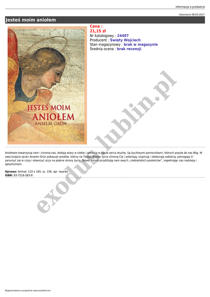 Informacje o produkcie Utworzono 08-03-2017 Jesteś moim aniołem Cena : 21,15 zł .lu bl in .p l Nr katalogowy : 24407 Producent : Święty Wojciech Stan magazynowy : brak w magazynie Średnia ocena : brak recenzji od us Aniołowie towarzyszą nam i chronią nas, dodają wiary w siebie i wlewają w nasze serca otuchę. Są życzliwymi pomocnikami, których posyła do nas Bóg. W swej książce ojciec Anselm Grün pokazuje aniołów, którzy na Twojej drodze życia chronią Cię i osłaniają, inspirują i obdarzają radością, pomagają Ci zanurzyć się w ciszy i otworzyć oczy na piękne strony życia. Słowa autora przybliżają nam owych „niebiańskich posłańców”, napełniając nas nadzieją i optymizmem. ex Oprawa: format: 110 x 165, ss. 156, opr. twarda ISBN: 83-7516-583-8 Wygenerowano w programie www.oscGold.com