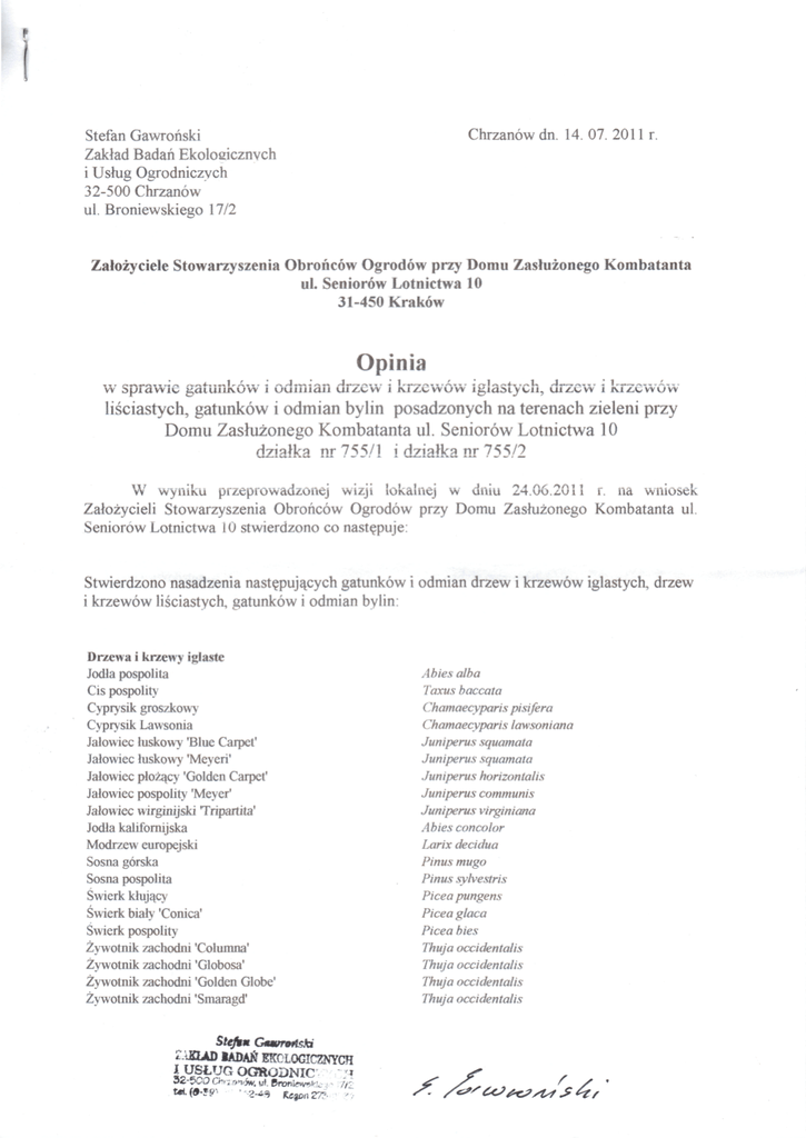 Stefan Gawroński Zakład Badań Ekolosicznvch i Usług Ogrodniczych 32-500 Chrzanów ul. Broniewskiego 17/2 Chrzanów dn. 14. 07. 2011 r. Założyciele Stowarzyszenia Obrońców Ogrodów przy Domu Zasłużonego Kombatanta ul. Seniorów Lotnictwa 10 31-450 Kraków Opinia w sprawie gatunków i odmian drzew i krzewów iglastych, drzew i krzewów liściastych, gatunków i odmian bylin posadzonych na terenach zieleni przy Domu Zasłużonego Kombatanta ul. Seniorów Lotnictwa 10 działka nr 75571 i działka nr 755/2 W wyniku przeprowadzonej wizji lokalnej w dniu 24.06.2011 r. na wniosek Założycieli Stowarzyszenia Obrońców Ogrodów przy Domu Zasłużonego Kombatanta ul. Seniorów Lotnictwa 10 stwierdzono co następuje. Stwierdzono nasadzenia następujących gatunków i odmian drzew i krzewów iglastych, drzew i krzewów liściastych, gatunków i odmian bylin: Drzewa i krzewy iglaste Jodła pospolita Cis pospolity Cyprysik groszkowy Cyprysik Lawsonia Jałowiec łuskowy 'Blue Carpet' Jałowiec łuskowy 'Meyeri' Jałowiec płożący 'Golden Carpet' Jałowiec pospolity 'Meyer' Jałowiec wirgrnijski Tripartita' Jodła kalifornijska Modrzew europejski Sosna górska Sosna pospolita Świerk kłujący Świerk biały 'Conica' Świerk pospolity Żywotnik zachodni 'Columna' Żywotnik zachodni 'Globosa' Żywotnik zachodni 'Gołden Globe' Żywotnik zachodni 'Smaragd' Gmmrtsto JOAD1ADAŃ EKOLOGICZNYCH £&S? OGRODNIC Oć-3^3 Chi, wjw, l. t*. (»-*?• U Abies alba Taxus baccata Chamaecyparis pisifera Chamaecyparis lawsoniana Juniperus sąuamata Juniperus sąuamata Juniperus horizontalis Juniperus communis Juniperus virginiana Abies concolor Larix decidua Pinus mugo Pinus sytvestris Picea pungens Picea glaca Picea bies Thuja occidentalis Thuja occidentalis Thuja occidentalis Thuja occidentalis Drzewa i krzewy liściaste Barwinek pospolity Barwinek pospolity 'Yariegata' Berberys Thunbergia Berberys Thunberga 'Atropurpurea' Bez czarny Brzoza brodawkowata Budleja Dawida Buk pospolity 'Atropunicea' Bukszpan wieczniezielony Dereń biały 'Elegantissima' Dereń biały 'Sibirica' Dziurawiec 'Hidcote' Forsycja pośrednia 'Lynwood1 Forsycja pośrednia 'Spectabilis' Hortensja bukietowa 'Grandiflora1 Hortensja ogrodowa Irga błyszcząca Irga pozioma Jarząb pospolity Jaśminowiec wonny Kalina hordowina Kalina koralowa Kasztanowiec biały Ketmia syberyjska Klon jawor Klon pospolity Krzewuszka 'Bristol Ruby' Lawenda wąskolistna Leszczyna południwa 'Purpurea' Leszczyna pospolita Ligustr pospolity Lilak pospolity liczne odmiany Lipa drobnolistna Migdałek trójklapowy 1 Ognik 'Orange Głów Ognik szkarłatny 'Kuntayi' Ognik szkarłatny 'Red Columri Perukowiec podolski 'Royal Purple' Pecherznica kalinolistna 'Diabolo' Pęcherznica kalinolistna 'Luteus' Pięciornik krzewiasty 'Goldfinger' Pięciornik krzewiasty "Pink Queen' Pigwowiec japoński Sumak octowiec Tawlina jarzebolistna Tawuła japońska 'Anthony Waterer' Tawuła japońska 'Goldflame' Tawuła van Houtte'a Trzmielina Fortune'a Emerald Gaiety' Trzmielina Fortune'a Emerald'n Gold' Tulipanowiec amerykański Wawrzynek wilczełyko 1 Wierzba iwa 'Kilmarnock 1ADAŃ I USŁUG i.jw. ul. t«t. (9-SS Yinca minor Yinca minor Berberis thunbergii Berberis thunbergii Sambucus nigra Betttla pendula Buddleja davidii Fagus silvatica Buxus semprevirens Cornus alba Cornus alba Hypericum Hidcote Forsythia intermedia Forsythia intermedia Hydrangea paniculata Hydrangea macrophylla Cotoneaster lucidus Cotoneaster horizontalis Sorbus aucuparia Philadelphus coronarius Yiburnum lantana Yiburnum opulus Aesculus hippocastanum Hibibscus syriacus Acer pseudoplatanus A cer platanoides Weigela Lavandula angustifolia Corylus maxima • Corylus a\>ellana Ligustrum wlgare Syringa vulgaris Tilia cordata Pritnus triloba Pyracantha Pyracantha coccinea Pyracantha coccinea Cotimis coggygria Physocarpus opulifolius Physocarpus opulifolius Potentilla fruticosa Potentillafruticosa Chaenomeles Japonia Rhus typhina Sorbaria sorbifolia Spiraea Japonia Spiraea Japonia Spiraea vanhouttei Eonymus fortunei Eonymus fortunei Liriodendron tulipifera Daphne mezereum Salix Kaprea Złotlin japoński Zlotlin japoński 'Pleniflora' Zylistek pośredni Żylistek szorstki 'Plena1 Kerria Japonia Kerria Japonia Deutzia hybryda Deutzia scarba Rośliny wrzosowate Azalia liczne odmiany Różanecznik liczne odmiany Wrzos pospolity odmiany Wrzos pospolity 'Silver Knight' Wrzosiec czenvonv odmiany Rododendron Rododendron Calluna vulgaris Calluna \mlgaris Erica carnea Pnącza Bluszcz pospolity Powojnik liczne odmiany Powojnik 'Jackmanii' Powojnik tangucki Winobluszcz pieciolistkowy Hedera helix Clematis hybridus Clematis hybridus Clematis tangutica Parthenocissus quinquefolia Byliny Aster alpejski Aster nowoangielski odmiany Aster nowobelgijski odmiany Bergenia sercowata Bodziszek czerwony Bodziszek kantabryjski Chaber wielkogłówkowy Ciemiernik Czyściec wełnisty Dąbrówka rozłogowa 'Atropurpurea' Dzielżan ogrodowy Dzwonek brzoskwiniolistny Dzwonek brzoskwiniolistny 'Alba' Dzwonek karpacki Dzwonek skupiony Dzwonek szerokolistny Fiołek wonny Funkia odmiany Gęsiówka kaukaska Goździk pierzasty Goździk siny Jeżówka purpurowa Jukka nitkowata Karmnik ościsty Konwalia majowa Kopytnik pospolity Kosaciec ogrodowy Kosaciec syberyjski Krwawnik wiązówkowaty Kuklik szkarłatny Len trwały Liliowiec ogrodowy liczne odmiany Lilia ogrodowa liczne odmiany Łubin trwały Aster alpinus Aster novae-angliae Aster novi-belgii Bergenia cordifolia Geranium sanguineum Geranium x cantabrigiense Centaurea macrocephala Helleborus sp. Stachys byzantina Ajuga reptans Helenium hybridttm Campanula persicifolia Campanula persicifolia Campanula carpatica Campanula glomerata Campanula latifolia Hola orodata Hosta hybrida Arabis caucasiaca Dianthus plumarius Dianthm gratianopolitanus Echinacea purpurea Yucca filamentosa Sagina subulata Convalaria majalis A sarnm europaeum Iris hybryda Iris sibirica A chilleafillipendulina Geum coccineum Linum perenne H