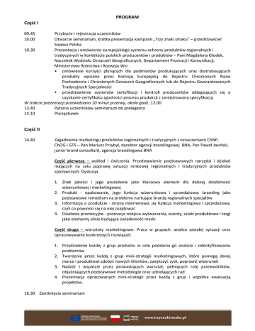 PROGRAM Część I 09.45 10.00 Przybycie i rejestracja uczestników Otwarcie seminarium, krótka prezentacja kampanii „Trzy znaki smaku” – przedstawiciel Sopexa Polska 10.30 Prezentacja i omówienie europejskiego systemu ochrony produktów regionalnych i tradycyjnych w kontekście polskich producentów i produktów – Pani Magdalena Głodek, Naczelnik Wydziału Oznaczeń Geograficznych, Departament Promocji i Komunikacji, Ministerstwo Rolnictwa i Rozwoju Wsi • omówienie korzyści płynących dla podmiotów produkujących oraz dystrybuujących produkty wpisane przez Komisję Europejską do Rejestru Chronionych Nazw Pochodzenia i Chronionych Oznaczeń Geograficznych lub do Rejestru Gwarantowanych Tradycyjnych Specjalności • przedstawienie systemów certyfikacji i kontroli producentów ubiegających się o uzyskanie certyfikatu zgodności procesu produkcji z zarejstrowaną specyfikacją W trakcie prezentacji przewidziano 10 minut przerwy, około godz. 12.00 13.40 Pytania uczestników seminarium do prelegenta 14.10 Poczęstunek Część II 14.40 Zagadnienia marketingu produktów regionalnych i tradycyjnych z oznaczeniami ChNP, ChOG i GTS – Pan Mariusz Przybył, dyrektor agencji brandingowej BNA, Pan Paweł Jasiński, junior brand consultant, agencja brandingowa BNA Część pierwsza – wykład i ćwiczenia. Przedstawienie podstawowych narzędzi i działań mających na celu poprawę sytuacji rynkowej regionalnych i tradycyjnych produktów spożywczych. Dyskusja. 1. Znak jakości i jego posiadanie jako kluczowy element dla dalszej działalności wizerunkowej i marketingowej 2. Produkt - opakowanie, jego funkcja wizerunkowa i sprzedażowa: branding jako podstawowe remedium na problemy nurtujące branżę regionalnych specjałów 3. Informacja o produkcie - strona internetowa: jej funkcja marketingowa i sprzedażowa, czyli co powinno się na niej znajdować 4. Działania promocyjne - promocja miejsca wytwarzania, eventy, szlaki produktowe i targi jako elementy silnie budujące świadomość marki Część druga – warsztaty marketingowe. Praca w grupach: analiza zastałej sytuacji oraz opracowywanie konkretnych rozwiązań: 1. Przydzielenie każdej z grup produktu w celu poddania go analizie i zidentyfikowaniu problemów 2. Tworzenie przez każdą z grup mini-strategii marketingowych, które pomogą danej marce i produktowi zdobyć nowych klientów, zwiększyć zysk, poprawić wizerunek 3. Nadzór i wsparcie przez prowadzących warsztat, pełniących rolę przewodników, objaśniających podstawowe metodologie oraz udzielających rad 4. Prezentacja opracowanych mini-strategii przez każdą z grup i wspólna ewaluacją projektów. 16.30 Zamknięcie seminarium