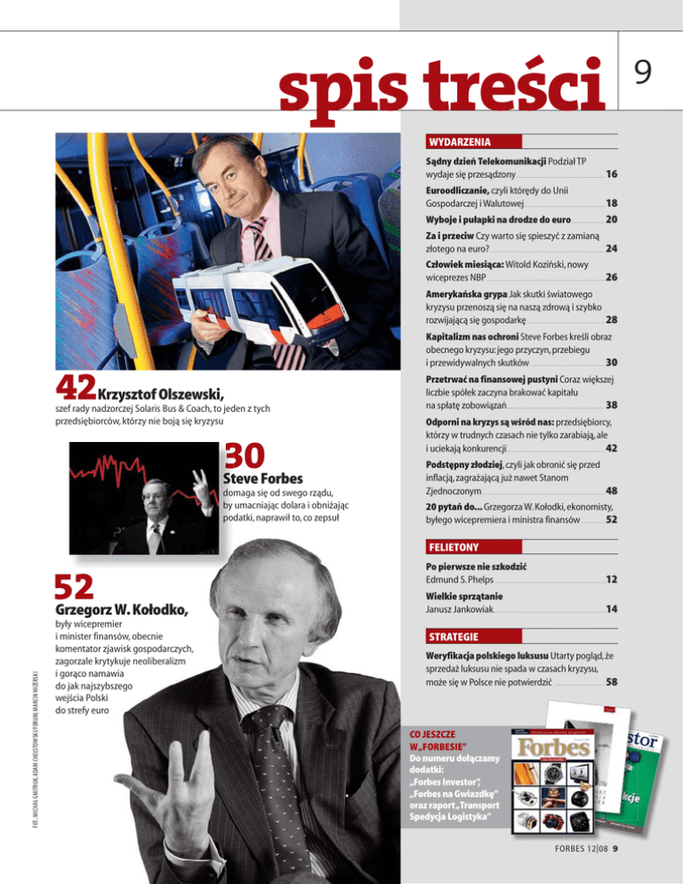 9 spis treści WYDARZENIA Sądny dzień Telekomunikacji Podział TP wydaje się przesądzony. . . . . . . . . . . . . . . . . . . . . . . . . . . . . . . . . . . . . . . . . . . . . . . . . . . 16 Euroodliczanie, czyli którędy do Unii Gospodarczej i Walutowej . . . . . . . . . . . . . . . . . . . . . . . . . . . . . . . . . . . . . . . . . . . . . . 18 Wyboje i pułapki na drodze do euro . . . . . . . . . . . . . . . . . . . 20 Za i przeciw Czy warto się spieszyć z zamianą złotego na euro? . . . . . . . . . . . . . . . . . . . . . . . . . . . . . . . . . . . . . . . . . . . . . . . . . . . . . . . . . . . . . . . . . . 24 Człowiek miesiąca: Witold Koziński, nowy wiceprezes NBP. . . . . . . . . . . . . . . . . . . . . . . . . . . . . . . . . . . . . . . . . . . . . . . . . . . . . . . . . . . . . . . . . . . . .26 Amerykańska grypa Jak skutki światowego kryzysu przenoszą się na naszą zdrową i szybko rozwijającą się gospodarkę . . . . . . . . . . . . . . . . . . . . . . . . . . . . . . . . . . . . . . . . . . . . 28 Kapitalizm nas ochroni Steve Forbes kreśli obraz obecnego kryzysu: jego przyczyn, przebiegu i przewidywalnych skutków . . . . . . . . . . . . . . . . . . . . . . . . . . . . . . . . . . . . . . . . . . 30 42Krzysztof Olszewski, szef rady nadzorczej Solaris Bus & Coach, to jeden z tych przedsiębiorców, którzy nie boją się kryzysu 30 Steve Forbes St do domaga się od swego rządu, by umacniając dolara i obniżając podatki, naprawił to, co zepsuł po Przetrwać na finansowej pustyni Coraz większej liczbie spółek zaczyna brakować kapitału na spłatę zobowiązań . . . . . . . . . . . . . . . . . . . . . . . . . . . . . . . . . . . . . . . . . . . . . . . . . . . . . . . . 38 Odporni na kryzys są wśród nas: przedsiębiorcy, którzy w trudnych czasach nie tylko zarabiają, ale i uciekają konkurencji . . . . . . . . . . . . . . . . . . . . . . . . . . . . . . . . . . . . . . . . . . . . . . . . . . . . . . . . 42 Podstępny złodziej, czyli jak obronić się przed inflacją, zagrażającą już nawet Stanom Zjednoczonym . . . . . . . . . . . . . . . . . . . . . . . . . . . . . . . . . . . . . . . . . . . . . . . . . . . . . . . . . . . . . . . . . . . . . . 48 20 pytań do... Grzegorza W. Kołodki, ekonomisty, byłego wicepremiera i ministra finansów . . . . . . . . . . . . . . 52 FELIETONY FOT.: MICHAŁ GMITRUK; ADAM CHEŁSTOWSKI/FORUM; MARCIN MIZERSKI 52 Grzegorz W. Kołodko, były wicepremier i minister finansów, obecnie komentator zjawisk gospodarczych, zagorzale krytykuje neoliberalizm i gorąco namawia do jak najszybszego wejścia Polski do strefy euro Po pierwsze nie szkodzić Edmund S. Phelps . . . . . . . . . . . . . . . . . . . . . . . . . . . . . . . . . . . . . . . . . . . . . . . . . . . . . . . . . . . . . . . .12 Wielkie sprzątanie Janusz Jankowiak. . . . . . . . . . . . . . . . . . . . . . . . . . . . . . . . . . . . . . . . . . . . . . . . . . . . . . . . . . . . . . . . .14 STRATEGIE Weryfikacja polskiego luksusu Utarty pogląd, że sprzedaż luksusu nie spada w czasach kryzysu, może się w Polsce nie potwierdzić . . . . . . . . . . . . . . . . . . . . . . . . . . . . 58 CO JESZCZE W „FORBESIE” Do numeru dołączamy dodatki: „Forbes Investor”, „Forbes na Gwiazdkę” oraz raport „Transport Spedycja Logistyka” Inves tor A K C J E 12/200 F U N D U S Z E N O T O W A N I A Trafion e akcje IIn nw weessty ty cje L_FRB_ 12_INV. indd 1 alt er na a ttyyyw at w wn e Q Ze sła ni na fix in g 2008-11 FORBES 12 | 08 9 -13 13 15:38:22 8 spis treści Jazda bez świateł Hamowanie w branży motoryzacyjnej – spada sprzedaż nowych aut . . . . . 60 Koniec świata pośredników Doradcy finansowi szukają sposobów na przetrwanie kryzysu . . . . . . . . . . . . . . . . . . . . . . . . . . . . . . . . . . . . . . . . . . . . . . . . . . . 64 122Dossier – Filantropia i biznes 93 proc. Polaków uważa, że firmy powinny bardziej angażować się w działalność dobroczynną Słabnie Moski czar Dlaczego fundusze nie kochają już Krzysztofa Moski? . . . . . . . . . . . . . . . . . . . . . . . . . . . . . . . . . . . . . 68 Napięcie w prądzie MSP sprzedaje udziały w trzech koncernach energetycznych. Skutki mogą być zgubne: drożyzna i brak konkurencji . . . . . . . . . . . . . . . . . . . . . . . . . . . . . . . . . . . . . . . . . . . . . . . . . . . . . . . . . . . . . . . . . . . . . . . . . . . . 70 Dolce vita w trudnych czasach Importerom luksusowej żywności kryzys niestraszny . . . . . . . . . . . . . . . . 109 Teren zalewowy Czego rodzime TFI uczą się na dramatycznych spadkach . . . . . . . . . . . . . . . . . . . . . . . . . . . . . . . . . . . . . . . . . . . . . . . . . . 112 Wpuszczeni w biopaliwa Jak Aleksander Gudzowaty i Zbigniew Komorowski utopili setki milionów złotych . . . . . . . . . . . . . . . . . . . . . . . . . . . . . . . . . . . . . . . . . . . . . . . . . . . . . . . . . . . . . . . . . . 116 16 Bankowy poker Kulisy ryzykownego przejęcia banku Wachovia przez Wells Fargo. . . . . . . . . . . . . . . . . . . . . . . . . 120 20 DOSSIER Filantropia i biznes . . . . . . . . . . . . . . . . . . . . . . . . . . . . . . . . . . . . . . . . . . . . . . . . . . . . 122 22 Społeczne inwestycje . . . . . . . . . . . . . . . . . . . . . . . . . . . . . . . . . . . . . . . . . . . . . . . . . 126 26 Blaski i cienie wolontariatu . . . . . . . . . . . . . . . . . . . . . . . . . . . . . . . . . . . 130 30 Sprawiedliwe miliony . . . . . . . . . . . . . . . . . . . . . . . . . . . . . . . . . . . . . . . . . . . . . . . . 134 34 FINANSE Short squeeze – Porsche rozdaje karty . . . . . . . . . 136 36 Atomowy biznes . . . . . . . . . . . . . . . . . . . . . . . . . . . . . . . . . . . . . . . . . . . . . . . . . . . . . . . . . . . 138 38 150 Najdroższe Najdro gwiazdy kuchni gwiaz – w tym bbiznesie nie wystarczy dobrze gotować, trzeba jeszcze świetnie wyglądać w telewizji, wynika światowej listy ze św