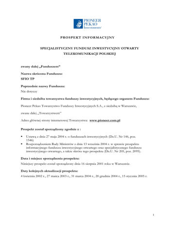 PROSPEKT INFORMACYJNY SPECJALISTYCZNY FUNDUSZ INWESTYCYJNY OTWARTY TELEKOMUNIKACJI POLSKIEJ zwany dalej „Funduszem” Nazwa skrócona Funduszu: SFIO TP Poprzednie nazwy Funduszu: Nie dotyczy Firma i siedziba towarzystwa funduszy inwestycyjnych, będącego organem Funduszu: Pioneer Pekao Towarzystwo Funduszy Inwestycyjnych S.A., z siedzibą w Warszawie, zwane dalej „Towarzystwem” Adres głównej strony internetowej Towarzystwa: www.pioneer.com.pl Prospekt został sporządzony zgodnie z : Ustawą z dnia 27 maja 2004 r. o funduszach inwestycyjnych (Dz.U. Nr 146, poz. 1546) Rozporządzeniem Rady Ministrów z dnia 13 września 2004 r. w sprawie prospektu informacyjnego funduszu inwestycyjnego otwartego oraz specjalistycznego funduszu inwestycyjnego otwartego, a także skrótu tego prospektu (Dz.U. Nr 205, poz. 2095). Data i miejsce sporządzenia prospektu: Niniejszy prospekt został sporządzony dnia 16 sierpnia 2001 roku w Warszawie. Daty kolejnych aktualizacji prospektu: 4 kwietnia 2002 r., 27 marca 2003 r., 31 marca 2004 r., 20 grudnia 2004 r., 15 stycznia 2005 r. 1 Rozdział I Osoby odpowiedzialne za informacje zawarte w prospekcie 1. Firma, siedziba i adres Towarzystwa Pioneer Pekao Towarzystwo Funduszy Inwestycyjnych Spółka Akcyjna z siedzibą w Warszawie, ul. Domaniewska 41, 02-672 Warszawa, Polska. 2. Osoby fizyczne działające w imieniu Towarzystwa, odpowiedzialne za informacje zawarte w prospekcie 2.1 2.2 2.3 Zbigniew Jagiełło – Prezes Zarządu Towarzystwa, Andrzej Szeworski – Wiceprezes Zarządu Towarzystwa, Piotr Żochowski - Wiceprezes Zarządu Towarzystwa. Informacje zawarte w prospekcie są prawdziwe i rzetelne oraz nie pomijają żadnych faktów ani okoliczności, których ujawnienie w prospekcie jest wymagane przepisami Rozporządzenia, a także wedle naszej najlepszej wiedzy nie istnieją, poza ujawnionymi w prospekcie, okoliczności, które mogłyby wywrzeć znaczący wpływ na sytuację prawną, majątkową i finansową Specjalistycznego Funduszu Inwestycyjnego Otwartego Telekomunikacji Polskiej. ................................. ..................................... .................................. Zbigniew Jagiełło Andrzej Szeworski Piotr Żochowski Prezes Zarządu Wiceprezes Zarządu Wiceprezes Zarządu Rozdział II Dane o towarzystwie funduszy inwestycyjnych 1. Firma, kraj siedziby, siedziba i adres Towarzystwa wraz z numerami telekomunikacyjnymi, adresem głównej strony internetowej i adresem poczty elektronicznej 1.1. Firma, kraj siedziby, siedziba Towarzystwa: Pioneer Pekao Towarzystwo Funduszy Inwestycyjnych Spółka Akcyjna z siedzibą w Warszawie, Polska Adres: ul. Domaniewska 41, 02-672 Warszawa, Polska Numery telekomunikacyjne: telefon: (+48 22) 640 40 00, faks: (+48 22) 640 40 05 Internet: http://www.pioneer.com.pl Poczta elektroniczna: [email protected] 1.2. 1.3. 1.4. 1.5. 2. Data i numer decyzji Komisji Papierów Wartościowych i Giełd o udzieleniu zezwolenia na utworzenie Towarzystwa Decyzja z dnia 9 maja 1996 r. nr KPW-4077-1/96-4814. 2 (W dniu 3 lipca 2001 roku nastąpiło połączenie Pekao Towarzystwa Funduszy Inwestycyjnych S.A. z Pioneer Pierwszym Polskim Towarzystwem Funduszy Inwestycyjnych S.A. posiadającym zezwolenie udzielone na mocy decyzji z dnia 28 lutego 1992 r., nr FP/1/92). 3. Oznaczenie sądu rejestrowego, numer, zarejestrowane i data wpisu do rejestru pod którym Towarzystwo jest Towarzystwo zostało wpisane do rejestru przedsiębiorców prowadzonego przez Sąd Rejonowy dla m. st. Warszawy, XX Wydział Gospodarczy Krajowego Rejestru Sądowego pod numerem 0000016956, w dniu 5 czerwca 2001 r. 4. Wysokość kapitału własnego Towarzystwa, w tym wysokość składników kapitału własnego na ostatni dzień bilansowy Kapitały własne Pioneer Pekao TFI S.A. na dzień 31.12.2003 r. Kapitał podstawowy 37 804 000,00 zł Kapitał zapasowy 0,00 zł Kapitał rezerwowy 0,00 zł Nierozliczona strata z lat ubiegłych (7 967 289,16) zł Zysk netto 19 739 001,20 zł Kapitał własny 49 575 712,04 zł 5. Sposób i termin opłacenia kapitału zakładowego Towarzystwa 5.1. Akcje imienne serii od A do F zostały opłacone w całości gotówką przed zarejestrowaniem. Akcje imienne serii G wydano w zamian za majątek spółki przejmowanej Pioneer PPTFI S.A. 5.2. 6. Firma i siedziba akcjonariuszy Towarzystwa wraz z liczbą głosów na walnym zgromadzeniu akcjonariuszy, jeżeli akcjonariusz posiada co najmniej 5% ogólnej liczby głosów na walnym zgromadzeniu akcjonariuszy Akcjonariuszem Towarzystwa jest spółka: Pioneer Pekao Investment Management S.A. z siedzibą w Warszawie, ul. Domaniewska 41, 02-672 Warszawa, Polska. Akcjonariusz jest właścicielem 100% kapitału zakładowego i ma prawo do 100% głosów na walnym zgromadzeniu. 7. Firma i siedziba podmiotu dominującego wobec Towarzystwa Jedynym akcjonariuszem Towarzystwa (100% akcji) jest Pioneer Pekao Investment Management S.A. z siedzibą w Warszawie, ul. Domaniewska 41, 02-672 Warszawa, Polska. Pioneer Pekao Investment Management S.A. ma prawo do 100% głosów na walnym zgromadzeniu. 8. Firma i siedziba podmiotu bezpośrednio lub pośrednio dominującego w stosunku do Pioneer Pekao Investment Management S.A. Pioneer Global Asset Management S.p.A., Galleria San Carlo, 6 - 20122 Mediolan (Włochy), ma prawo do 51% głosów na walnym zgromadzeniu akcjonariuszy, oraz do wskazania trzech kandydatów na członków Rady Nadzorczej i kandydata na stanowisko Prezesa Zarządu Pioneer Pekao Investment Management S.A. 9. Imiona i nazwiska 9.1. Skład Zarządu Towarzystwa 9.1.1. Zbigniew Jagiełło 9.1.2. Andrzej Szeworski - Prezes Zarządu, - Wiceprezes Zarządu, 3 9.1.3. Piotr Żochowski - Wiceprezes Zarządu. 9.2. Skład Rady Nadzorczej 9.2.1. 9.2.2. 9.2.3. 9.2.4. 9.2.5. Daniel K. Kingsbury – Przewodniczący Rady Nadzorczej, Maciej Kalicki, Cezary Iwański, Tomasz Orlik, Zbigniew Sienkiewicz. 9.3. Prokurenci Towarzystwa 9.3.1. Zbigniew Czumaj 9.3.2. Piotr Jarosz 9.3.3. Maria Maciejec 9
