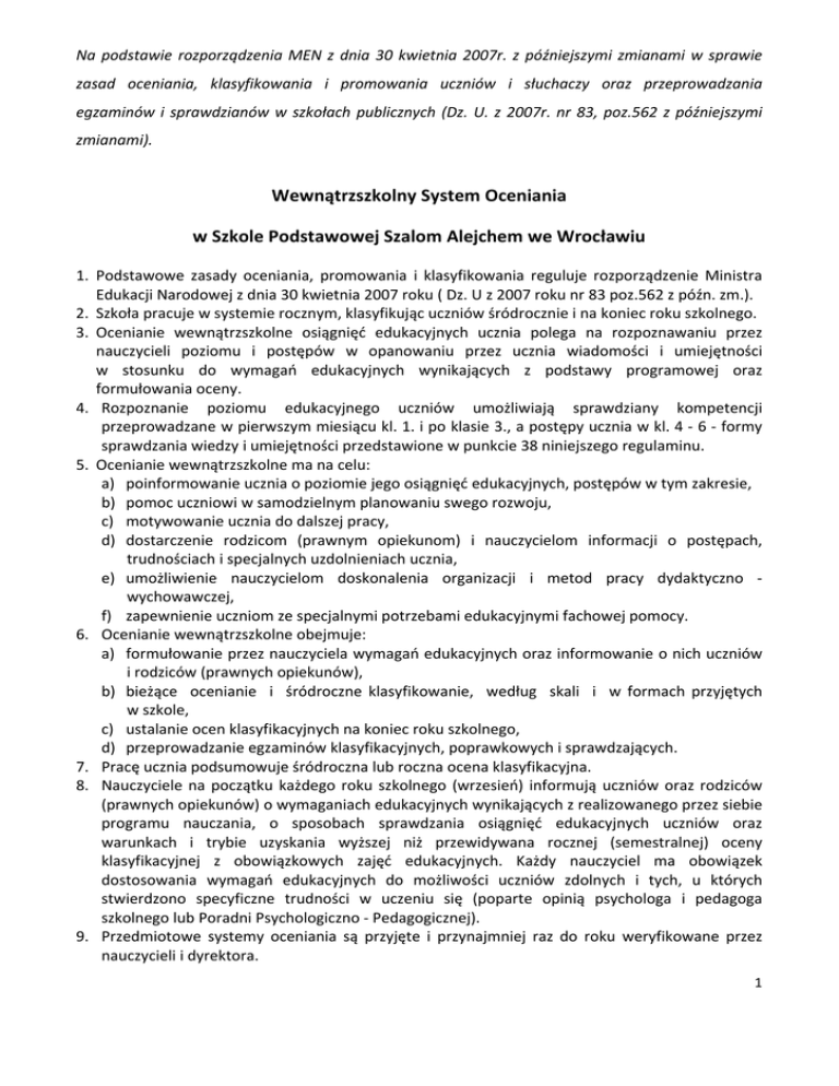 Na podstawie rozporządzenia MEN z dnia 30 kwietnia 2007r. z późniejszymi zmianami w sprawie zasad oceniania, klasyfikowania i promowania uczniów i słuchaczy oraz przeprowadzania egzaminów i sprawdzianów w szkołach publicznych (Dz. U. z 2007r. nr 83, poz.562 z późniejszymi zmianami). Wewnątrzszkolny System Oceniania w Szkole Podstawowej Szalom Alejchem we Wrocławiu 1. 2. 3. 4. 5. 6. 7. 8. 9. Podstawowe zasady oceniania, promowania i klasyfikowania reguluje rozporządzenie Ministra Edukacji Narodowej z dnia 30 kwietnia 2007 roku ( Dz. U z 2007 roku nr 83 poz.562 z późn. zm.). Szkoła pracuje w systemie rocznym, klasyfikując uczniów śródrocznie i na koniec roku szkolnego. Ocenianie wewnątrzszkolne osiągnięć edukacyjnych ucznia polega na rozpoznawaniu przez nauczycieli poziomu i postępów w opanowaniu przez ucznia wiadomości i umiejętności w stosunku do wymagań edukacyjnych wynikających z podstawy programowej oraz formułowania oceny. Rozpoznanie poziomu edukacyjnego uczniów umożliwiają sprawdziany kompetencji przeprowadzane w pierwszym miesiącu kl. 1. i po klasie 3., a postępy ucznia w kl. 4 ‐ 6 ‐ formy sprawdzania wiedzy i umiejętności przedstawione w punkcie 38 niniejszego regulaminu. Ocenianie wewnątrzszkolne ma na celu: a) poinformowanie ucznia o poziomie jego osiągnięć edukacyjnych, postępów w tym zakresie, b) pomoc uczniowi w samodzielnym planowaniu swego rozwoju, c) motywowanie ucznia do dalszej pracy, d) dostarczenie rodzicom (prawnym opiekunom) i nauczycielom informacji o postępach, trudnościach i specjalnych uzdolnieniach ucznia, e) umożliwienie nauczycielom doskonalenia organizacji i metod pracy dydaktyczno ‐ wychowawczej, f) zapewnienie uczniom ze specjalnymi potrzebami edukacyjnymi fachowej pomocy. Ocenianie wewnątrzszkolne obejmuje: a) formułowanie przez nauczyciela wymagań edukacyjnych oraz informowanie o nich uczniów i rodziców (prawnych opiekunów), b) bieżące ocenianie i śródroczne klasyfikowanie, według skali i w formach przyjętych w szkole, c) ustalanie ocen klasyfikacyjnych na koniec roku szkolnego, d) przeprowadzanie egzaminów klasyfikacyjnych, poprawkowych i sprawdzających. Pracę ucznia podsumowuje śródroczna lub roczna ocena klasyfikacyjna. Nauczyciele na początku każdego roku szkolnego (wrzesień) informują uczniów oraz rodziców (prawnych opiekunów) o wymaganiach edukacyjnych wynikających z realizowanego przez siebie programu nauczania, o sposobach sprawdzania osiągnięć edukacyjnych uczniów oraz warunkach i trybie uzyskania wyższej niż przewidywana rocznej (semestralnej) oceny klasyfikacyjnej z obowiązkowych zajęć edukacyjnych. Każdy nauczyciel ma obowiązek dostosowania wymagań edukacyjnych do możliwości uczniów zdolnych i tych, u których stwierdzono specyficzne trudności w uczeniu się (poparte opinią psychologa i pedagoga szkolnego lub Poradni Psychologiczno ‐ Pedagogicznej). Przedmiotowe systemy oceniania są przyjęte i przynajmniej raz do roku weryfikowane przez nauczycieli i dyrektora. 1 10. Przedmiotowy system oceniania zawiera: a) kryteria ocen z przedmiotu, b) wykaz ocenianych obligatoryjnych lub fakultatywnych form aktywności i zadań wynikających z określonych celów i zadań programowych, c) formy sprawdzania wiadomości i umiejętności oraz możliwości poprawy oceny lub sprawdzianów, prac klasowych. 11. Wymagania przedmiotowe muszą uwzględniać podstawę programową oraz standardy wymagań. 12. Wszystkie oceny są jawne, zarówno dla uczniów jak i ich rodziców (prawnych opiekunów). Wszystkich informacji na temat funkcjonowania uczniów w szkole nauczyciele udzielają rodzicom (opiekunom prawnym) w czasie klasowych zebrań z rodzicami i podczas konsultacji. Poza tym, w każdym momencie roku szkolnego nauczyciel ma obowiązek udzielenia rodzicom (opiekunom prawnym) wskazówek do dalszej pracy z dzieckiem. 13. Na wniosek rodzica lub ucznia nauczyciel uzasadnia wystawioną ocenę. 14. Laureaci konkursów zewnętrznych na szczeblu wojewódzkim otrzymują obligatoryjnie ocenę klasyfikacyjną końcoworoczną celującą z przedmiotu. 15. Każdy nauczyciel ma obowiązek dostosowania ‐ obniżenia wymagań edukacyjnych do możliwości uczniów o specjalnych potrzebach edukacyjnych (poparte opinią psychologa i pedagoga szkolnego lub Poradni Psychologiczno ‐ Pedagogicznej) w stosunku do ucznia, u którego stwierdzono deficyty rozwojowe, specyficzne trudności w uczeniu uniemożliwiające sprostanie wymaganiom edukacyjnym wynikającym z programu nauczania. 16. W uzasadnionych przypadkach uczeń może być zwolniony z zajęć wychowania fizycznego na podstawie opinii lekarskiej przez Dyrektora Szkoły, lub w przypadku rozwijania dowolnej umiejętności w dyscyplinie sportowej na zajęciach pozaszkolnych na podstawie zaświadczenia wydanego przez klub sportowy lub inną organizację. 17. W przypadku zwolnienia uczniów z zajęć wychowania fizycznego w dokumentacji szkolnej wpisuje się „zwolniony”, jeżeli uczeń trenuje jakąś dyscyplinę sportu to ocenę klasyfikacyjną z wychowania fizycznego ustala się z uwzględnieniem opinii trenera. 18. Na niektórych zajęciach edukacyjnych (fakultatywnych, ścieżkach edukacyjnych, kołach zainteresowań) wykraczających poza obowiązkowy program, uczniowie mogą być oceniani na podstawie uczestnictwa. 19. Decyzję o tym, że na poszczególnych zajęciach uczniowie nie są oceniani, podejmuje Dyrektor. 20. W dokumentacji przebiegu nauczania /z punktu 18/, wpisuje się zamiast oceny klasyfikacyjnej „zaliczone”. 21. Przy ustalaniu oceny klasyfikacyjnej z przedmiotów: muzyka, plastyka, technika, wychowanie fizyczne brany jest pod uwagę w szczególności wysiłek wkładany przez ucznia z wywiązywania się z obowiązków wynikających ze specyfiki przedmiotu. 22. Wychowawca klasy na początku roku szkolnego (wrzesień) informuje uczniów oraz rodziców (prawnych opiekunów) o zasadach oceniania zachowania ora