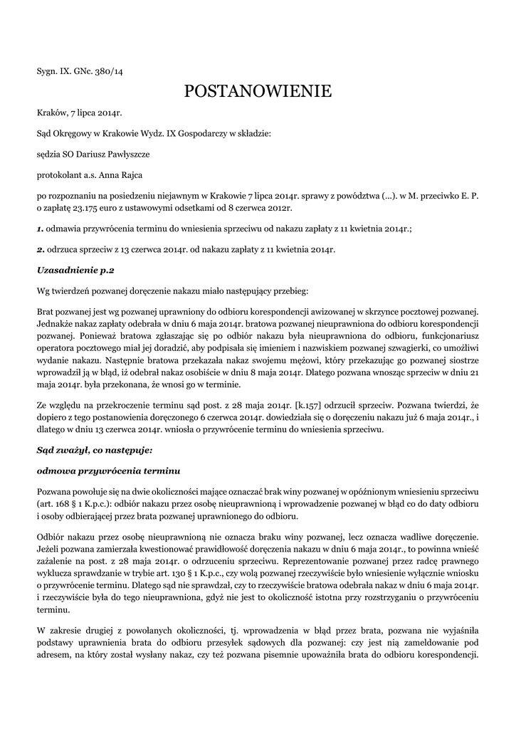 Sygn. IX. GNc. 380/14 POSTANOWIENIE Kraków, 7 lipca 2014r. Sąd Okręgowy w Krakowie Wydz. IX Gospodarczy w składzie: sędzia SO Dariusz Pawłyszcze protokolant a.s. Anna Rajca po rozpoznaniu na posiedzeniu niejawnym w Krakowie 7 lipca 2014r. sprawy z powództwa (...). w M. przeciwko E. P. o zapłatę 23.175 euro z ustawowymi odsetkami od 8 czerwca 2012r. 1. odmawia przywrócenia terminu do wniesienia sprzeciwu od nakazu zapłaty z 11 kwietnia 2014r.; 2. odrzuca sprzeciw z 13 czerwca 2014r. od nakazu zapłaty z 11 kwietnia 2014r. Uzasadnienie p.2 Wg twierdzeń pozwanej doręczenie nakazu miało następujący przebieg: Brat pozwanej jest wg pozwanej uprawniony do odbioru korespondencji awizowanej w skrzynce pocztowej pozwanej. Jednakże nakaz zapłaty odebrała w dniu 6 maja 2014r. bratowa pozwanej nieuprawniona do odbioru korespondencji pozwanej. Ponieważ bratowa zgłaszając się po odbiór nakazu była nieuprawniona do odbioru, funkcjonariusz operatora pocztowego miał jej doradzić, aby podpisała się imieniem i nazwiskiem pozwanej szwagierki, co umożliwi wydanie nakazu. Następnie bratowa przekazała nakaz swojemu mężowi, który przekazując go pozwanej siostrze wprowadził ją w błąd, iż odebrał nakaz osobiście w dniu 8 maja 2014r. Dlatego pozwana wnosząc sprzeciw w dniu 21 maja 2014r. była przekonana, że wnosi go w terminie. Ze względu na przekroczenie terminu sąd post. z 28 maja 2014r. [k.157] odrzucił sprzeciw. Pozwana twierdzi, że dopiero z tego postanowienia doręczonego 6 czerwca 2014r. dowiedziała się o doręczeniu nakazu już 6 maja 2014r., i dlatego w dniu 13 czerwca 2014r. wniosła o przywrócenie terminu do wniesienia sprzeciwu. Sąd zważył, co następuje: odmowa przywrócenia terminu Pozwana powołuje się na dwie okoliczności mające oznaczać brak winy pozwanej w opóźnionym wniesieniu sprzeciwu (art. 168 § 1 K.p.c.): odbiór nakazu przez osobę nieuprawnioną i wprowadzenie pozwanej w błąd co do daty odbioru i osoby odbierającej przez brata pozwanej uprawnionego do odbioru. Odbiór nakazu przez osobę nieuprawnioną nie oznacza braku winy pozwanej, lecz oznacza wadliwe doręczenie. Jeżeli pozwana zamierzała kwestionować prawidłowość doręczenia nakazu w dniu 6 maja 2014r., to powinna wnieść zażalenie na post. z 28 maja 2014r. o odrzuceniu sprzeciwu. Reprezentowanie pozwanej przez radcę prawnego wyklucza sprawdzanie w trybie art. 130 § 1 K.p.c., czy wolą pozwanej rzeczywiście było wniesienie wyłącznie wniosku o przywrócenie terminu. Dlatego sąd nie sprawdzał, czy to rzeczywiście bratowa odebrała nakaz w dniu 6 maja 2014r. i rzeczywiście była do tego nieuprawniona, gdyż nie jest to okoliczność istotna przy rozstrzyganiu o przywróceniu terminu. W zakresie drugiej z powołanych okoliczności, tj. wprowadzenia w błąd przez brata, pozwana nie wyjaśniła podstawy uprawnienia brata do odbioru przesyłek sądowych dla pozwanej: czy jest nią zameldowanie pod adresem, na który został wysłany nakaz, czy też pozwana pisemnie upoważniła brata do odbioru korespondencji. Niezależnie od podstawy uprawnienia brata błąd osoby uprawnionej do odbioru korespondencji dla strony jest równoznaczny z błędem strony. Nieprzekazanie przesyłki przez tę osobę adresatowi, przekazania opóźnione lub błędne poinformowanie o dacie odbioru nie może być podstawą przywrócenia terminu, gdyż strony niemieszkające samotnie uzyskałyby możliwość dowolnego manipulowania terminami ustawowymi i sądowymi. W razie winy osoby uprawnionej do odbioru pism strona ma jedynie roszczenie odszkodowawcze przeciwko domownikowi lub pełnomocnikowi odbierającemu przesyłkę. Podstawą przywrócenia terminu mogą być tylko okoliczności uniemożliwiające lub bardzo utrudniające przekazanie przesyłki przez domownika lub pełnomocnika (np. wyjazd strony tuż po odebraniu za nią przesyłki). Dlatego wniosek o przywrócenie terminu został oddalony. przywrócenie terminu a sprzeciw Warunkiem koniecznym rozpoznania wniosku o przywrócenie terminu jest jednoczesne dokonanie czynności procesowej objętej wnioskiem (art. 169 § 3 K.p.c.). W uzasadnieniu post. z 11 sierpnia 1999r. (I CKN 367/99, OSNC 2000/3/48) SN słusznie stwierdził, że prawomocne odrzucenie środka zaskarżenia definitywnie niweczy wszelkie skutki procesowe związane z jego wniesieniem - wnosząc o przywrócenie terminu strona powinna ponownie wnieść środek zaskarżenia. Na takiej samej wykładni zostały oparte uchwła 7 SN z 31 maja 2000r. (III ZP 1/00, OSNC 2001/1/1) i uchwała SN z 6 października 2000r. (III CZP 31/00, OSNC 2001/2/22). W powołanym wyżej post. z 11 sierpnia 1999r. SN uznał, że nie można traktować wniosku o przywrócenie terminu jako ponownego wniesienia środka zaskarżenia - strona powinna ponownie wnieść środek zaskarżenia. Wymaganie od strony ponownego złożenia pisma o treści identycznej z treścią znajdującego się w aktach odrzuconego pisma jest nadmiernym formalizmem - strona może wnieść środek zaskarżenia poprzez żądanie nadania biegu odrzuconemu pismu (tak jak w razie pominięcia czynności pełnomocnika, np. w razie ujawnienia, że pełnomocnik nie jest objęty hipotezą art. 87 K.p.c., strona nie musi ponownie wnosić pism - wystarczy oświadczenie o ich zatwierdzeniu). Niemniej jednak pozwana do wniosku o przywrócenie terminu dołączyła sprzeciw o treści identycznej jak odrzucony i sprzeciw ten podlega odrzuceniu na podstawie art. 504 § 1 K.p.c. jako spóźniony, Niezaskarżalne odrębnym zażaleniem rozstrzygnięcie w przedmiocie przywrócenia terminu ma wpływ tylko na ocenę, czy środek zaskarżenia został wniesiony w terminie - nie ma wpływu na ocenę pozostałych warunków nadania środkowi zaskarżenia biegu (tj. warunków formalnych środka zaskarżenia i opłaty co do pism podlegających opłacie). Mimo niezaskarżalności p.1 niniejszego postanowienia odrębnym zażaleniem, rozstrzygnięcie w przed