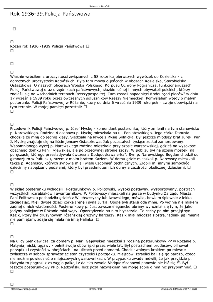 Świerszcz Różański Rok 1936-39.Policja Państwowa Różan rok 1936 -1939 Policja Państwowa Właśnie wróciłem z uroczystości związanych z 58 rocznicą pierwszych wywózek do Kozielska - z dorocznych uroczystości Katyńskich. Była tam mowa o jeńcach w obozach Kozielska, Starobielska i Ostaszkowa. O naszych oficerach Wojska Polskiego, Korpusu Ochrony Pogranicza, funkcjonariuszach Policji Państwowej oraz urzędnikach państwowych, służbie leśnej i innych obywateli polskich, którzy znaleźli się na wschodnich terenach Rzeczypospolitej. Tam zostali napadnięci „od pleców" w dniu 17 września 1939 roku przez ówczesnych sojuszników Rzeszy Niemieckiej. Pomyślałem wtedy o małym posterunku Policji Państwowej w Różanie, który do dnia 6 września 1939 roku pełnił swoje obowiązki na tym terenie. W mojej pamięci pozostali: Przodownik Policji Państwowej p. Józef Myckę - komendant posterunku, który zmienił na tym stanowisku p. Narewskiego. Rodzina 4 osobowa p. Myckę mieszkała na ul. Poniatowskiego. Jego córka Danusia chodziła ze mną do jednej klasy. Siedziała na ławce z Rysią Solnicką. Był jeszcze młodszy brat Jurek. Pan J. Myckę znajduje się na liście jeńców Ostaszkowa. Jak pozostałych tysiące został zamordowany. Wspomnianego wyżej p. Narewskiego rodzina mieszkała przy szosie warszawskiej, gdzieś na wysokości obecnego domku Pani Tyjewskiej, ale po przeciwnej stronie szosy. W pobliżu był na szosie mostek, na poręczach, którego przesiadywała ówczesna „kawalerka". Syn p. Narewskiego Bogdan chodził do gimnazjum w Pułtusku, razem z moim bratem Kaziem. W domu gdzie mieszkali p. Narewscy mieszkali także p. Adamscy, których synowie mieli wiele uzdolnień technicznych. Zrobili m. innymi samochód dziecinny napędzany pedałami, który był przedmiotem ich dumy a zazdrości okolicznej dzieciarni. W skład posterunku wchodzili: Posterunkowy p. Politowski, wysoki postawny, wysportowany, postrach wszystkich rozrabiaków i awanturników. P. Politowscy mieszkali na górze w budynku Zarządu Miasta. Pani Politowska pochodziła gdzieś z Wileńszczyzny lub lwowskiego, mówiła, bowiem śpiewnie z lekka zaciągając. Mięli dwoje dzieci córkę Irenę i syna Jurka. Oboje byli starsi ode mnie. Po wojnie nie miałem żadnej o nich wiadomości. Posterunkowy p. Just zawsze elegancko ubrany wyróżniał się tym, że jako jedyny policjant w Różanie miał wąsy. Oporządzenie na nim błyszczało. Te cechy po nim przejął syn Kazik, który był drużynowym różańskiej drużyny harcerzy. Kazik miał młodszą siostrę, jednak jej imienia nie pamiętam, zdaje się miała na imię Halinka. Na ulicy Sienkiewicza, za domem p. Marii Gajewskiej mieszkał z rodziną posterunkowy PP w Różanie p. Matynia, niski, tęgawy - pełnił swoje obowiązki przez wiele lat. Był postrachem brudasów, pilnował porządku i czystości w obejściach i na ulicach przed domami. Chodził wolnym krokiem po mieście zwłaszcza w soboty sprawdzając stan czystości i porządku. Miejscowi Izraelici bali się go bardzo, czego nie można powiedzieć o miejscowych gwałtownikach. W przypadku zwady mówili, że jak przyjdzie p. Matynia to pogrozi z za węgła pałką i z daleka zawoła „Szanowni panowie nie bić się !". Był jeszcze posterunkowy PP p. Radzyński, lecz poza nazwiskiem nie mogę sobie o nim nic przypomnieć. http://swierszcz.gouk.pl Kreator PDF Utworzono 8 March, 2017, 11:28 Świerszcz Różański Jak na mały posterunek Policji Państwowej w Różanie, to zapewniał on spokój i porządek w mieście i gminie, nie licząc sporadycznych patroli wojskowych z koszar. Los różańskiej Policji był taki sam jak i całej różańskiej społeczności z tym jednak, że przez wiele lat, to jest do 1989 roku, być członkiem rodziny policjanta, oznaczało być obywatelem poza wszelkimi kategoriami. Jan M. Żytowiecki PS. Przeszukałem rosyjskie aneksy do książki „Mord w Katyniu" gdzie jest nazwisko Matyja Jan syn Piotra urodzony w 1900 roku, obóz w Ostaszkowie. Nie wiem jednak czy to może być właśnie p. Matynia, bowiem transkrypcja na rosyjski jest bardzo różna. http://swierszcz.gouk.pl Kreator PDF Utworzono 8 March, 2017, 11:28