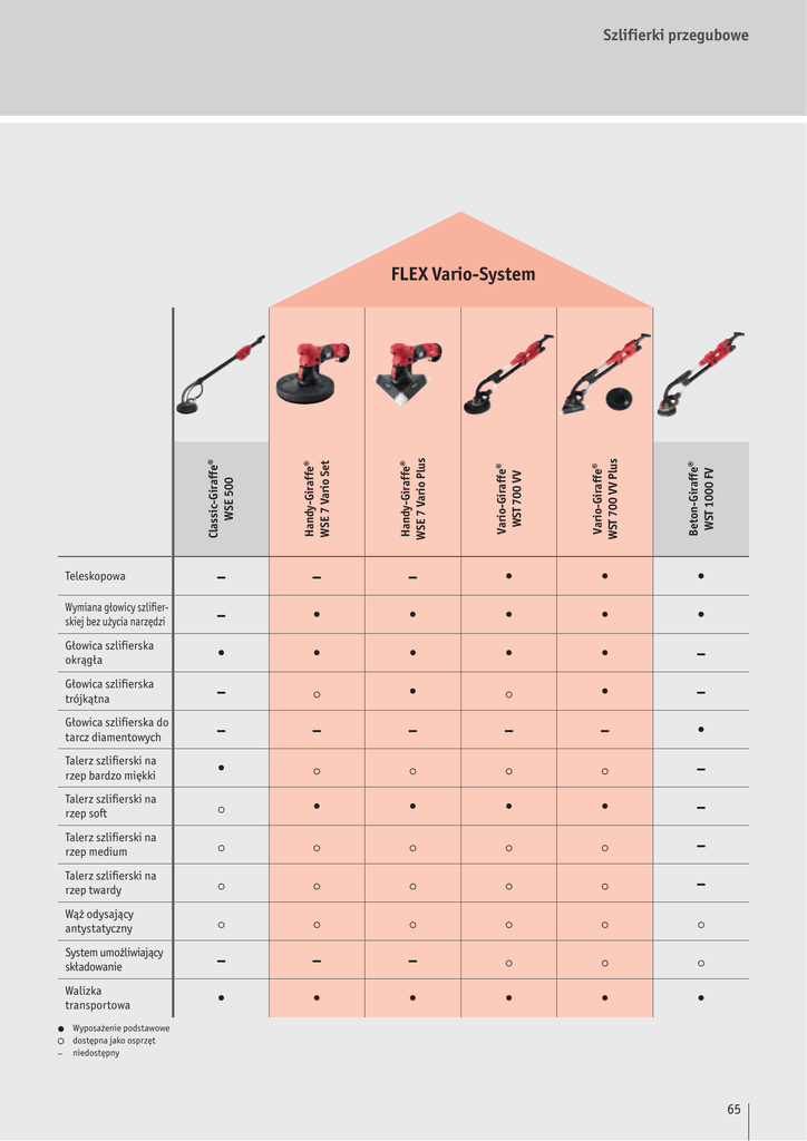 Szlifierki przegubowe Classic-Giraffe® WSE 500 Handy-Giraffe® WSE 7 Vario Set Handy-Giraffe® WSE 7 Vario Plus Vario-Giraffe® WST 700 VV Vario-Giraffe® WST 700 VV Plus Beton-Giraffe® WST 1000 FV FLEX Vario-System Teleskopowa – – – t t t Wymiana głowicy szlifierskiej bez użycia narzędzi – t t t t t Głowica szlifierska okrągła t t t t t – Głowica szlifierska trójkątna – t – Głowica szlifierska do tarcz diamentowych – – t Talerz szlifierski na rzep bardzo miękki t Talerz szlifierski na rzep soft t – – – – t t t t – Talerz szlifierski na rzep medium – Talerz szlifierski na rzep twardy – Wąż odysający antystatyczny P – System umożliwiający składowanie – – – Walizka transportowa t t t t t t Wyposażenie podstawowe dostępna jako osprzęt niedostępny 65 Szlifierki przegubowe FLEX Giraffe® – numer 1 na świecie do szlifowania ścian i sufitów Wprowadzenie na rynek europejski w 1997 roku przez firmę FLEX pierwszej szlifierki „z długą szyją” Giraffe® WS 702 VEA do obróbki sufitów i ścian zrewolucjonizowało przebieg prac malarskich, sztukaterskich, prac podczas suchego montażu i wielu innych. Dzisiaj mając Giraffe® firma FLEX ma najczęściej sprzedawaną na świecie szlifierkę z „długą szyją” Innowacyjną i wyjątkową następczynią Giraffe® WS 702 VEA jest Vario-Giraffe® WST 700 VV. To pierwsza szlifierka „z długą szyją”, którą można rozciągać i która jest wyposażona w wyjątkowy system wymiennej głowicy. Obok obróbki dużych powierzchni, dzięki innowacyjnej trójkątnej głowicy szlifierskiej, możliwa jest teraz także obróbka i wykończenie krawędzi i narożników. I to bez drabiny czy rusztowania. Wraz z Giraffe® WST 1000 FV do betonu konsekwentnie poszerzono i odpowiednio dopasowano technikę odnoszącej sukcesy szlifierki „z długą szyją” do obróbki betonu, tynków, powłok, jastrychu, kamienia naturalnego i sztucznego, kleju do płytek i wielu innych materiałów na ścianach i sufitach. Rodzina szlifierek Giraffe FLEX została poszerzona o nowe urządzenie szlifierskie. Mała i poręczna szlifierka Handy-Giraffe® WSE 7 Vario jest optymalnym uzupełnieniem szlifierki Vario-Giraffe®, przede wszystkim jeśli chodzi o obróbkę w wąskich miejscach, na mniejszych powierzchniach ścian i sufitów. Aby jeszcze bardziej ułatwić Państwu pracę na dużych powierzchniach i przy wysokich sufitach do 3,20 m, zbudowaliśmy wózek do żyrafy GM 320. Tym samym FLEX oferuje teraz wyjątkową rodzinę szlifierek „z długą szyją”, która sprosta prawie wszystkim zapotrzebowaniom. Na następnych stronach przedstawimy liczne możliwości zastosowania FLEX Giraffen. 64 FLEX Vario-System. Wszystko na klik. Niezależnie od tego czy chodzi o ścianę lub sufit, małą lub dużą powierzchnię pracy, płaską powierzchnię lub krawędzie i kąty – ze szlifierkami do ścian i sufitów Systemu Vario FLEX są Państwo przygotowani na każde wyzwanie. Oprócz szlifierki Vario-Giraffe® WST 700 VV, która jest idealna do wysokich ścian i sufitów, mamy do Państwa dyspozycji również „małą” Handy-Giraffe® WSE 7 Vario do obróbki mniejszych i trudnodostępnych powierzchni. A wszystko z inteligentnym systemem wymiany głowic okrągłych i trójkątnych. Kolejne strony katalogu przekonają Państwa do tego sprytnego i praktycznego Systemu Vario FLEX. 67 Szlifierki przegubowe Handy-Giraffe® WSE 7 Vario. Niewielka i poręczna. Nowa szlifierka Handy-Giraffe® WSE 7 Vario jest jednym z elementów wyjątkowego systemu do obróbki ścian i sufitów. Jest lekka i poręczna, a dzięki temu najbardziej przydatna do zastosowania na małych powierzchniach i w wąskich miejscach. Wyposażona w praktyczny system wymiany głowicy firmy FLEX, nowa szlifierka Handy-Giraffe® umożliwia oprócz obróbki powierzchni również szlifowanie przy brzegach. Jest idealnym uzupełnieniem szlifierki Vario-Giraffe® WST 700 VV. Zawsze pod kontrolą Specjalna osłona z uchwytem zapewnia przyjemną i wygodną obsługę, oraz umożliwia precyzyjne prowadzenie szlifierki Handy-Giraffe®. System zaciskowy FLEX Przyłączenie węża ssącego do WSE 7 Vario przeprowadzane jest bardzo wygodnie poprzez System Clip FLEX. Pewne jak Flex Włącznik/ wyłącznik chroniony przed pyłem i uszkodzeniem. Więcej wolnej przestrzeni Wąż odsysający przyłączony zostaje do urządzenia, co zapewnia pracę bez niepotrzebnych zakłóceń. Większa moc Silnik o wysokiej i stałej mocy 700wat zapewnia szybki postęp pracy. Aż do najmniejszych kątów Głowicę szlifierską można wymienić łatwym ruchem i natychmiast przeprowadzić obróbkę krawędzi i kątów. Zdolność przystosowania Kontrolowana elektronicznie prędkość od 600-1800 rpm zapewnia dobranie optymalnych obrotów. Tachogenerator utrzymuje stałą prędkość nawet pod obciążeniem i powolny rozruch. System wymiennej głowicy Proszę po prostu nacisnąć obydwie blokady na uchwycie głowicy szlifierskiej i jednym ruchem wyjąć ją z zatrzasku. 69 Szlifierki przegubowe Handy-Giraffe® WSE 7 Vario. Niezawodna w wąskich i ciasnych miejscach. Kompaktowa i lekka konstrukcja. Nowa szlifierka Handy-Giraffe® WSE 7 Vario przekonuje dodatkowo doskonałym system odsysania pyłu. Odkurzacz przyłącza się łatwo i szybko poprzez System Clip FLEX, a specjalne prowadzenie węża zapewnia pracę bez zakłóceń. Jako idealne uzupełnienie zalecamy specjalny odkurzacz przemysłowy firmy FLEX (od strony 194). Komfortowa Rozwiązania w narożnikach Idealny rezultat Specjalna osłona ochronna z uchwytem i wąska forma budowy przyczyniają się dodatkowo do wysokiego komfortu obsługi. Mała szlifierka Handy-Giraffe® WSE 7 Vario umożliwia szlifowanie nawet trudno dostępnych kątów – i to z zachowaniem najwyższej jakości powierzchni. Wymienna trójkątna głowica szlifierska umożliwia pracę przy krawędzi – dla perfekcyjnego wykończenia. 70 Szlifierki przegubowe
