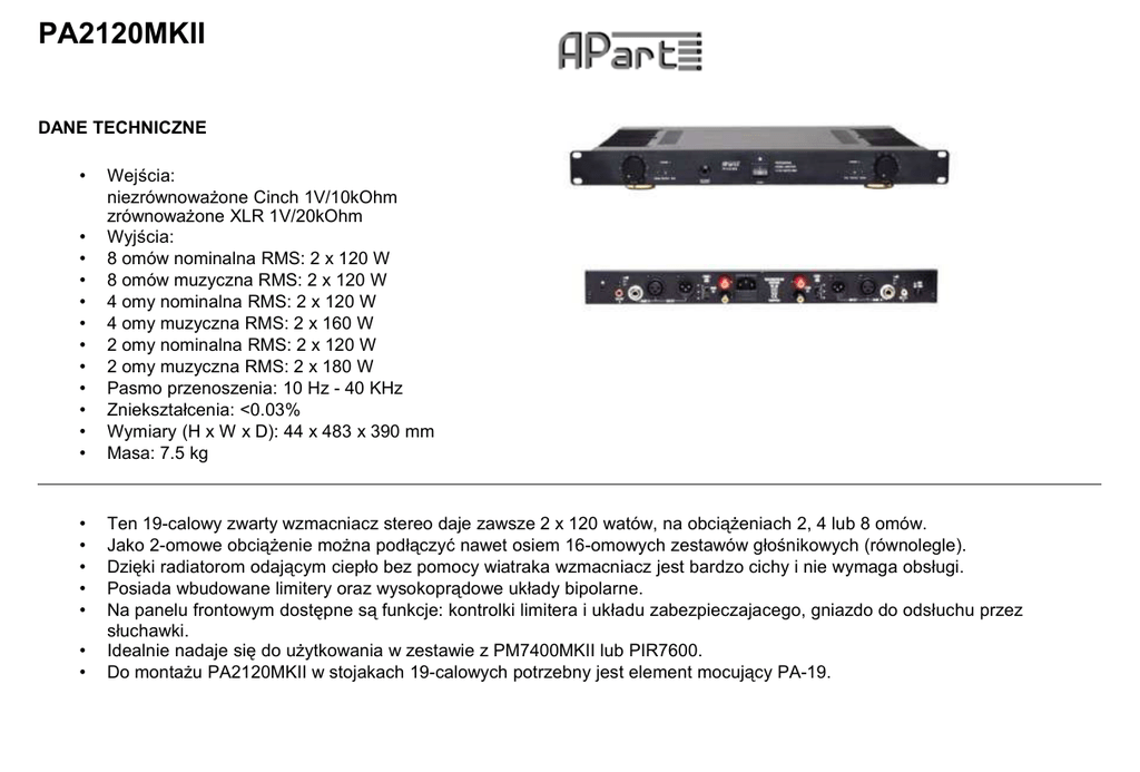 PA2120MKII DANE TECHNICZNE • • • • • • • • • • • • • • • • • • • Wejścia: niezrównoważone Cinch 1V/10kOhm zrównoważone XLR 1V/20kOhm Wyjścia: 8 omów nominalna RMS: 2 x 120 W 8 omów muzyczna RMS: 2 x 120 W 4 omy nominalna RMS: 2 x 120 W 4 omy muzyczna RMS: 2 x 160 W 2 omy nominalna RMS: 2 x 120 W 2 omy muzyczna RMS: 2 x 180 W Pasmo przenoszenia: 10 Hz - 40 KHz Zniekształcenia: <0.03% Wymiary (H x W x D): 44 x 483 x 390 mm Masa: 7.5 kg Ten 19-calowy zwarty wzmacniacz stereo daje zawsze 2 x 120 watów, na obciążeniach 2, 4 lub 8 omów. Jako 2-omowe obciążenie można podłączyć nawet osiem 16-omowych zestawów głośnikowych (równolegle). Dzięki radiatorom odającym ciepło bez pomocy wiatraka wzmacniacz jest bardzo cichy i nie wymaga obsługi. Posiada wbudowane limitery oraz wysokoprądowe układy bipolarne. Na panelu frontowym dostępne są funkcje: kontrolki limitera i układu zabezpieczajacego, gniazdo do odsłuchu przez słuchawki. Idealnie nadaje się do użytkowania w zestawie z PM7400MKII lub PIR7600. Do montażu PA2120MKII w stojakach 19-calowych potrzebny jest element mocujący PA-19.