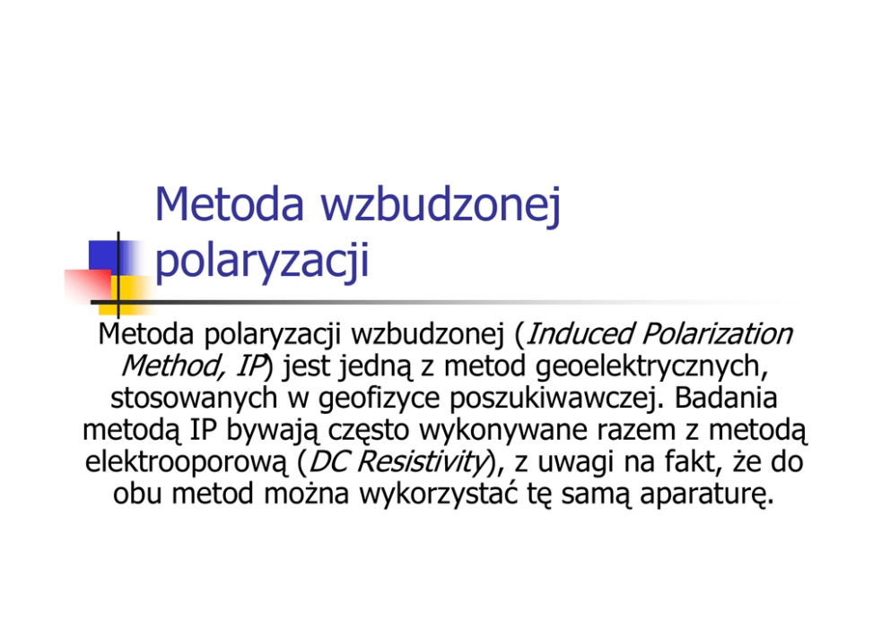 Metoda wzbudzonej polaryzacji Metoda polaryzacji wzbudzonej (Induced Polarization Method, IP) jest jedną z metod geoelektrycznych, stosowanych w geofizyce poszukiwawczej. Badania metodą IP bywają często wykonywane razem z metodą elektrooporową (DC Resistivity), z uwagi na fakt, że do obu metod można wykorzystać tę samą aparaturę. Metoda wzbudzonej polaryzacji Zjawisko obecności pól elektromagnetycznych pod wpływem wyłączenia impulsu (pola zewnętrznego) to zjawisko polaryzacji wzbudzonej (IP). Metoda wzbudzonej polaryzacji Bezpośrednia przyczyna to zjawiska elektrochemiczne zachodzące w ośrodku dwufazowym, które powodują powstanie pól EM. Pod wpływem pola zewnętrznego zjawiska elektrochemiczne aktywizują się. Pod wpływem wyłączenia impulsu następuje powrót do stanu równowagi. Zjawisko, które badamy Zjawisko, które badamy Badamy proces spadku napięcia na elektrodach pomiarowych, po wyłączeniu zasilania elektrod prądowych Przyczyny występowania efektu wzbudzonej polaryzacji Makroskopowe Mikroskopowe Elektrodowa Membranowa Przyczyna makroskopowa W momencie wyłączenia prądu układu, dzięki polaryzacji na granicy: ciało rudne – otoczenie, to ciało rudne zachowuje się jak kondensator, który utrzymuje przepływ prądu przez pewien czas. IP jest to jedna z podstawowych metod dla rud! Przyczyny mikroskopowe (1): Polaryzacja elektrodowa Na granicy ciało stałe (ziarno rudy) – roztwór (wody porowej) wytworzony jest prąd, który przechodzi przez barierę Powstaje kontaktowa różnica potencjałów. Przyczyny mikroskopowe (2): Polaryzacja membranowa Powstaje gdy kanały międzyporowe zwężają się do grubości kilkakrotnie większej od średnicy jonów Następuje zablokowanie swobodnego przepływu ładunków Kumulacja ładunków o różnym znaku po obu stronach „gardzieli” Przyczyny mikroskopowe (2): Polaryzacja membranowa Zachodzi w przypadku, gdy w kanałach międzyporowych zalegają cząsteczki min. ilastych Gdy prąd zaczyna płynąć, min. ilaste selektywnie przepuszczają ładunki dodatnie, a zatrzymują ujemne Powstaje nadmiar ład. ujemnego i tym samym różnica potencjałów Pojęcie polaryzowalności m Polaryzowalność (chargeability) to własność fizyczna opisująca zdolność materiałów do utrzymania naładowania ośrodka. Pojęcie polaryzowalności pozornej i oporności pozornej Wartości polaryzowalności dla wybranych typów skał i wody ms woda 0 żwiry 3-9 skały wulkaniczne 8-20 gnejsy 6-30 łupki 5-20 piaskowce 3-20 gliny 3-10 kwarcyt 5-12 Wartości polaryzowalności dla wybranych minerałów piryt chalkocyt grafit chalkopiryt bornit galena magnetyt malachit hematyt ms 13.4 13.2 11.2 9.4 6.3 3.7 2.2 0.2 0 Przykład zastosowania pod kątem wykrywania rud Przykład zastosowania pod kątem kartowania struktur związanych ze złożami węglowodorów