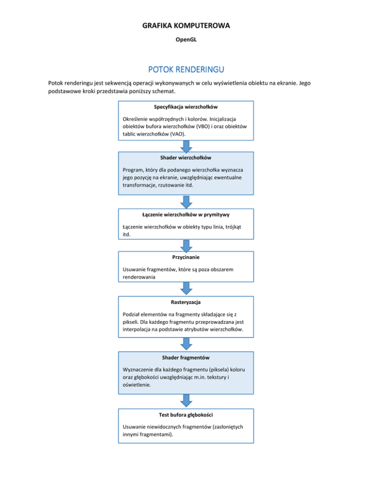GRAFIKA KOMPUTEROWA OpenGL POTOK RENDERINGU Potok renderingu jest sekwencją operacji wykonywanych w celu wyświetlenia obiektu na ekranie. Jego podstawowe kroki przedstawia poniższy schemat. Specyfikacja wierzchołków Określenie współrzędnych i kolorów. Inicjalizacja obiektów bufora wierzchołków (VBO) i oraz obiektów tablic wierzchołków (VAO). Shader wierzchołków Program, który dla podanego wierzchołka wyznacza jego pozycję na ekranie, uwzględniając ewentualne transformacje, rzutowanie itd. Łączenie wierzchołków w prymitywy Łączenie wierzchołków w obiekty typu linia, trójkąt itd. Przycinanie Usuwanie fragmentów, które są poza obszarem renderowania Rasteryzacja Podział elementów na fragmenty składające się z pikseli. Dla każdego fragmentu przeprowadzana jest interpolacja na podstawie atrybutów wierzchołków. Shader fragmentów Wyznaczenie dla każdego fragmentu (piksela) koloru oraz głębokości uwzględniając m.in. tekstury i oświetlenie. Test bufora głębokości Usuwanie niewidocznych fragmentów (zasłoniętych innymi fragmentami). BUFORY WIERZCHOŁKÓW (VBO - vertex buffer object) object) Wierzchołek opisują m.in. następujące atrybuty: współrzędne położenia, kolorów, normalnych, współrzędne tekstury. Dane te przechowywane są w obiektach bufora wierzchołków VBO. W buforze przechowywane są atrybuty jednego typu, np. tylko współrzędne. Aby utworzyć obiekt bufora wierzchołków należy skorzystać z poniższej funkcji, która generuje jego identyfikator: void glGenBuffers( GLsizei n, GLuint *buffers ); n buffers liczba identyfikatorów tworzonych buforów tablica, w której są przechowywane identyfikatory obiektów buforów a następnie powiązać wygenerowany identyfikator z określonym rodzajem obiektu: void glBindBuffer( GLenum target, GLuint buffer ); target buffer rodzaj bufora, np. GL_ARRAY_BUFFER jeśli chcemy przechowywać atrybuty wierzchołków identyfikator obiektu Powyższa funkcja sprawia, że bufor o identyfikatorze buffer staje się bieżącym buforem i dalsze operacje będą dotyczyły właśnie jego. Aby zmienić bieżący bufor, należy ponownie wywołać funkcję glBindBuffer z odpowiednim identyfikatorem. Do aktywnego bufora można skopiować dane korzystając z funkcji: void glBufferData( GLenum target, GLsizeiptr size, const GLvoid *data, GLenum usage ); target size data usage rodzaj bufora, np. GL_ARRAY_BUFFER jeśli chcemy przechowywać atrybuty wierzchołków rozmiar magazynu danych wskaźnik na źródło danych określa sposób wykorzystania bufora. Przykładowe wartości: GL_STATIC_DRAW – dane zostaną załadowane raz i używane wiele razy (podczas rysowanie) GL_DYNAMIC_DRAW – dane będą przeładowywane i używane wiele razy TABLICE WIERZCHOŁKÓW (VAO - vertex array objects) objects) Tablice wierzchołków VAO służą do zdefiniowania sposobu uporządkowania danych przechowywanych w buforach. Tablice te nie przechowują danych wierzchołków, ale informacje o powiązaniu poszczególnych atrybutów z danymi zapisanymi w buforach VBO. W tablicach VAO mogą być przechowywane informacje o wszystkich atrybutach wierzchołków, np. o współrzędnych, kolorach i innych. Aby utworzyć obiekt tablicy wierzchołków należy skorzystać z poniższej funkcji, która generuje jego identyfikator: void glGenVertexArrays( GLsizei n, GLuint *arrays ); n arrays liczba identyfikatorów obiektów tablic wierzchołków tablica, w której są przechowywane identyfikatory obiektów tablic wierzchołków Do przełączania się między tablicami wierzchołków (wybierania tablicy) służy funkcja: void glBindVertexArray( GLuint array ); array indentyfikator tablicy Po wybraniu tablicy za pomocą powyższej funkcji wszystkie operacje na tablicach, m.in. rysowanie za pomocą funkcji glDrawArrays opisanej dalej, będą dotyczyły wybranej tablicy. Aby określić, jak zorganizowane są dane w tablicy wierzchołków (określić gdzie w tablicy VAO mają się znajdować odniesienia do danych z bieżącego bufora VBO) należy użyć funkcji: void glVertexAttribPointer( GLuint index, GLint size, GLenum type, stride, const GLvoid *pointer ); index size type stride pointer GLsizei numer atrybutu, 0 ≤ index ≤ GL_MAX_VERTEX_ATTRIBS liczba składowych wektora opisującego pojedynczy wierzchołek (dla danego atrybutu, np. 3 dla współrzędnych x, y, z) rodzaj danych atrybutów przechowywanych w tablicy wierzchołków (np. GL_INT, GL_FLOAT) przesunięcie między elementami tablicy (0 oznacza, że kolejne elementy są w buforze bezpośrednio po sobie; odpowiednia wartość większa od zera umożliwia przechowywanie w jednej tablicy danych różnych atrybutów, np. współrzędnych i kolorów) wskaźnik do pierwszego elementu tablicy Każda tablica atrybutów określona za pomocą funkcji glVertexAttribPointer musi zostać włączona. Służy do tego funkcja: void glEnableVertexAttribArray( GLuint index ); index numer atrybutu, 0 ≤ index ≤ GL_MAX_VERTEX_ATTRIBS Po zakończeniu korzystania z tablicy należy ją wyłączyć: void glDisableVertexAttribArray( GLuint index ); PRYMITYWY Serie wierzchołków tworzą prymitywy. Podstawowe prymitywy geometryczne to: • Punkty GL_POINTS • Linie GL_LINES • Łamane GL_LINE_STRIP • Łamane zamknięte GL_LINE_LOOP • Trójkąty GL_TRIANGLES • Paski trójkątów GL_TRIANGLE_STRIP • Wachlarze trójkątów GL_TRIANGLE_FAN Mogą być rysowane przy użyciu funkcji void glDrawArrays( GLenum mode, GLint first, GLsizei count ); mode first count rodzaj prymitywu indeks startowy w tablicy liczba wierzchołków Powyższa funkcja dotyczy tablicy, która wcześniej została wybrana za pomocą funkcji glBindVertexArray.