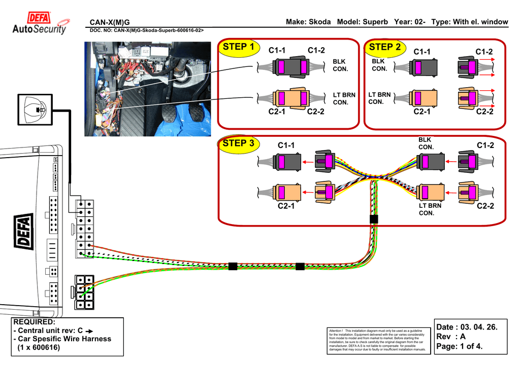 M a k e : S k o d a C A N -X (M )G M o d e l: S u p e r b Y e a r: 0 2 - T y p e : W ith e l. w in d o w D O C . N O : C A N -X (M )G -S k o d a -S u p e rb -6 0 0 6 1 6 -0 2 > S T E P 1 C 1 -1 S T E P 2 C 1 -2 L T B R N C O N . C 2 -1 S T E P 3 C 2 -2 Q U e n a r x IR E tra l S p e 6 0 0 D : u n it r e v : C s ific W ir e H a r n e s s 6 1 6 ) C 1 -2 C 2 -1 C 2 -2 L T B R N C O N . B L K C O N . C 1 -1 C 2 -1 R E - C - C (1 C 1 -1 B L K C O N . B L K C O N . C 1 -2 L T B R N C O N . A tte n tio n ! T h is fo r th e in s ta lla tio fro m m o d e l to m in s ta lla tio n , b e s m a n u fa c tu re r. D d a m a g e s th a t m in s ta lla tio n d n . E q u ip m e n o d e l a n d fro m u re to c h e c k E F A A .S is n a y o c c u r d u e ia g r a m m u s t o n ly b e u s e d a s a g u id e lin t d e liv e r e d w ith th e c a r v a r ie s c o n s id e r a m a r k e t to m a r k e t. B e fo r e s ta r tin g th e c a r e fu lly th e o r ig in a l d ia g r a m fr o m th e c o t lia b le to c o m p e n s a te fo r p o s s ib le to fa u lty o r in s u ffic ie n t in s ta lla tio n m a n u e b ly a r a ls . C 2 -2 D a te : 0 3 . 0 4 . 2 6 . R e v : A P a g e : 1 o f 4 . M a k e : S k o d a C A N -X (M )G M o d e l: S u p e r b Y e a r: 0 2 - T y p e : W ith e l. w in d o w D O C . N O : C A N -X (M )G -S k o d a -S u p e rb -6 0 0 6 1 6 -0 2 > S T E P 4 R E D R E D /B L K B L K W H T /G R N R E D + 1 2 V (3 0 ) A t t e n t i o n ! O n ly fo r c o u n tr ie s th a t r e q u ir e th is ty p e o f c o n n e c tio n . D a te : 0 3 . 0 4 . 2 6 . R e v : A P a g e : 2 o f 4 . M a k e : S k o d a C A N -X (M )G M o d e l: S u p e r b Y e a r: 0 2 - T y p e : W ith e l. w in d o w D O C . N O : C A N -X (M )G -S k o d a -S u p e rb -6 0 0 6 1 6 -0 2 > A t t e n t i o n ! O n ly w h e n u s in g th e D E F A re m o te c o n tro l th e c o n n e c tio n s o n th is p a g e a r e n e e d e d . S T E P 5 B L K C O N N E C T O R 1 0 1 1 1 1 9 2 9 2 0 R E D /B L U R E D /G R N R E D /B L U ( u n lo c k ) G R N /R E D ( lo c k ) D a te : 0 3 . 0 4 . 2 6 . R e v : A P a g e : 3 o f 4 . C A N -X (M )G M a k e : S k o d a M o d e l: S u p e r b Y e a r: 0 2 - T y p e : W ith e l. w in d o w D O C . N O : C A N -X (M )G -S k o d a -S u p e rb -6 0 0 6 1 6 -0 2 > U P D a te : 0 3 . 0 4 . 2 6 . R e v : A P a g e : 4 o f 4 .