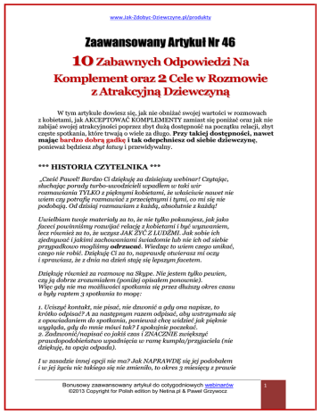 www.Jak-Zdobyc-Dziewczyne.pl/produkty Zaawansowany Artykuł Nr 46 10 Zabawnych Odpowiedzi Na Komplement oraz 2 Cele w Rozmowie z Atrakcyjną Dziewczyną W tym artykule dowiesz się, jak nie obniżać swojej wartości w rozmowach z kobietami, jak AKCEPTOWAĆ KOMPLEMENTY zamiast się poniżać oraz jak nie zabijać swojej atrakcyjności poprzez zbyt dużą dostępność na początku relacji, zbyt częste spotkania, które trwają o wiele za długo. Przy takiej dostępności, nawet mając bardzo dobrą gadkę i tak odepchniesz od siebie dziewczynę, ponieważ będziesz zbyt łatwy i przewidywalny. *** HISTORIA CZYTELNIKA *** „Cześć Paweł! Bardzo Ci dziękuję za dzisiejszy webinar! Czytając, słuchając porady turbo-uwodzicieli wpadłem w taki wir rozmawiania TYLKO z pięknymi kobietami, że właściwie nawet nie wiem czy potrafię rozmawiać z przeciętnymi i tymi, co mi się nie podobają. Od dzisiaj rozmawiam z każdą, absolutnie z każdą! Uwielbiam twoje materiały za to, że nie tylko pokazujesz, jak jako faceci powinniśmy rozwijać relację z kobietami i być wyzwaniem, lecz również za to, że uczysz JAK ŻYĆ Z LUDŹMI. Jak sobie ich zjednywać i jakimi zachowaniami świadomie lub nie ich od siebie przypadkowo mogliśmy odrzucać. Wiedząc to wiem czego unikać, czego nie robić. Dziękuję Ci za to, naprawdę otwierasz mi oczy i sprawiasz, że z dnia na dzień staję się lepszym facetem. Dziękuję również za rozmowę na Skype. Nie jestem tylko pewien, czy ją dobrze zrozumiałem (poniżej opisałem ponownie). Więc gdy nie ma możliwości spotkania się przez dłuższy okres czasu a były raptem 3 spotkania to mogę: 1. Uciszyć kontakt, nie pisać, nie dzwonić a gdy ona napisze, to krótko odpisać? A za następnym razem odpisać, aby wstrzymała się z opowiadaniem do spotkania, ponieważ chcę widzieć jak pięknie wygląda, gdy do mnie mówi tak? I spokojnie poczekać. 2. Zadzwonić/napisać co jakiś czas i ZNACZNIE zwiększyć prawdopodobieństwo wpadnięcia w ramę kumpla/przyjaciela (nie dziękuję, ta opcja odpada). I w zasadzie innej opcji nie ma? Jak NAPRAWDĘ się jej podobałem i w jej życiu nic takiego się nie zmieniło, to okres 3 miesięcy z prawie Bonusowy zaawansowany artykuł do cotygodniowych webinarów ©2013 Copyright for Polish edition by Netina.pl & Paweł Grzywocz 1 www.Jak-Zdobyc-Dziewczyne.pl/produkty zerowym kontaktem nie powinien spowodować, że da sobie ze mną spokój? (Króciutko przypomnę. Maciek z Wielkopolski 23 lata. Dałem jej telefon do wpisania swojego numeru w miejscu publicznym po paru minutach rozmowy (środek maja). Zapomniałem się odezwać(nie wiem jak to się stało..). Po tygodniu sobie przypomniałem i dałem sobie spokój z dzwonieniem/pisaniem do niej, ponieważ byłem do szpiku kości nafaszerowany bezwartościowymi poradami. Ona napisała mi pod koniec czerwca. Byliśmy na 3 spotkaniach (niemal pod rząd - 1błąd). Bardzo długich (~3-4h każde - 2błąd). Bardzo się jej podobałem, mówiła, że jestem fajny, towarzyski blablabla. I jak sie dowiedziała, że informatyk to jeszcze zaczęła mówić, że bardzo lubi informatyków, bo oni są tacy fajni. Byłem zmieszany bo tyle komplementów od kobiety nigdy nie słyszałem a tym bardziej, że wiadomo ile jest stereotypów o informatykach ;-). Osobiście nie dawałem jej żadnego komplementu (Błąd? Nie jestem pewien, ale 3 spotkania raptem. Bez przesady, aby komplementować w jakikolwiek sposób. Powinienem, chociaż powiedzieć, że też jest fajna?). Zazwyczaj, gdy mnie komplementowała to mówiłem dziękuję lub lekko obniżałem swoją wartość, mówiąc, że wcale taki nie jestem. Na spotkaniu sama powiedziała, że bardziej lubi spotkania niż pisanie sms/fb. Więc przez całe wakacje praktycznie zero odzewu. Po wakacjach zadzwoniłem do niej, dalej była daleko więc oddałem kontrolę mówiąc, aby zadzwoniła gdy będzie w mieście (duży błąd, nie oddawać nigdy kontroli kobiecie). Za 2-3 tyg. 2 nieudane próby kontaktu (nie odbierała telefonu) i mój sms, że gdy z nim zerwie to niech da mi znać (meega błąd, nigdy więcej tak nie robić). Teraz na święta przesłała mi życzenia świąteczne. A słyszałem, że kobiety nigdy nie robią czegoś "przez przypadek" i jestem totalnie zmieszany obecną sytuacją. Nawet nie wiem czy dzwonić kolejny raz i dać się odmówić po raz trzeci. A szkoda, bo cholernie mi się podobała.) Wszystko to działo się zanim poznałem, chociaż część twoich materiałów. I jeszcze jedna bardzo ważna kwestia. Obecnie posiadam KursJakZainteresowacDziewczyneRozmowa i powiem szczerze, że cały kurs mi się baaardzo podobał. Jedna z rad bardzo mi utkwiła w pamięci - aby dosłownie kopiować wszystkie śmieszne teksty z filmów, seriali itd.. aż trudno się przyznać, ale miałem blokadę przed tym! Kiedyś za czasów liceum usłyszałem jedno zdanie, że kopiowanie cudzych takich tekstów, powielania, powtarzanie po kimś to żenada itd. i miałem blokadę. Dziękuję za odblokowanie! Wcześniej nawet nie zdawałem sobie z tego sprawy a seriale, szczególnie komediowe których tak naprawdę nigdy wcześniej nie Bonusowy zaawansowany artykuł do cotygodniowych webinarów ©2013 Copyright for Polish edition by Netina.pl & Paweł Grzywocz 2 www.Jak-Zdobyc-Dziewczyne.pl/produkty oglądałem (preferowałem horrory, kryminały) to naprawdę WIELKA beczka dobrego humoru. Szczególnie te, które polecasz w swoich materiałach. Teraz chcę zakupić kolejny twój materiał. Jest ich parę i totalnie nie wiem, na który się zdecydować. Znając już mnie w minimalnym stopniu zaproponujesz kolejną dawkę materiału? Zastanawiałem się również nad poczekaniem na zapowiadany w styczniu materiał o związkach. Nigdy nie byłem w dłuższym związku (raptem 2 miesiące) i podejrzewam, że wszystkie rady na temat rozwoju, pielęgnowania, utrzymywania związku z kobietą będę wsiąkać jak gąbka wodę :). Serdecz