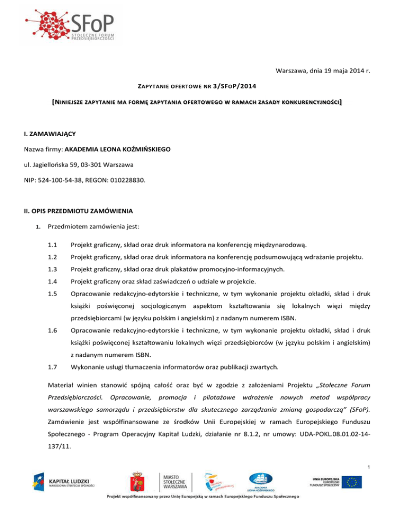 Warszawa, dnia 19 maja 2014 r. Z APYTANIE OFERTOWE NR 3/SF O P/2014 [N INIEJSZE ZAPYTANIE MA FORMĘ ZAPYTANIA OFERTOWEGO W RAMACH ZASADY KONKURENCYJNOŚCI ] I. ZAMAWIAJĄCY Nazwa firmy: AKADEMIA LEONA KOŹMIŃSKIEGO ul. Jagiellońska 59, 03-301 Warszawa NIP: 524-100-54-38, REGON: 010228830. II. OPIS PRZEDMIOTU ZAMÓWIENIA 1. Przedmiotem zamówienia jest: 1.1 Projekt graficzny, skład oraz druk informatora na konferencję międzynarodową. 1.2 Projekt graficzny, skład oraz druk informatora na konferencję podsumowującą wdrażanie projektu. 1.3 Projekt graficzny, skład oraz druk plakatów promocyjno-informacyjnych. 1.4 Projekt graficzny oraz skład zaświadczeń o udziale w projekcie. 1.5 Opracowanie redakcyjno-edytorskie i techniczne, w tym wykonanie projektu okładki, skład i druk książki poświęconej socjologicznym aspektom kształtowania się lokalnych więzi między przedsiębiorcami (w języku polskim i angielskim) z nadanym numerem ISBN. 1.6 Opracowanie redakcyjno-edytorskie i techniczne, w tym wykonanie projektu okładki, skład i druk książki poświęconej kształtowaniu lokalnych więzi przedsiębiorców (w języku polskim i angielskim) z nadanym numerem ISBN. 1.7 Wykonanie usługi tłumaczenia informatorów oraz publikacji zwartych. Materiał winien stanowić spójną całość oraz być w zgodzie z założeniami Projektu „Stołeczne Forum Przedsiębiorczości. Opracowanie, promocja i pilotażowe wdrożenie nowych metod współpracy warszawskiego samorządu i przedsiębiorstw dla skutecznego zarządzania zmianą gospodarczą” (SFoP). Zamówienie jest współfinansowane ze środków Unii Europejskiej w ramach Europejskiego Funduszu Społecznego - Program Operacyjny Kapitał Ludzki, działanie nr 8.1.2, nr umowy: UDA-POKL.08.01.02-14137/11. 1 2. Szczegółowy opis przedmiotu zamówienia: Przygotowanie (we współpracy z przedstawicielem Projektu SFoP) i wydrukowanie informatora na konferencję międzynarodową, w tym: 2.1 2.1.1 Wykonanie oryginalnego projektu graficznego okładki oraz 24-28 stron wewnętrznych informatora w kolorze 4 + 4 w formacie 210 x 210 mm. 2.1.2 Przetłumaczenie na język angielski i redakcja tekstu przeznaczonego do zamieszczenia w informatorze o obj. nie mniejszej niż 1/2 ark. wyd. (20 000 znaków ze spacjami). 2.1.3 Opracowanie layoutu dla tekstu w informatorze w języku polskim i w języku angielskim. 2.1.4 Wykonanie składu informatora z wykorzystaniem materiału graficznego i tekstu w obu językach, w tym wykonanie schematów, wykresów (infografik). 2.1.5 Wykonanie korekty złożonego informatora w języku polskim i w języku angielskim oraz przygotowanie pliku do druku. 2.1.6 Wykonanie plików elektronicznych informatora w formatach PDF, EPUB oraz MOBI umożliwiających korzystanie z nich na komputerach stacjonarnych bądź laptopach oraz na urządzeniach mobilnych (tablety i smartfony) w tym przygotowanie plików do dystrybucji w Internecie. 2.1.7 Wydrukowanie informatora w nakładzie 1000 egz. na papierze spełniającym następujące wymagania: a) okładka: kreda mat ultra biała o gramaturze 250–300 g/m2, jednostronna folia soft touch + lakier UV punktowy, minimum jedno skrzydełko z wycięciem (wykrojnik), b) środek: kreda mat ultra biała o gramaturze 175–200 g/m2, minimum jedna strona ze skrzydełkiem. 2.1.8 Dostarczenie wydrukowanego nakładu informatora do siedziby Zamawiającego nie później niż do dnia 1 lipca 2014 r. Przygotowanie i wydrukowanie informatora na konferencję podsumowującą wdrażanie projektu, w tym: 2.2 2.2.1 Wykonanie oryginalnego projektu graficznego okładki oraz 20-24 stron wewnętrznych informatora w kolorze 4 + 4 w formacie 148 x 210 mm. 2.2.2 Opracowanie layoutu dla tekstu w informatorze dostarczonego przez Zamawiającego w języku polskim o obj. ok. 1 ark. wyd. (40 000 znaków ze spacjami). 2.2.3 Wykonanie składu informatora z wykorzystaniem materiału graficznego i tekstu, w tym wykonanie schematów, wykresów (infografik). 2 2.2.4 Wykonanie korekty złożonego informatora w języku polskim, przygotowanie wkładki 5-10 stron w języku angielskim i przygotowanie pliku do druku. 2.2.5 Wykonanie plików elektronicznych informatora w formatach PDF, EPUB oraz MOBI umożliwiających korzystanie z nich na komputerach stacjonarnych bądź laptopach oraz na urządzeniach mobilnych (tablety i smartfony) w tym przygotowanie plików do dystrybucji w Internecie. 2.2.6 Wydrukowanie informatora w nakładzie nie mniejszym niż 1000 egz. na papierze spełniającym następujące wymagania: a) okładka: kreda mat o gramaturze 350 g/m2, b) środek: kreda mat o gramaturze 175–200 g/m2. 2.2.7 Dostarczenie wydrukowanego nakładu informatora do siedziby Zamawiającego nie później niż do dnia 31 sierpnia 2014 r. Wykonanie oryginalnego projektu plakatu promocyjno-informacyjnego w formacie A3. 2.3 2.3.1 Wydrukowanie nie mniej niż 700 egz. plakatu na papierze kredowym mat o gramaturze 150 g/m2. 2.3.2 Dostarczenie wydrukowanych plakatów do siedziby Zamawiającego nie później niż do dnia 1 lipca 2014 r. 2.4 Opracowanie oryginalnego i interaktywnego projektu zaświadczenia (aktywny PDF) o udziale w projekcie, format A5, umożliwiający zamieszczanie na zaświadczeniu danych uczestnika oraz przygotowanie dokumentu do druku. 2.5 Przygotowanie i wydrukowanie publikacji zwartej poświęconej socjologicznym aspektom kształtowania się lokalnych więzi między przedsiębiorcami (w języku polskim i angielskim) w tym: 2.5.1 Weryfikacja językowa i korekta techniczna ok. 15 tekstów w języku angielskim dostarczonych przez Zamawiającego o łącznej obj. ok. 10 ark. wyd. (400 000 znaków ze spacjami). 2.5.2 Opracowanie ok. 15 abstraktów (dla każdego z tekstów) w języku polskim o obj. ok. 1 standardowej strony dla każdego z abstraktów. 2.5.3 Opracowanie oryginalnego layoutu publikacji (środek czarno-biały). 2.5.4 Przygotowanie oryginalnego projektu graficznego okładki publikacji (w kolorze). 2.5.5 Wykonanie sk