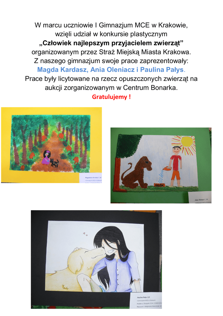 W marcu uczniowie I Gimnazjum MCE w Krakowie, wzięli udział w konkursie plastycznym „Człowiek najlepszym przyjacielem zwierząt” organizowanym przez Straż Miejską Miasta Krakowa. Z naszego gimnazjum swoje prace zaprezentowały: Magda Kardasz, Ania Oleniacz i Paulina Pałys. Prace były licytowane na rzecz opuszczonych zwierząt na aukcji zorganizowanym w Centrum Bonarka. Gratulujemy ! W charytatywnym konkursie plastycznym „Człowiek –najlepszym przyjacielem zwierząt” zorganizowanym przez Straż Miejską Miasta Krakowa z Partnerami konkursu : Krakowskim Towarzystwem Opieki nad Zwierzętami, C. H. Bonarka, uczennica naszego gimnazjum Paulina Pałys zajęła III miejsce w kategorii szkół ponadpodstawowych Gratulujemy!