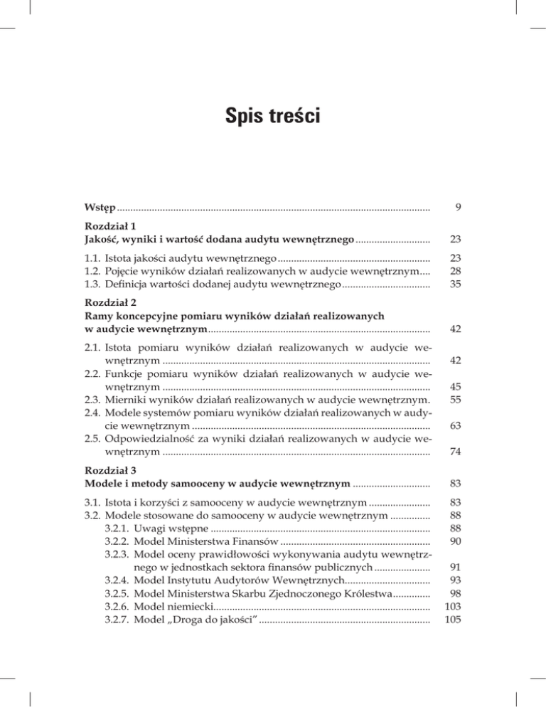 Spis treści Wstęp...................................................................................................................... 9 Rozdział 1 Jakość, wyniki i wartość dodana audytu wewnętrznego............................. 23 1.1. Istota jakości audytu wewnętrznego.......................................................... 1.2. Pojęcie wyników działań realizowanych w audycie wewnętrznym..... 1.3. Definicja wartości dodanej audytu wewnętrznego.................................. 23 28 35 Rozdział 2 Ramy koncepcyjne pomiaru wyników działań realizowanych w audycie wewnętrznym.................................................................................... 42 2.1. Istota pomiaru wyników działań realizowanych w audycie wewnętrznym..................................................................................................... 2.2. Funkcje pomiaru wyników działań realizowanych w audycie wewnętrznym..................................................................................................... 2.3. Mierniki wyników działań realizowanych w audycie wewnętrznym.. 2.4. Modele systemów pomiaru wyników działań realizowanych w audycie wewnętrznym.......................................................................................... 2.5. Odpowiedzialność za wyniki działań realizowanych w audycie wewnętrznym..................................................................................................... Rozdział 3 Modele i metody samooceny w audycie wewnętrznym.............................. 42 45 55 63 74 83 3.1. Istota i korzyści z samooceny w audycie wewnętrznym........................ 83 3.2. Modele stosowane do samooceny w audycie wewnętrznym................ 88 3.2.1. Uwagi wstępne................................................................................... 88 3.2.2. Model Ministerstwa Finansów......................................................... 90 3.2.3. Model oceny prawidłowości wykonywania audytu wewnętrznego w jednostkach sektora finansów publicznych...................... 91 3.2.4. Model Instytutu Audytorów Wewnętrznych................................. 93 3.2.5. Model Ministerstwa Skarbu Zjednoczonego Królestwa............... 98 3.2.6. Model niemiecki................................................................................. 103 3.2.7. Model „Droga do jakości”................................................................. 105 6 Spis treści 3.2.8. Model dojrzałości procesowej audytu wewnętrznego................. 3.2.9. Model rozwoju instytucjonalnego audytu wewnętrznego w sektorze publicznym.......................................................................... 3.3. Realizacja procesu samooceny w audycie wewnętrznym...................... 3.4. Metody samooceny w audycie wewnętrznym......................................... 111 115 122 144 Rozdział 4 Metodyka badania empirycznego pomiaru wyników i samooceny w audycie wewnętrznym jednostek sektora finansów publicznych......... 166 4.1. Metodyka i procedura badań empirycznych............................................ 4.2. Budowa kwestionariusza ankiety............................................................... 4.3. Metoda ekspercka.......................................................................................... 4.4. Charakterystyka zmiennych i skal pomiarowych.................................... 4.5. Charakterystyka badanych jednostek sektora finansów publicznych.. 166 169 170 173 178 Rozdział 5 Rezultaty badania w zakresie systemów pomiaru wyników działań realizowanych w audycie wewnętrznym jednostek sektora finansów publicznych........................................................................................................... 184 5.1. Perspektywy pomiaru wyników działań realizowanych w audycie wewnętrznym jednostek sektora finansów publicznych........................ 5.2. Klasyfikacja komórek audytu wewnętrznego według perspektyw pomiaru i wielkości........................................................................................... 5.3. Pomiar wyników działań realizowanych w audycie wewnętrznym w wyróżnionych dla celów badawczych grupach komórek audytu wewnętrznego................................................................................................ 5.3.1. Kluczowe perspektywy strategicznej karty wyników................... 5.3.2. Perspektywa komitetu audytu.......................................................... 5.3.3. Perspektywa naczelnego kierownictwa........................................... 5.3.4. Perspektywa audytowanych............................................................. 5.3.5. Perspektywa procesu i rozwoju audytu wewnętrznego............... 5.4. Mierniki i ich znaczenie w wyróżnionych dla celów badawczych grupach komórek audytu wewnętrznego....................................................... 5.5. Wpływ pomiaru na postrzeganą wartość dodaną, zgodność atrybutów i działań komórek audytu wewnętrznego ze standardami IIA oraz wyniki uzyskane w poszczególnych grupach komórek audytu wewnętrznego................................................................................................ 5.6. Weryfikacja hipotez badawczych – wyniki badań ankietowych........... 184 188 195 195 196 199 202 205 209 217 223 Spis treści 7 Rozdział 6 Rezultaty badania w zakresie systemów samooceny i postrzeganej wartości dodanej audytu wewnętrznego w jednostkach sektora finansów publicznych................................................................................................... 226 6.1. Modele samooceny stosowane przez audytorów wewnętrznych jednostek sektora finansów publicznych........................................................ 6.2. Kluczowe obszary samooceny audytu wewnętrznego w jednostkach sektora finansów publicznych..................................................................... 6.3. Korzyści z samooceny w audy