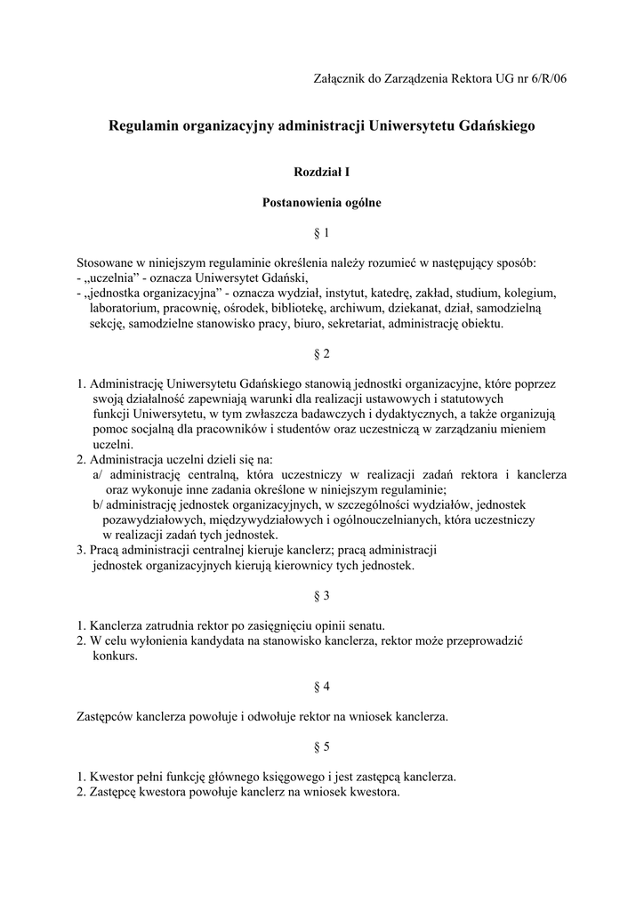 Załącznik do Zarządzenia Rektora UG nr 6/R/06 Regulamin organizacyjny administracji Uniwersytetu Gdańskiego Rozdział I Postanowienia ogólne §1 Stosowane w niniejszym regulaminie określenia należy rozumieć w następujący sposób: - „uczelnia” - oznacza Uniwersytet Gdański, - „jednostka organizacyjna” - oznacza wydział, instytut, katedrę, zakład, studium, kolegium, laboratorium, pracownię, ośrodek, bibliotekę, archiwum, dziekanat, dział, samodzielną sekcję, samodzielne stanowisko pracy, biuro, sekretariat, administrację obiektu. §2 1. Administrację Uniwersytetu Gdańskiego stanowią jednostki organizacyjne, które poprzez swoją działalność zapewniają warunki dla realizacji ustawowych i statutowych funkcji Uniwersytetu, w tym zwłaszcza badawczych i dydaktycznych, a także organizują pomoc socjalną dla pracowników i studentów oraz uczestniczą w zarządzaniu mieniem uczelni. 2. Administracja uczelni dzieli się na: a/ administrację centralną, która uczestniczy w realizacji zadań rektora i kanclerza oraz wykonuje inne zadania określone w niniejszym regulaminie; b/ administrację jednostek organizacyjnych, w szczególności wydziałów, jednostek pozawydziałowych, międzywydziałowych i ogólnouczelnianych, która uczestniczy w realizacji zadań tych jednostek. 3. Pracą administracji centralnej kieruje kanclerz; pracą administracji jednostek organizacyjnych kierują kierownicy tych jednostek. §3 1. Kanclerza zatrudnia rektor po zasięgnięciu opinii senatu. 2. W celu wyłonienia kandydata na stanowisko kanclerza, rektor może przeprowadzić konkurs. §4 Zastępców kanclerza powołuje i odwołuje rektor na wniosek kanclerza. §5 1. Kwestor pełni funkcję głównego księgowego i jest zastępcą kanclerza. 2. Zastępcę kwestora powołuje kanclerz na wniosek kwestora. 2 §6 Innych, niż wymienieni w §§ 3, 4 i 5 pracowników niebędących nauczycielami akademickimi, zatrudnia kanclerz na wniosek kierownika właściwej jednostki organizacyjnej. Zatrudnienie na stanowisko kierownicze w administracji centralnej wymaga uzgodnienia z rektorem. §7 1. Struktury organizacyjne administracji stosownie do potrzeb tworzy rektor. 2. Jednostki organizacyjne administracji mogą być tworzone na szczeblu: - działu, - samodzielnej sekcji, - samodzielnego stanowiska pracy. 3. Samodzielne stanowiska pracy mogą być tworzone jako jednoosobowe lub wieloosobowe. 4. W administracji centralnej i w jednostkach organizacyjnych mogą być tworzone inne, niż wymienione w ust. 2 struktury organizacyjne np. biura, pracownie, ośrodki, centra dla obsługi administracyjnej określonych zadań. Rozdział II Zakresy czynności kierownictwa uczelni §8 Kanclerz kieruje administracją uczelni, zarządza mieniem i gospodarką w zakresie określonym przez przepisy prawa, statut oraz niniejszy regulamin, a w szczególności: - kieruje gospodarką i podejmuje decyzje dotyczące mienia uczelni w zakresie zwykłego zarządu, - organizuje całokształt prac administracyjnych oraz zapewnia kontrolę ich działalności, - sprawuje merytoryczne kierownictwo jednostek organizacyjnych bezpośrednio podporządkowanych, - wydaje przepisy wewnętrznie obowiązujące, regulujące działalność gospodarczo administracyjną i finansową uczelni, - ustala sposób zabezpieczenia majątku uczelni oraz wyznacza jednostki organizacyjne odpowiadające za realizację określonych w tym zakresie zadań, - nadzoruje sprawy dotyczące: a/ konserwacji aparatury i innych urządzeń, b/ własności terenów i obiektów uczelni, c/ gospodarki transportowo-zaopatrzeniowej uczelni, d/ prawidłowości stosowania przepisów ustawy o zamówieniach publicznych, e/ prawidłowości prowadzenia działalności techniczno-eksploatacyjnej uczelni, - realizuje politykę kadrową oraz gospodaruje środkami finansowymi przeznaczonymi na wynagrodzenia dla pracowników niebędących nauczycielami akademickimi, - nadzoruje sprawy związane z bezpieczeństwem i higiena pracy oraz bezpieczeństwem pożarowym w uczelni, - prowadzi sprawy lokalowe uczelni. - nadzoruje całokształt spraw związanych z ubezpieczeniem mienia uczelni w 3 towarzystwach ubezpieczeniowych, §9 Zastępcy kanclerza działają w zakresie uprawnień udzielonych przez kanclerza. § 10 Zastępca kanclerza do spraw gospodarczych w szczególności: - kieruje działalnością uczelni w zakresie administrowania obiektami oraz rzeczowymi składnikami majątku uczelni, nadzoruje sprawy związane z ich ewidencją, inwentaryzacją i zabezpieczeniem, - sprawuje nadzór nad utrzymaniem porządku i czystości obiektów i terenów uczelni, - odpowiada za prowadzenie spraw związanych z najmem i dzierżawą obiektów użytkowanych przez uczelnię, - odpowiada za prawidłowość prowadzenia gospodarki transportowo-zaopatrzeniowej uczelni, - ponosi odpowiedzialność za stan bezpieczeństwa i higieny pracy oraz bezpieczeństwa pożarowego w podporządkowanych jednostkach organizacyjnych, - kieruje sprawami socjalno-bytowymi pracowników i studentów. § 11 Zastępca kanclerza do spraw technicznych w szczególności: - odpowiada za działalność uczelni w zakresie gospodarki remontowej i inwestycyjnej, - odpowiada za całokształt działalności uczelni związanej z eksploatacją, obsługą, konserwacją i usuwaniem awarii urządzeń i sieci energetycznej uczelni, - odpowiada za gospodarkę urządzeniami teletechnicznymi znajdującymi się w obiektach uczelni, - ponosi odpowiedzialność za stan bezpieczeństwa i higieny pracy oraz bezpieczeństwo pożarowe w podporządkowanych jednostkach organizacyjnych. § 12 Kwestor pełni funkcję głównego księgowego uczelni. Do zakresu działania kwestora należy w szczególności: - prowadzenie, zgodnie z obowiązującymi przepisami, rachunkowości uczelni polegające na: a/ organizowaniu sporządzania, przyjmowania, obiegu, archiwizowania i kontroli dokumentów w sposób zapewniający właściwy przebieg operacji gospodarczy