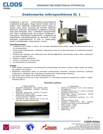 Znakowarka mikropunktowa EL 1 Urządzenia z serii EL – przemysłowe pneumatyczne urządzania znakujące, mogą nanosić trwały znak na metal i inne materiały. Znakowane cechy mogą zawierać cyfry, litery, symbole jak również elementy graficzne. Głównym elementem urządzenia znakującego jest komputer wraz z pakietem oprogramowania, które charakteryzuje się prostym działaniem i intuicyjnym interfejsem użytkownika. Urządzania do znakowania mikropunktowego są używane w wielu branżach przemysłowych w tym w motoryzacji, branży narzędziowej, maszynowej i innych. Charakterystyka Urządzenie jest proste w użyciu, nie wymaga specjalistycznej wiedzy nawet do zastosowania go na linii produkcyjnej. Dzięki dużej częstotliwości i szybkości znakowania może być wykorzystywane do znakowania produkcji masowej. Możliwa jest regulacja siły znakowania jak również głębokości nanoszonego znaku, który maksymalnie może osiągnąć 1 mm. Stabilne, trwałe i bezpieczne Proste w utrzymaniu i konserwacji Nie zanieczyszcza środowiska Uwagi: Ilość znaków nanoszonych na powierzchnię znakowanego elementu w danym czasie zależy od wielkości znaków i ich budowy. Głębokość znakowania zależy od twardości znakowanego materiału, ciśnienia powietrza, szybkości znakowania i odległości igły znakującej od powierzchni znakowanego elementu. Szerokość znaku zależy od grubości zastosowanej igły. Igła znakująca porusza się w dwu kierunkach X-Y, poruszana sprężonym powietrzem uderza z częstotliwością 300 Hz Parametry systemu I. Opcje systemu II. Parametry Zawartość znakowania: cyfry arabskie, litery alfabetu angielskiego, symbole, elementy graficzne. Możliwość znakowania numerów seryjnych, numerów VIN, daty i czasu Maksymalna dopuszczalna twardość znakowanego elementu: ≤HRC63. Znakowanie może odbywać się w linii, po łuku jak również macierzowo. Głębokość znakowania: 0.01~1mm (zależnie od materiału). Szybkość znakowania: 1~3 znaki na sekundę (wysokość znaku 5 mm) Maksymalny obszar znakowania: 100*80 mm2 ~ 200*200 mm2. Ciśnienie sprężonego powietrza: 0.4 ~0.6 Mpa. Zużycie powietrza: 3L/s. Zasilanie: 220VAC±10% 50Hz. (Możliwe 110VAC±10% 60Hz na życzenie klienta) Pobór energii: ≤100W. Temperatura: 1~40. Wilgotność: <90%. Waga: 80 kg Str. 1 / 1