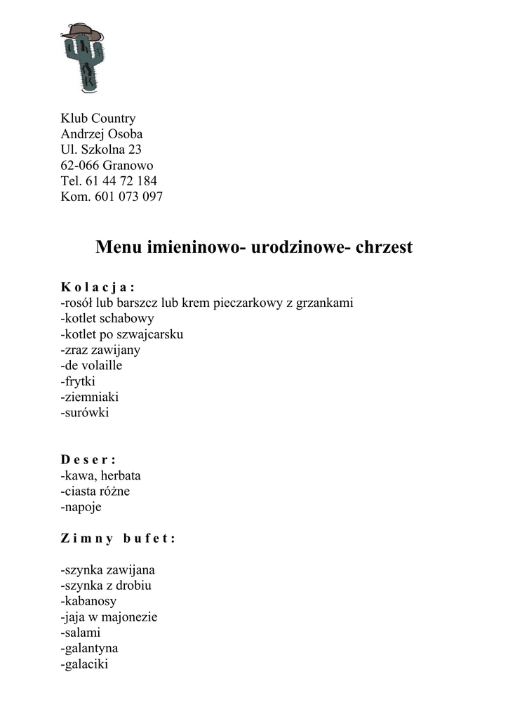 Klub Country Andrzej Osoba Ul. Szkolna 23 62-066 Granowo Tel. 61 44 72 184 Kom. 601 073 097 Menu imieninowo- urodzinowe- chrzest Kolacja: -rosół lub barszcz lub krem pieczarkowy z grzankami -kotlet schabowy -kotlet po szwajcarsku -zraz zawijany -de volaille -frytki -ziemniaki -surówki Deser: -kawa, herbata -ciasta różne -napoje Zimny bufet: -szynka zawijana -szynka z drobiu -kabanosy -jaja w majonezie -salami -galantyna -galaciki