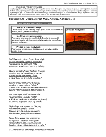 DĄB, Wspólnota św. Jana – 28 lutego 2012 r. ĆWICZENIE PRZYGOTOWAWCZE Usiądę wygodnie, rozluźniając po kolei wszystkie części ciała. Następnie przyjrzę się miejscu, w którym jestem, ludziom dookoła mnie, spróbuję zauważyć każdy szczegół. Potem zamknę oczy i spróbuję usłyszeć wszystkie odgłosy – zarówno te głośniejsze, jak i te, które ledwo do mnie docierają. Na koniec skupię się na swoim oddechu. Mogę wyobrazić sobie, że powietrze, które wdycham, ma jakiś kolor, zobaczę, jak rozchodzi się po moim ciele. Spotkanie XI - Jezus, Herod, Piłat, Kajfasz, Annasz i... ja Część wstępna medytacji /ok. 3 – 5 min./ Stanąć w obecności Boga: Uświadomię sobie, że Bóg, mój Ojciec, chce do mnie teraz mówić, On tu jest teraz obecny... Modlitwa przygotowawcza: Poproszę, abym na tej modlitwie był w stanie odwrócić wzrok od swojej wizji swego życia i przyjąć to, na co Bóg chce mi wskazać... Prośba o owoc medytacji: Poproszę o umiejętność dostrzegania prawdy o sobie i moim życiu Pod Twym Krzyżem, Panie Jezu, staję na codziennych, nijakich rozstajach i serdecznie się żalę nad Tobą wiecznym smutkiem i wieczną żałobą. Czemu zemstą dyszał Kajfasz, Annasz, zamiast szeptać modlitwy poranne? Czemu podły był Herod i Piłat, a złość ludu na Krzyż Cię przybiła? Czemu droga szła aż na Golgotę, zamiast w pola zielone i złote? Czemu dziki krzak cierniem się wkrzewił? Czemu rosło krzyżowe gdzieś drzewo? We mnie była złość saduceuszów i bezmyślność Heroda, Piłata! A ktoś we mnie płacz niewiast zagłuszał, to znów z krzykiem ulicy się bratał. Moje drogi szły wprost na Golgotę. Nasadziłem hyzopu i cierni. Drzewo Krzyża jest mojej roboty. Wyciosałem je ciężkie niezmiernie. Panie Jezu, przez nas umęczony, na nijakich i pustych rozstajach miłosierdziem nas Swoim osłonisz. Powiesz cicho: „Będziecie dziś w raju.” (o. J. Majkowski SJ, Lamentacje nad cierpiącym Jezusem) Obraz do medytacji: Część właściwa medytacji /ok. 25 min./ 1) Na codziennych rozstajach – na Golgocie (1) Zobaczyć Pod Twym Krzyżem, Panie Jezu, staję na codziennych, nijakich rozstajach i serdecznie się żalę nad Tobą wiecznym smutkiem i wieczną żałobą. (2) Rozważyć Pomyślę o tych momentach mojej codzienności, które są trudne albo po prostu zwykłe i nijakie, w których czegoś mi brakuje. Zastanowię się jak reaguję w takich chwilach, ile jest we mnie żalu. Te momenty to moja Golgota... Zobaczę siebie na tej Golgocie. Gdzie jestem? Obok Maryi i Jana? Razem z płaczącymi niewiastami? Gdzieś w tłumie, wśród tych, którzy wolą się nie wychylać? A może... na krzyżu? 2) W drodze na Golgotę (1) Zobaczyć Czemu zemstą dyszał Kajfasz, Annasz, zamiast szeptać modlitwy poranne? Czemu podły był Herod i Piłat, a złość ludu na Krzyż Cię przybiła? (2) Rozważyć Zobaczę jak łatwo jest mi oceniać innych... Czy nie próbuję czasem obarczyć innych odpowiedzialnością za to, co w moim życiu jest nie tak, co w świecie jest nie tak? Pomyślę o swoich Herodach, Piłatach, Kajfaszach i Annaszach – czy nie jestem do nich trochę podobny? Może to moje decyzje kierują moje drogi na Golgotę...? 3) Na Golgocie – w drodze do raju (1) Zobaczyć Powiesz cicho: „Będziecie dziś w raju.” „Jezus mu odpowiedział: Zaprawdę, powiadam ci: Dziś ze Mną będziesz w raju.” (Łk 23,43) (2) Rozważyć Jeszcze raz znajdę się na swojej Golgocie. Popatrzę na krzyż. To nie ja na nim wiszę... Spojrzę w oczy Jezusowi i usłyszę, jak mówi do mnie, że będę z Nim w raju... Zobaczę, jak On przemienia rzeczywistość. Wszystkie drogi mojego życia, które prowadzą na Golgotę, ku śmierci, stają się dzięki Niemu drogą do raju, do życia. ROZMOWA KOŃCOWA Porozmawiam z Jezusem jak z przyjacielem o tym, co w czasie tej medytacji (1) zobaczyłem i (2) rozważyłem. Poproszę, aby On przemieniał wszystkie moje Golgoty w drogę do raju.