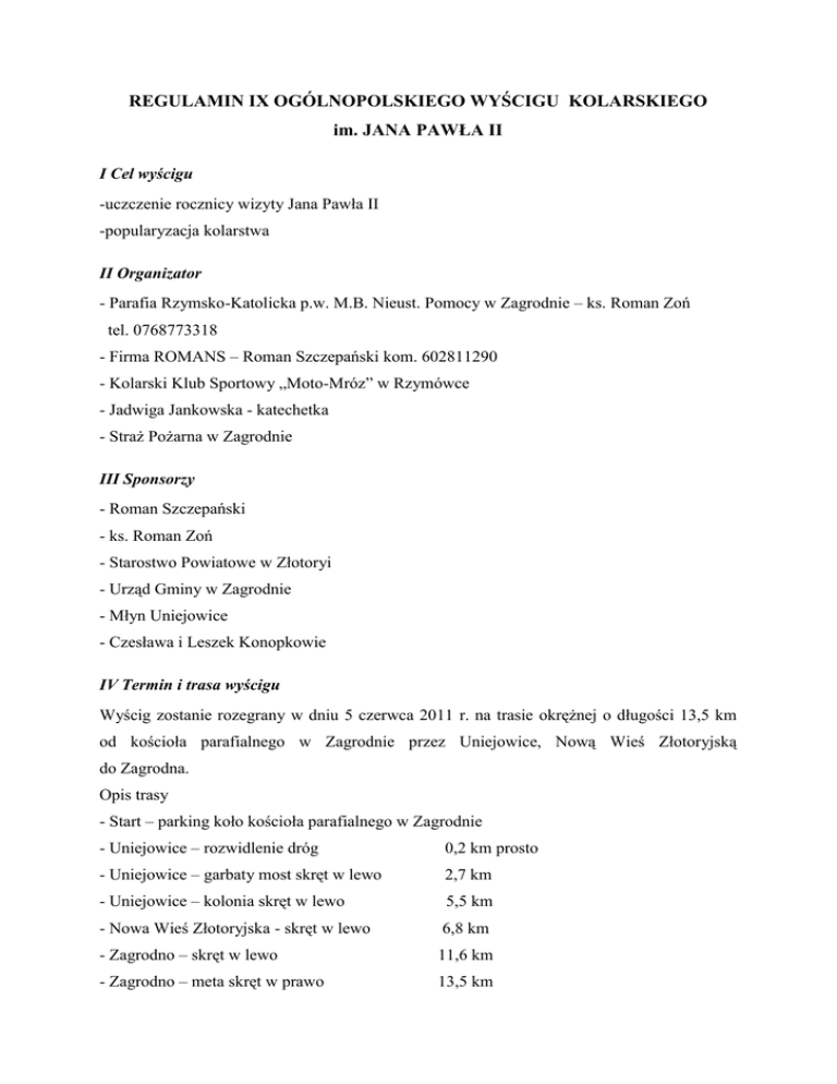 REGULAMIN IX OGÓLNOPOLSKIEGO WYŚCIGU KOLARSKIEGO im. JANA PAWŁA II I Cel wyścigu -uczczenie rocznicy wizyty Jana Pawła II -popularyzacja kolarstwa II Organizator - Parafia Rzymsko-Katolicka p.w. M.B. Nieust. Pomocy w Zagrodnie – ks. Roman Zoń tel. 0768773318 - Firma ROMANS – Roman Szczepański kom. 602811290 - Kolarski Klub Sportowy „Moto-Mróz” w Rzymówce - Jadwiga Jankowska - katechetka - Straż Pożarna w Zagrodnie III Sponsorzy - Roman Szczepański - ks. Roman Zoń - Starostwo Powiatowe w Złotoryi - Urząd Gminy w Zagrodnie - Młyn Uniejowice - Czesława i Leszek Konopkowie IV Termin i trasa wyścigu Wyścig zostanie rozegrany w dniu 5 czerwca 2011 r. na trasie okrężnej o długości 13,5 km od kościoła parafialnego w Zagrodnie przez Uniejowice, Nową Wieś Złotoryjską do Zagrodna. Opis trasy - Start – parking koło kościoła parafialnego w Zagrodnie - Uniejowice – rozwidlenie dróg 0,2 km prosto - Uniejowice – garbaty most skręt w lewo 2,7 km - Uniejowice – kolonia skręt w lewo 5,5 km - Nowa Wieś Złotoryjska - skręt w lewo 6,8 km - Zagrodno – skręt w lewo 11,6 km - Zagrodno – meta skręt w prawo 13,5 km V Uczestnictwo W wyścigu mogą uczestniczyć zawodnicy zrzeszeni ( posiadający ważną licencję MASTERS 2011, ubezpieczenie OC i NW, aktualne badania lekarskie ) i nie zrzeszeni; prawo startu w wyścigu mają również dzieci do lat 18 za zgodą rodziców lub opiekunów. Zawodnicy startują obowiązkowo w kaskach sztywnych oraz na sprawnych technicznie rowerach. VI Zgłoszenia Zgłoszenia będą przyjmowane w biurze wyścigu w dniu 5 czerwca 2011 w sali parafialnej przy kościele od godz. 9.00 VII Zasady finansowania - koszty organizacyjne ponosi organizator - koszty osobowe i startowe ponoszą zawodnicy VIII Sposób rozegrania wyścigu - wyścig zostanie rozegrany zgodnie z przepisami sportowymi Szkol; - zwycięzcami w poszczególnych kategoriach wiekowych będą zawodnicy, którzy przejadą trasę wyścigu i miną linię mety jako piersi; IX Nagrody Zwycięzcy w kategoriach wiekowych otrzymają puchary oraz dyplomy do 3 miejsca. Nagrody główne zostaną rozlosowane wśród uczestników wyścigu. X Program minutowy W godz. od 9,00 do 11,30 weryfikacja dokumentów od 11,30 do 11,45 odprawa techniczna od 12,00 do 12,45 Msza Święta XI Kategorie wiekowe - kat open 15-29 lat dystans okrążeń 5 x 13,5 km - kat I 30-39 lat dystans okrążeń 5 x 13,5 km - kat II 40-49 lat dystans okrążeń 5 x 13,5 km - kat III 50-59 lat dystans okrążeń 4 x 13,5 km - kat IV 60 lat dystans okrążeń 4 x 13,5 km - kat V 70 lat dystans okrążeń 3 x 13,5 km - kat skrzat 8-12 lat dystans 4 km - kat młodzik 13-14 lat dystans 4 km - kat nie zrzeszeni 15-40 lat dystans 4 km - kat nie zrzeszeni pow. 41 lat dystans 4 km XII Orientacyjny program startów: - godz. 13,00 kat skrzat, młodzik, nie zrzeszeni - godz. 13,45 kat Open i Masters Poszczególne kategorie startują co 3 minuty. XIII Wpisowe Opłata startowa dla kat. MASTERS kat. I do III - 30 zł kat. IV do V - 15 zł kat. Open - 15 zł pozostali - 5 zł Dzieci do 14 lat bez opłaty XIV Przepisy końcowe - zawody zostaną rozegrane zgodnie z przepisami PZKol - zawodnicy startują w kaskach ochronnych - zawodnicy winni posiadać ubezpieczenie NW i OC - wyścig rozegrany zostanie przy częściowo ograniczonym ruchu drogowym - zawodnicy zobowiązani są do przestrzegania przepisów o ruchu drogowym - dzieci niepełnoletnie biorące udział w imprezie winny mieć pisemną zgodę rodziców lub opiekunów - za wypadki na trasie powstałe z winy zawodników oraz za rzeczy pozostawione organizator nie ponosi odpowiedzialności - po odbiór nagród zawodnik winien zgłosić się osobiście - we wszystkich sprawach nie ujętych w Regulaminie decyduje Sędzia Główny Pan Sławomir Marczewski w porozumieniu z organizatorem - w przypadku małej ilości zawodników grupy mogą być łączone - organizator zastrzega sobie prawo wprowadzenia zmian w Regulaminie Adres szpitala ZOZ Złotoryja ul. Hoża 11 Tel. 076 8779574