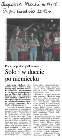 Czternastu młodych wyko nawców wzięło udział w tego rocznej edycji Festiwalu Piosen ki Niemieckiej organizowanym w III Liceum Ogólnokształcą cym im. Marii Dąbrowskiej. Za brzmiały pop, rock, a nawet mu zyka wojskowa i ludowa z cha rakterystycznym dla niemieckie go regionu jodłowaniem. Pierw sze miejsce przyznano Sarze Trafas z Gimnazjum nr 5. Do udziału w festiwalu promują cym muzykę i język niemiecki or ganizatorzy zaprosili młodzież już po raz dziewiąty. Śpiewali liceali ści i gimnazjaliści ze szkól płoc kich i powiatu płockiego. - Festi wal ma wzbudzać zainteresowanie uczniów językiem niemieckim, roz wijać pozytywne nastawienie do jego nauki, pozwalać trenować wy mowę oraz sprawdzić talent wo kalny uczestników - mówi Anna Wysocka-Bijak, jedna z organiza torek konkursu. Jego pomysłodaw czynią jest nauczycielka języka niemieckiego w III LO Małgorzata Starzyńska. - Nasz festiwal cieszy się rokrocznie dużym zaintereso waniem. Wielu uczestników przez parę lat z rzędu chętnie bierze w nim udział - mówi. Festiwal to przegląd różnorod nego repertuaru. Młodzież sięga po utwory rockowe i popowe, ale także muzykę wojskową czy ludo wą, wykorzystując popularne w tym gatunku w Niemczech jo dłowanie. - W ten sposób młodzież poznaje kulturę naszego sąsiada, a festiwal jest także sposobem na przeprowadzenie nietypowej lekcji języka niemieckiego - dodaje M a ł gorzata Starzyńska. Interpretacje muzyczne oraz talent wokalny tegorocznych uczestników oceniali nauczyciele języka niemiec kiego i muzycy. Pierwsze miejsce jurorzy przyznali Sarze Trafas z Gimnazjum nr 5, drugie Aleksan drze K e l m i Zuzannie Parulskiej z Liceum Akademickiego Państwo wej Wyższej Szkoły Zawodowej, a trzecie - Aleksandrze Wojcie chowskiej z Gimnazjum nr 6. rad