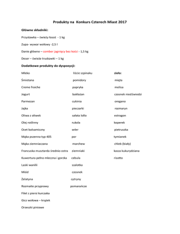 Produkty na Konkurs Czterech Miast 2017 Główne składniki: Przystawka – świeży łosoś - 1 kg Zupa- wywar wołowy -2,5 l Danie główne – comber jagnięcy bez kości - 1,5 kg Deser – świeże truskawki – 1 kg Dodatkowe produkty do dyspozycji: Mleko liście szpinaku zioła: Śmietana pomidory mięta Creme fraiche papryka melisa Jogurt bakłażan czosnek niedźwiedzi Parmezan cukinia oregano Jajka pieczarki rozmaryn Oliwa z oliwek sałata lollo estragon Olej roślinny rukola koperek Ocet balsamiczny seler pietruszka Mąka pszenna typ 405 por tymianek Mąka ziemniaczana marchew chleb (biały) Francuska musztarda średnio ostra ziemniaki kasza kukurydziana Kuwertura pełno mleczna i gorzka cebula risotto Laski wanilii szalotka Miód czosnek Żelatyna cytryny Rozmaite przyprawy pomarańcze Filet z piersi kurczaka Gicz wołowa – krążek Orzeszki piniowe