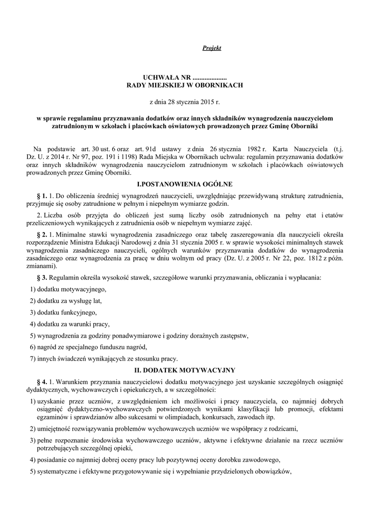 Projekt UCHWAŁA NR .................... RADY MIEJSKIEJ W OBORNIKACH z dnia 28 stycznia 2015 r. w sprawie regulaminu przyznawania dodatków oraz innych składników wynagrodzenia nauczycielom zatrudnionym w szkołach i placówkach oświatowych prowadzonych przez Gminę Oborniki Na podstawie art. 30 ust. 6 oraz art. 91d ustawy z dnia 26 stycznia 1982 r. Karta Nauczyciela (t.j. Dz. U. z 2014 r. Nr 97, poz. 191 i 1198) Rada Miejska w Obornikach uchwala: regulamin przyznawania dodatków oraz innych składników wynagrodzenia nauczycielom zatrudnionym w szkołach i placówkach oświatowych prowadzonych przez Gminę Oborniki. I.POSTANOWIENIA OGÓLNE § 1. 1. Do obliczenia średniej wynagrodzeń nauczycieli, uwzględniając przewidywaną strukturę zatrudnienia, przyjmuje się osoby zatrudnione w pełnym i niepełnym wymiarze godzin. 2. Liczba osób przyjęta do obliczeń jest sumą liczby osób zatrudnionych na pełny etat i etatów przeliczeniowych wynikających z zatrudnienia osób w niepełnym wymiarze zajęć. § 2. 1. Minimalne stawki wynagrodzenia zasadniczego oraz tabelę zaszeregowania dla nauczycieli określa rozporządzenie Ministra Edukacji Narodowej z dnia 31 stycznia 2005 r. w sprawie wysokości minimalnych stawek wynagrodzenia zasadniczego nauczycieli, ogólnych warunków przyznawania dodatków do wynagrodzenia zasadniczego oraz wynagrodzenia za pracę w dniu wolnym od pracy (Dz. U. z 2005 r. Nr 22, poz. 1812 z późn. zmianami). § 3. Regulamin określa wysokość stawek, szczegółowe warunki przyznawania, obliczania i wypłacania: 1) dodatku motywacyjnego, 2) dodatku za wysługę lat, 3) dodatku funkcyjnego, 4) dodatku za warunki pracy, 5) wynagrodzenia za godziny ponadwymiarowe i godziny doraźnych zastępstw, 6) nagród ze specjalnego funduszu nagród, 7) innych świadczeń wynikających ze stosunku pracy. II. DODATEK MOTYWACYJNY § 4. 1. Warunkiem przyznania nauczycielowi dodatku motywacyjnego jest uzyskanie szczególnych osiągnięć dydaktycznych, wychowawczych i opiekuńczych, a w szczególności: 1) uzyskanie przez uczniów, z uwzględnieniem ich możliwości i pracy nauczyciela, co najmniej dobrych osiągnięć dydaktyczno-wychowawczych potwierdzonych wynikami klasyfikacji lub promocji, efektami egzaminów i sprawdzianów albo sukcesami w olimpiadach, konkursach, zawodach itp. 2) umiejętność rozwiązywania problemów wychowawczych uczniów we współpracy z rodzicami, 3) pełne rozpoznanie środowiska wychowawczego uczniów, aktywne i efektywne działanie na rzecz uczniów potrzebujących szczególnej opieki, 4) posiadanie co najmniej dobrej oceny pracy lub pozytywnej oceny dorobku zawodowego, 5) systematyczne i efektywne przygotowywanie się i wypełnianie przydzielonych obowiązków, 6) podnoszenie kwalifikacji i umiejętności zawodowych, 7) wzbogacenie własnego warsztatu pracy, 8) dbałość o estetykę pomieszczeń i sprawność powierzonych pomocy dydaktycznych oraz innych urządzeń szkolnych, 9) prawidłowe prowadzenie dokumentacji szkolnej i pedagogicznej, 10) rzetelne i terminowe wywiązywanie się z poleceń służbowych, 11) przestrzeganie dyscypliny pracy, 12) zaangażowanie w realizację czynności i zadań określonych w art. 42 ust. 2 pkt 2 i 3 Karty Nauczyciela a w szczególności: a) udział w organizowaniu imprez i uroczystości szkolnych, b) udział w pracach komisji przedmiotowych i innych, c) opieka nad samorządem uczniowskim lub innymi organizacjami uczniowskimi działającymi na terenie szkoły, d) prowadzenie lekcji koleżeńskich lub innych form aktywności w ramach wewnątrzszkolnego doskonalenia zawodowego nauczycieli, e) aktywny udział w realizowaniu innych zadań statutowych szkoły. 2. Dla nauczyciela doradcy metodycznego oprócz kryteriów, o których mowa w ust. 1, podstawą ustalenia dodatku motywacyjnego jest również stopień realizacji zadań takich jak: 1) diagnozowanie potrzeb w zakresie doskonalenia i dokształcania nauczycieli na terenie objętym doradztwem, 2) prowadzenie konsultacji indywidualnych i zespołowych przy warsztacie pracy, 3) organizowanie konferencji przedmiotowo metodycznych, 4) prowadzenie warsztatów metodycznych, 5) współdziałanie z organami i instytucjami oświatowymi (KO, MEN), 6) opracowywanie i upowszechnianie materiałów metodycznych, 7) upowszechnianie innowacji metodycznych 8) organizowanie wystaw środków dydaktycznych i ich promowanie wśród nauczycieli, 9) prowadzenie wzorcowych gabinetów oraz przyczynienie się do ich wzbogacania, 10) podejmowanie działań na rzecz własnego rozwoju, 11) prowadzenie dokumentacji pracy wymaganej dla doradcy metodycznego, 12) koordynowanie pracy zespołu przedmiotowego doradców metodycznych (koordynatorzy), 13) wspomaganie nauczycieli w zdobywaniu kolejnych stopni awansu zawodowego. 3. O wysokości dodatku motywacyjnego dla dyrektorów szkół decydują w szczególności następujące kryteria: 1) umiejętności racjonalnego gospodarowania środkami finansowymi szkoły (placówki): a) przestrzeganie dyscypliny budżetowej w oparciu o posiadane środki finansowe, b) podejmowanie działań zmierzających do wzbogacenia majątku szkolnego, c) pozyskiwanie środków pozabudżetowych oraz umiejętność ich właściwego wykorzystania na cele szkoły, d) podejmowanie działań zapewniających utrzymanie powierzonego mienia w stanie gwarantującym optymalne warunki do realizacji zadań dydaktyczno- wychowawczych; 2) sprawność organizacyjna w realizacji zadań szkoły: a) dyscyplina pracy, podział zadań, terminowość realizacji zadań i zarządzeń, b) podejmowanie działań motywujących nauczycieli do doskonalenia i podnoszenia kwalifikacji zawodowych, c) polityka kadrowa, d) organizowanie konferencji szkoleniowych, e) współpraca z placówkami doskonalenia nauczycieli, f) podejmowanie innych działań mających na celu promowanie szkoły; 3) wysokie efekty w pracy dydaktycznej i wychowawczej szkoły/placówki: a) osiągnięcia uczniów szkoły : nauko