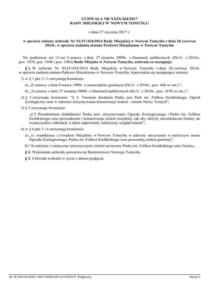 UCHWAŁA NR XXIX/264/2017 RADY MIEJSKIEJ W NOWYM TOMYŚLU z dnia 27 stycznia 2017 r. w sprawie zmiany uchwały Nr XLIV/434/2014 Rady Miejskiej w Nowym Tomyślu z dnia 26 czerwca 2014r. w sprawie nadania statutu Parkowi Miejskiemu w Nowym Tomyślu Na podstawie art. 12 ust. 2 ustawy z dnia 27 sierpnia 2009r. o finansach publicznych (Dz.U. z 2016r., poz. 1870, poz. 1948 i poz. 1984) Rada Miejska w Nowym Tomyślu, uchwala co następuje: § 1. W uchwale Nr XLIV/434/2014 Rady Miejskiej w Nowym Tomyślu z dnia 26 czerwca 2014r. w sprawie nadania statutu Parkowi Miejskiemu w Nowym Tomyślu, wprowadza się następujące zmiany: 1) w § 1 pkt 2 i 3 otrzymują brzmienie: a) „2) ustawy z dnia 8 marca 1990r. o samorządzie gminnym (Dz.U. z 2016r., poz. 446 ze zm.)”; b) „3) ustawy z dnia 27 sierpnia 2009r. o finansach publicznych (Dz.U. z 2016r., poz. 1870 ze zm.)”; 2) § 3 otrzymuje brzmienie: "§ 3. Terenem działania Parku jest Park im. Feliksa Szołdrskiego, Ogród Zoologiczny oraz w zakresie utrzymywania konserwacji zieleni - miasto Nowy Tomyśl"; 3) § 5 otrzymuje brzmienie: „§ 5. Przedmiotem działalności Parku jest: utrzymywanie Ogrodu Zoologicznego i Parku im. Feliksa Szołdrskiego oraz prowadzenie i konserwacja zieleni miejskiej, tak aby służyły mieszkańcom Gminy do wypoczynku i rekreacji, a także zapewniały estetyczny wygląd miasta”; 4) w § 6 pkt 1 i 4 otrzymują brzmienie: a) „1) współpraca z Urzędem Miejskim w Nowym Tomyślu w zakresie utrzymania w należytym stanie Ogrodu Zoologicznego, Parku im. Feliksa Szołdrskiego oraz pozostałej zieleni gminnej”; b) "4) należyte i estetyczne utrzymywanie zieleni na terenie Parku im. Feliksa Szołdrskiego oraz Gminy„. § 2. Wykonanie uchwały powierza się Burmistrzowi Nowego Tomyśla. § 3. Uchwała wchodzi w życie z dniem podjęcia. Id: 5C384144-E0EC-481F-B3B4-6FAA733E0187. Podpisany Strona 1 UZASADNIENIE do Uchwały Nr XXIX/264/2017 Rady Miejskiej w Nowym Tomyślu z dnia 27 stycznia 2017r. w sprawie zmiany uchwały Nr XLIV/434/2014 Rady Miejskiej w Nowym Tomyślu z dnia 26 czerwca 2014r. w sprawie nadania statutu Parkowi Miejskiemu w Nowym Tomyślu Dnia 26 czerwca 2014r. Rada Miejska w Nowym Tomyślu podjęła uchwałę Nr XLIV/434/2014 w sprawie nadania statutu Parkowi Miejskiemu w Nowym Tomyślu, będącemu jednostką organizacyjną Gminy Nowy Tomyśl. W statucie tym określono teren działania Parku Miejskiego, który obejmował Nowotomyski Park Kultury i Wypoczynku, Ogród Zoologiczny oraz w zakresie utrzymywania konserwacji zieleni - miasto Nowy Tomyśl. W dniu 29 lutego 2016r. uchwałą Nr XVIII/161/2016 Rada Miejska w Nowym Tomyślu nadała zarządzanemu przez Park Miejski - Parkowi Kultury i Wypoczynku w Nowym Tomyślu nazwę Park im. Feliksa Szołdrskiego. Z uwagi na powyższe w treści statutu Parku Miejskiego w Nowym Tomyślu, występującą w nim kilkukrotnie dotychczasową nazwę Nowotomyski Parku Kultury i Wypoczynku należało zastąpić nazwą Park im. Feliksa Szołdrskiego. Dokonując tej zmiany uwzględniono również zaistniałe od roku 2014 zmiany w przepisach prawnych, na podstawie których działa ta jednostka budżetowa Gminy. Powyższe w pełni uzasadnia dokonanie zmiany statutu Parku Miejskiego w Nowym Tomyślu zgodnie z treścią proponowaną w uchwale. Id: 5C384144-E0EC-481F-B3B4-6FAA733E0187. Podpisany Strona 1