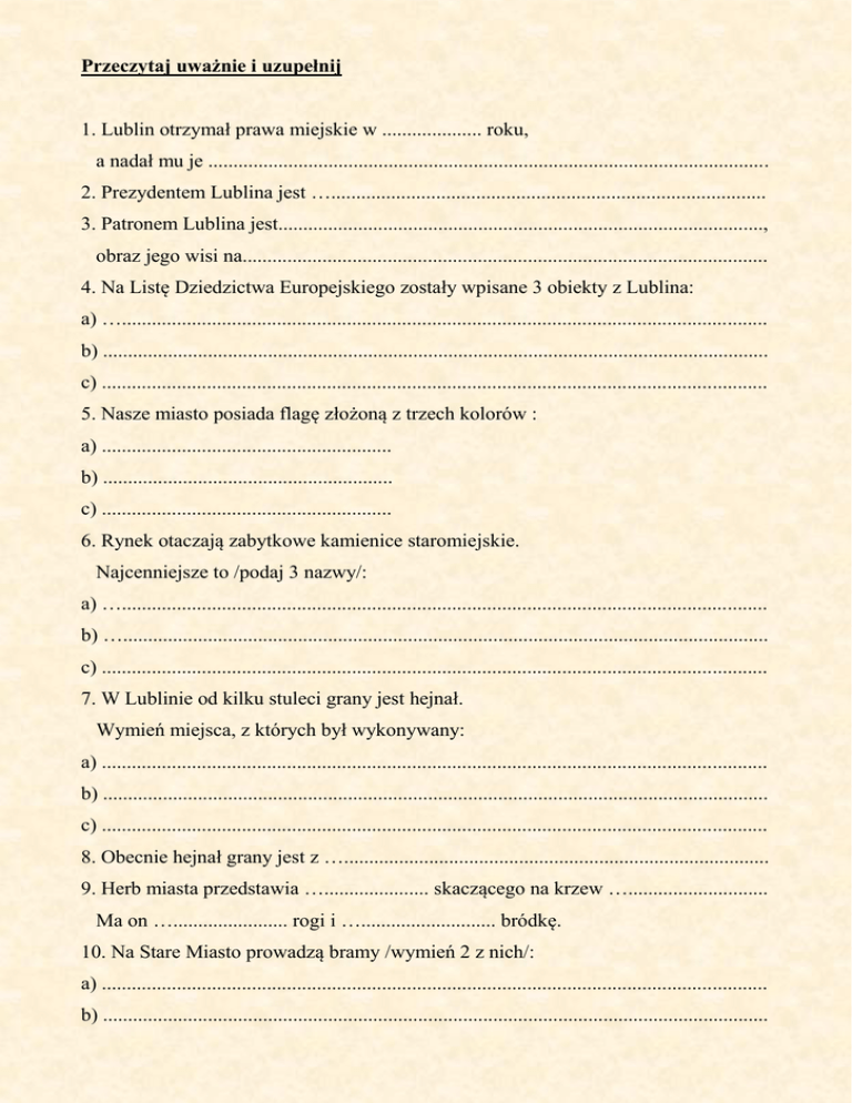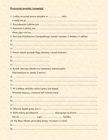 Przeczytaj uważnie i uzupełnij 1. Lublin otrzymał prawa miejskie w .................... roku, a nadał mu je ................................................................................................................ 2. Prezydentem Lublina jest …....................................................................................... 3. Patronem Lublina jest................................................................................................., obraz jego wisi na......................................................................................................... 4. Na Listę Dziedzictwa Europejskiego zostały wpisane 3 obiekty z Lublina: a) …................................................................................................................................. b) ..................................................................................................................................... c) ..................................................................................................................................... 5. Nasze miasto posiada flagę złożoną z trzech kolorów : a) .......................................................... b) .......................................................... c) .......................................................... 6. Rynek otaczają zabytkowe kamienice staromiejskie. Najcenniejsze to /podaj 3 nazwy/: a) …................................................................................................................................. b) …................................................................................................................................. c) ..................................................................................................................................... 7. W Lublinie od kilku stuleci grany jest hejnał. Wymień miejsca, z których był wykonywany: a) ..................................................................................................................................... b) ..................................................................................................................................... c) ..................................................................................................................................... 8. Obecnie hejnał grany jest z …..................................................................................... 9. Herb miasta przedstawia …..................... skaczącego na krzew …............................ Ma on …....................... rogi i …........................... bródkę. 10. Na Stare Miasto prowadzą bramy /wymień 2 z nich/: a) ..................................................................................................................................... b) ..................................................................................................................................... 11. W naszym mieście znajduje się wiele pomników. Wymień 4 z nich: a) …................................................................................................................................. b) …................................................................................................................................. c) …................................................................................................................................. d) ..................................................................................................................................... Odpowiedz na pytania 1. Kto sprawuje władzę w Lublinie? …..................................................................................................................................... Gdzie mieści się jego gabinet? …..................................................................................................................................... 2. Jakie państwa i w którym roku podpisały Unię w Lublinie? …..................................................................................................................................... 3. Jak nazywa się budynek stojący na środku Rynku? …..................................................................................................................................... 4. Którzy poeci i pisarze byli związani z Lublinem? /podaj 3 nazwiska/ ….................................................................................................................................. ….................................................................................................................................. ….................................................................................................................................. Podkreśl właściwą odpowiedź 1. Najstarszy zabytek Lublina to: a) Kościół św. Mikołaja b) Wieża, zwana donżonem c) Zamek Lubelski d) Wieża Trynitarska 2. Na zamku Lubelskim przebywali królowie: a) Bolesław Chrobry b) Władysław Jagiełło c) Zygmunt August d) Jan III Sobieski e) Jan Kazimierz 3. Trybunał Koronny powołał w Lublinie: a) Władysław Jagiełło b) Zygmunt August c) Stefan Batory 4. Freski w Kaplicy pw. Trójcy Świętej ufundował: a) Kazimierz Wielki b) Władysław Jagiełło c) Stefan Batory 5. Wewnątrz Bramy Krakowskiej znajduje się: a) Muzeum Historii Miasta Lublina b) Muzeum Literackie Józefa Czechowicza c) Muzeum Lubelskie d) Muzeum Historii Ratusza i Trybunału Koronnego Jagielloński Szlak Unii Lubelskiej - połącz opisy z miejscem wpisując ten sam numer Zamek Lubelski Po podpisaniu Unii w obecności króla odprawiono nabożeństwo dziękczynne. 1 Kościół pw. św. Michała Archanioła W jego komnatach podjęto najważniejsze decyzje polityczne, które zaowocowały podpisaniem i opieczętowaniem aktu Unii a także jej zaprzysiężeniem. 2 Kościół oo. Dominikanów Odprawiano w niej nabożeństwa w intencji Unii 3 Pobern
