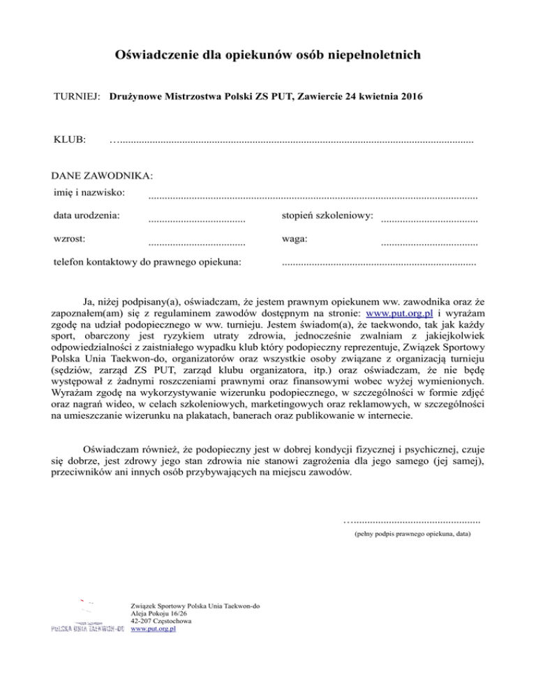 Oświadczenie dla opiekunów osób niepełnoletnich TURNIEJ: Drużynowe Mistrzostwa Polski ZS PUT, Zawiercie 24 kwietnia 2016 KLUB: …................................................................................................................................... DANE ZAWODNIKA: imię i nazwisko: .......................................................................................................................... data urodzenia: .................................... stopień szkoleniowy: .................................... wzrost: .................................... waga: telefon kontaktowy do prawnego opiekuna: .................................... ........................................................................ Ja, niżej podpisany(a), oświadczam, że jestem prawnym opiekunem ww. zawodnika oraz że zapoznałem(am) się z regulaminem zawodów dostępnym na stronie: www.put.org.pl i wyrażam zgodę na udział podopiecznego w ww. turnieju. Jestem świadom(a), że taekwondo, tak jak każdy sport, obarczony jest ryzykiem utraty zdrowia, jednocześnie zwalniam z jakiejkolwiek odpowiedzialności z zaistniałego wypadku klub który podopieczny reprezentuje, Związek Sportowy Polska Unia Taekwon-do, organizatorów oraz wszystkie osoby związane z organizacją turnieju (sędziów, zarząd ZS PUT, zarząd klubu organizatora, itp.) oraz oświadczam, że nie będę występował z żadnymi roszczeniami prawnymi oraz finansowymi wobec wyżej wymienionych. Wyrażam zgodę na wykorzystywanie wizerunku podopiecznego, w szczególności w formie zdjęć oraz nagrań wideo, w celach szkoleniowych, marketingowych oraz reklamowych, w szczególności na umieszczanie wizerunku na plakatach, banerach oraz publikowanie w internecie. Oświadczam również, że podopieczny jest w dobrej kondycji fizycznej i psychicznej, czuje się dobrze, jest zdrowy jego stan zdrowia nie stanowi zagrożenia dla jego samego (jej samej), przeciwników ani innych osób przybywających na miejscu zawodów. …............................................... (pełny podpis prawnego opiekuna, data) Związek Sportowy Polska Unia Taekwon-do Aleja Pokoju 16/26 42-207 Częstochowa www.put.org.pl