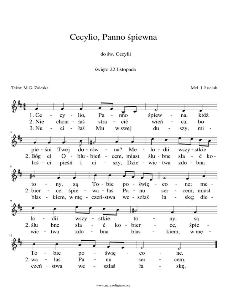 Cecylio, Panno śpiewna do św. Cecylii święto 22 listopada Tekst: M.G. Zaleska 4 4 Mel. J. Łuciuk 1. Ce 2. Nie 3. Nu cy chcia ci lio, łaś łaś Pa stra Mu śpiew wień du na, ca, szy, nno cić w swej któż bo mi 3 pie śni Twej do rów O blu bień 2. Bóg ci łoś ci pieśń i ci na? Me cem, miast szy, Dzie lo dii ślu bne wic twa wszy stkie sła ć ko zdo bna 6 to 2. bier blas ny, są ce, śpie kiem, w mę To bie wa łaś czeń stwa po Pa we świę nu szłaś co ser ła ne; me cem; miast skę; die 9 lo 2. ślu wic dii bne twa wszy sła zdo stkie ć ko bna to bier blas ny, ce, kiem, są śpie w mę 11 To 2. wa czeń bie łaś stwa po Pa we świę nu szłaś www.nuty.religijne.org co ser ła ne. cem. skę.
