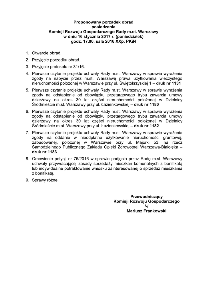 Proponowany porządek obrad posiedzenia Komisji Rozwoju Gospodarczego Rady m.st. Warszawy w dniu 16 stycznia 2017 r. (poniedziałek) godz. 17.00, sala 2016 XXp. PKiN 1. Otwarcie obrad. 2. Przyjęcie porządku obrad. 3. Przyjęcie protokołu nr 31/16. 4. Pierwsze czytanie projektu uchwały Rady m.st. Warszawy w sprawie wyrażenia zgody na nabycie przez m.st. Warszawę prawa użytkowania wieczystego nieruchomości położonej w Warszawie przy ul. Świętokrzyskiej 1 – druk nr 1131 5. Pierwsze czytanie projektu uchwały Rady m.st. Warszawy w sprawie wyrażenia zgody na odstąpienie od obowiązku przetargowego trybu zawarcia umowy dzierżawy na okres 30 lat części nieruchomości położonej w Dzielnicy Śródmieście m.st. Warszawy przy ul. Łazienkowskiej – druk nr 1180 6. Pierwsze czytanie projektu uchwały Rady m.st. Warszawy w sprawie wyrażenia zgody na odstąpienie od obowiązku przetargowego trybu zawarcia umowy dzierżawy na okres 30 lat części nieruchomości położonej w Dzielnicy Śródmieście m.st. Warszawy przy ul. Łazienkowskiej – druk nr 1182 7. Pierwsze czytanie projektu uchwały Rady m.st. Warszawy w sprawie wyrażenia zgody na oddanie w nieodpłatne użytkowanie nieruchomości gruntowej, zabudowanej, położonej w Warszawie przy ul. Majorki 53, na rzecz Samodzielnego Publicznego Zakładu Opieki Zdrowotnej Warszawa-Białołęka – druk nr 1183 8. Omówienie petycji nr 75/2016 w sprawie podjęcia przez Radę m.st. Warszawy uchwały przywracającej zasady sprzedaży mieszkań komunalnych z bonifikatą lub indywidualne potraktowanie wniosku zainteresowanej o sprzedaż mieszkania z bonifikatą. 9. Sprawy różne. Przewodniczący Komisji Rozwoju Gospodarczego /-/ Mariusz Frankowski