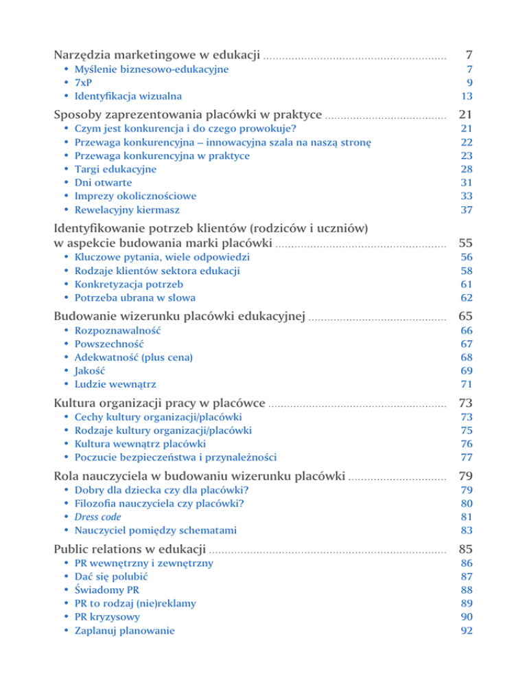Narzêdzia marketingowe w edukacji • Myœlenie biznesowo-edukacyjne • 7xP • Identyfikacja wizualna Sposoby zaprezentowania placówki w praktyce 7 7 9 13 21 • Czym jest konkurencja i do czego prowokuje? • Przewaga konkurencyjna – innowacyjna szala na nasz¹ stronê • Przewaga konkurencyjna w praktyce • Targi edukacyjne • Dni otwarte • Imprezy okolicznoœciowe • Rewelacyjny kiermasz 21 22 23 28 31 33 37 Identyfikowanie potrzeb klientów (rodziców i uczniów) w aspekcie budowania marki placówki 55 • Kluczowe pytania, wiele odpowiedzi • Rodzaje klientów sektora edukacji • Konkretyzacja potrzeb • Potrzeba ubrana w s³owa Budowanie wizerunku placówki edukacyjnej • Rozpoznawalnoœæ • Powszechnoœæ • Adekwatnoœæ (plus cena) • Jakoœæ • Ludzie wewn¹trz Kultura organizacji pracy w placówce • Cechy kultury organizacji/placówki • Rodzaje kultury organizacji/placówki • Kultura wewn¹trz placówki • Poczucie bezpieczeñstwa i przynale¿noœci Rola nauczyciela w budowaniu wizerunku placówki • Dobry dla dziecka czy dla placówki? • Filozofia nauczyciela czy placówki? • Dress code • Nauczyciel pomiêdzy schematami Public relations w edukacji • PR wewnêtrzny i zewnêtrzny • Daæ siê polubiæ • Œwiadomy PR • PR to rodzaj (nie)reklamy • PR kryzysowy • Zaplanuj planowanie 56 58 61 62 65 66 67 68 69 71 73 73 75 76 77 79 79 80 81 83 85 86 87 88 89 90 92 Zarz¹dzanie wizerunkiem w sytuacji kryzysowej • Sztab kryzysowych mózgów • Milczenie bywa z³otem • Mów szybko, ale z sensem • Nie chowaj g³owy w piasek • Wykorzystaæ kryzys Marketing szeptany 97 97 98 99 100 101 103 • Nowinka czy staroæ? • Formy przekazu • Szept kontrolowany 103 105 107 Od teorii do praktyki 111 • Strona internetowa „www.z-umiarem.pl” • List sponsorski • Logo • Ulotka • Folder Podsumowanie rozwa¿añ o budowaniu wizerunku placówki • Strona internetowa placówki • Wirtualna komunikacja • Bez zamkniêtych drzwi • Poczta pantoflowa • Klient traktowany godnie • Placówka na forum lokalnym • Personel i nauczyciele – ¿ywa wizytówka placówki • Wspó³praca z mediami 111 115 118 122 126 131 131 132 133 134 135 136 137 138 Kilka słów na zakończenie... 139 Bibliografia 140 Przyk³adowa strona internetowa 141 Przyk³adowa ulotka 142 Przyk³adowy plakat 143