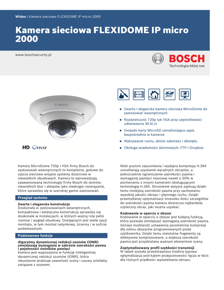 Wideo | Kamera sieciowa FLEXIDOME IP micro 2000 Kamera sieciowa FLEXIDOME IP micro 2000 www.boschsecurity.pl Kamery MicroDome 720p i VGA firmy Bosch do zastosowań wewnętrznych to kompletne, gotowe do użycia sieciowe wizyjne systemy dozorowe w niewielkich obudowach. Kamery te wprowadzają zaawansowaną technologię firmy Bosch do domów, niewielkich biur i sklepów jako niedrogie rozwiązanie, które sprawdza się w szerokiej gamie zastosowań. Przegląd systemu Zwarta i elegancka konstrukcja Doskonała w zastosowaniach wewnętrznych, kompaktowa i estetyczna konstrukcja sprawdza się doskonale w instalacjach, w których ważną rolę pełni rozmiar i wygląd obudowy. Dostępnych jest wiele opcji montażu, w tym montaż natynkowy, ścienny i w suficie podwieszanym. Podstawowe funkcje Algorytmy dynamicznej redukcji szumów (iDNR) zmniejszają wymagania w zakresie szerokości pasma i pojemności nośników pamięci Kamera jest wyposażona w funkcję inteligentnej dynamicznej redukcji szumów (iDNR), która nieustanne analizuje zawartość sceny i usuwa artefakty związane z szumem. u Zwarta i elegancka kamera sieciowa MicroDome do zastosowań wewnętrznych u Rozdzielczość 720p lub VGA przy częstotliwości odświeżania 30 kl./s u Gniazdo karty MicroSD umożliwiające zapis bezpośrednio w kamerze u Wykrywanie ruchu, aktów sabotażu i dźwięku u Obsługa wiadomości alarmowych, FTP i Dropbox Niski poziom zaszumienia i wydajna kompresja H.264 umożliwiają uzyskanie wyraźnych obrazów, a jednocześnie ograniczenie szerokości pasma i wymaganej pamięci masowej nawet o 50% w porównaniu z innymi kamerami obsługującymi technologię H.264. Strumienie wizyjne zajmują dzięki temu mniejszą szerokość pasma przy zachowaniu wysokiej jakości obrazu i płynnego ruchu. Dzięki przemyślanej optymalizacji stosunku ilości szczegółów do szerokości pasma kamera dostarcza najbardziej użyteczny obraz, jaki można uzyskać. Kodowanie w oparciu o obszar Kodowanie w oparciu o obszar jest kolejną funkcją, która pozwala zmniejszyć wymaganą szerokość pasma. Istnieje możliwość ustawienia parametrów kompresji dla ośmiu obszarów programowanych przez użytkownika. Dzięki temu nieistotne fragmenty są efektywnie kompresowane, a większa szerokość pasma jest przydzielana ważnym elementom sceny. Zoptymalizowany profil szybkości transmisji W tabeli została przedstawiona średnia typowa optymalizacja pod kątem przepustowości łącza w kb/s dla różnych prędkości wyświetlania obrazu: 2 | Kamera sieciowa FLEXIDOME IP micro 2000 kl./s 720p 480p 30 1200 600 15 955 478 12 877 438 5 568 284 2 245 122 Rozdzielczość 720p lub VGA i obsługa wielu strumieni Dostępna jest kamera o rozdzielczości 720p lub VGA z częstotliwością odświeżania 30 kl./s. Innowacyjna funkcja obsługi wielu strumieni umożliwia kamerze jednoczesne generowanie kilku strumieni H.264 i strumienia M-JPEG. Strumienie te ułatwiają wyświetlanie i rejestrację obrazu przy optymalnym wykorzystaniu szerokości pasma, a także umożliwiają prostą integrację z systemami zarządzania obrazem innych producentów. Zapis bezpośrednio w kamerze Gniazdo karty microSD obsługuje do 2 TB pojemności pamięci. Karty microSD można używać do lokalnego zapisywania alarmów. Zapis obrazu w pamięci RAM przed wystąpieniem alarmu umożliwia ograniczenie szerokości pasma w sieci przeznaczonej do rejestracji lub — jeśli możliwy jest zapis na karcie microSD — wydłuża żywotność nośnika zapisu. Zabezpieczenie antysabotażowe i wykrywanie ruchu Dostępna jest szeroka gama opcji konfiguracyjnych dotyczących alarmów antysabotażowych. Wbudowany algorytm wykrywający ruch w obrazie może być również stosowany do emitowania sygnału alarmowego. Wbudowany mikrofon i alarm dźwiękowy Kamera ma wbudowany mikrofon, który umożliwia operatorom odbieranie dźwięku z monitorowanego obszaru. W razie potrzeby funkcja wykrywania dźwięku może posłużyć do wyemitowania alarmu. Usługa chmurowa Kamera obsługuje funkcję wysyłania obrazów JPEG na podstawie czasu lub alarmu do czterech różnych kont. Mogą to być między innymi serwery FTP lub usługi przechowywania danych w chmurze (np. Dropbox). Istnieje także możliwość wyeksportowania klipów wideo i obrazów JPEG do tych kont. Po wyzwoleniu alarmu może zostać wysłane powiadomienie w wiadomości e-mail lub SMS. Dzięki temu operator jest zawsze informowany o niespodziewanych zdarzeniach. Prosta instalacja Zasilanie kamery może być dostarczane przez sieć kablową zgodną ze standardem PoE (Power-overEthernet). W takiej konfiguracji do podglądu obrazu, zasilania i sterowania kamerą wystarczy dołączenie tylko jednego przewodu. Dzięki możliwości zasilania przez sieć Ethernet (PoE) instalacja stała się łatwiejsza i tańsza, ponieważ kamery nie wymagają dostępu do sieci energetycznej. Kamera może również być zasilana zasilaczem 12 VDC/ 24 VAC. W celu zwiększenia niezawodności systemu kamera może być podłączona jednocześnie do zasilania PoE oraz 12 VDC/24 VAC. Możliwe jest również zastosowanie zasilaczy awaryjnych (UPS), zapewniających ciągłość pracy nawet w przypadku awarii głównego źródła zasilania. Regulacja położenia w trzech płaszczyznach Regulacja położenia w trzech płaszczyznach pozwala na łatwą instalację na ścianie lub suficie z zachowaniem wyraźnego pola widzenia. Bezpieczeństwo dostępu Kamera obsługuje trójpoziomową ochronę za pomocą hasła oraz uwierzytelnianie 802.1x. W celu zabezpieczenia dostępu przez przeglądarkę internetową należy korzystać z protokołu HTTPS z certyfikatem SSL zapisanym w kamerze. Kompletne oprogramowanie do podglądu obrazu Dostęp do funkcji kamery można uzyskać na kilka sposobów: za pomocą przeglądarki internetowej, oprogramowania Bosch Video Management System, bezpłatnego programu Bosch Video Client oraz aplikacji Video Security dla urządzeń mobilnych l