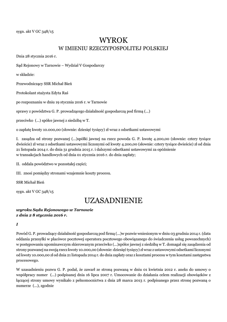 sygn. akt V GC 348/15 WYROK W IMIENIU RZECZYPOSPOLITEJ POLSKIEJ Dnia 28 stycznia 2016 r. Sąd Rejonowy w Tarnowie – Wydział V Gospodarczy w składzie: Przewodniczący SSR Michał Bień Protokolant stażysta Edyta Raś po rozpoznaniu w dniu 19 stycznia 2016 r. w Tarnowie sprawy z powództwa G. P. prowadzącego działalność gospodarczą pod firmą (...) przeciwko (...) spółce jawnej z siedzibą w T. o zapłatę kwoty 10.000,00 (słownie: dziesięć tysięcy) zł wraz z odsetkami ustawowymi I. zasądza od strony pozwanej (...)spółki jawnej na rzecz powoda G. P. kwotę 4.200,00 (słownie: cztery tysiące dwieście) zł wraz z odsetkami ustawowymi liczonymi od kwoty 4.200,00 (słownie: cztery tysiące dwieście) zł od dnia 21 listopada 2014 r. do dnia 31 grudnia 2015 r. i dalszymi odsetkami ustawowymi za opóźnienie w transakcjach handlowych od dnia 01 stycznia 2016 r. do dnia zapłaty; II. oddala powództwo w pozostałej części; III. znosi pomiędzy stronami wzajemnie koszty procesu. SSR Michał Bień sygn. akt V GC 348/15 UZASADNIENIE wyroku Sądu Rejonowego w Tarnowie z dnia 2 8 stycznia 2016 r. I Powód G. P. prowadzący działalność gospodarczą pod firmą (...)w pozwie wniesionym w dniu 03 grudnia 2014 r. (data oddania przesyłki w placówce pocztowej operatora pocztowego obowiązanego do świadczenia usług powszechnych) w postępowaniu upominawczym skierowanym przeciwko (...)spółce jawnej z siedzibą w T. domagał się zasądzenia od strony pozwanej na swoją rzecz kwoty 10.000,00 (słownie: dziesięć tysięcy) zł wraz z ustawowymi odsetkami liczonymi od kwoty 10.000,00 zł od dnia 21 listopada 2014 r. do dnia zapłaty oraz z kosztami procesu w tym kosztami zastępstwa procesowego. W uzasadnieniu pozwu G. P. podał, że zawarł ze stroną pozwaną w dniu 01 kwietnia 2012 r. aneks do umowy o współpracy numer (...) podpisanej dnia 16 lipca 2007 r. Umocowanie do działania celem realizacji obowiązków z łączącej strony umowy wynikało z pełnomocnictwa z dnia 28 marca 2013 r. podpisanego przez stronę pozwaną o numerze (...), zgodnie z którym służyło ono do zawierania w imieniu (...)spółki jawnej umów o dochodzenie roszczeń. § 2. ust. 1. regulaminu wynagrodzenia stanowiącego załącznik do aneksu z dnia 01 kwietnia 2012 r. przewidywał, że jako wynagrodzenie przedstawiciel miał otrzymać prowizję jako procentową wartość fizycznego wpływu środków na rachunek spółki z wartości wynagrodzenia spółki wynegocjowanego przez przedstawiciela przy zawarciu umowy z klientem, od każdej umowy zawartej przy jego udziale. Powód wskazał, że (...)spółka jawna zaniechała wypłaty prowizji za okres od sierpnia do września 2014 r. należnej G. P. z tytułu realizacji postanowień powołanej umowy zgodnie z jej § 3. ust. 4. G. P. naprowadził, że dnia 10 listopada 2014 r. wystawił fakturę VAT numer (...)na kwotę 10.000,00 zł, w której jako termin zapłaty wskazał 20 listopada 2014 r. Wynagrodzenie prowizyjne, którego dochodził, było jedynym sposobem wynagradzania określonym w umowie. Zaniechanie jego wypłacania prowadziło do całkowitego nie wywiązania się z obowiązku zapłaty wynagrodzenia za usługi będące przedmiotem umowy zawartej pomiędzy stronami. Powód podał również, że z uwagi na powyższe naruszenia polegające na braku wypłacenia wynagrodzenia prowizyjnego za miesiąc sierpień 2014 r. pismem z dnia 18 sierpnia 2014 r. rozwiązał łączącą go ze spółką umowę (k. 2 – 6). Na podstawie odpisów dokumentów dołączonych do pozwu oraz twierdzeń zawartych w uzasadnieniu pozwu Sąd Rejonowy w Tarnowie Wydział V Gospodarczy w dniu 16 grudnia 2014 r. wydał nakaz zapłaty w postępowaniu upominawczym, którym nakazał stronie pozwanej (...) spółce jawnej, aby zapłaciła na rzecz powoda G. P. kwotę 10.000,00 zł wraz z ustawowymi odsetkami liczonymi od tej kwoty od dnia 21 listopada 2014 r. do dnia zapłaty oraz kwotę 75,00 zł tytułem zwrotu kosztów procesu, w terminie dwóch tygodni od dnia doręczenia nakazu, albo wniosła w tymże terminie sprzeciw (k. 21). W dniu 14 stycznia 2015 r. strona pozwana (...)spółka jawna wniosła sprzeciw od powyższego nakazu zapłaty, którego odpis został jej doręczony w dniu 31 grudnia 2014 r., zaskarżając go w całości i wnosząc o oddalenie powództwa w całości oraz o zasądzenie od strony powodowej na jej rzecz kosztów procesu według norm przepisanych. W uzasadnieniu sprzeciwu strona pozwana przyznała, że łączyła ją z G. P. umowa o współpracy numer (...) z dnia 16 marca 2007 r. aneksowana w dniu 01 kwietnia 2012 r. i że z tego względu powodowi przysługiwała wierzytelność z tytułu wykonania umowy. W trakcie jej obowiązywania G. P. w związku z jej wykonaniem zasadnie wystawił następujące faktury VAT: • numer (...)opiewającą na kwotę 360,00 zł, • numer (...)opiewającą na kwotę 31,94 zł, • numer (...)opiewającą na kwotę 2.208,00 zł, • numer (...)opiewającą na kwotę 162,00 zł. Pozwana spółka zaznaczyła, że należności te – wynoszące łącznie 2.761,94 zł – uiściła przelewem w całości na rachunek bankowy powoda. (...)spółka jawna zakwestionowała wierzytelność mającą wynikać z faktury VAT numer (...) wskazując, że G. P. poza samą fakturą nie przedstawił dowodów, iż prowizja w takiej wysokości mu przysługiwała. Niezależnie od tego podniosła, że przywołana wyżej umowa o współpracy numer (...) została rozwiązana przez nią na podstawie § 4. ust. 10. aneksu z dnia 01 kwietnia 2012 r. oświadczeniem pisemnym z dnia 22 sierpnia 2014 r. doręczonym powodowi w dniu 26 sierpnia 2014 r. Przyczyną rozwiązania miało być naruszenie przez G. P. § 5. ust. 2. umowy, w którym zobowiązał się nie podejmować bez pisemnej zgody strony pozwanej działalności konkurencyjnej – osobiście lub przez inne osoby, jak też nie wykonywać działalności będącej przedmiotem umów zawieranych z 