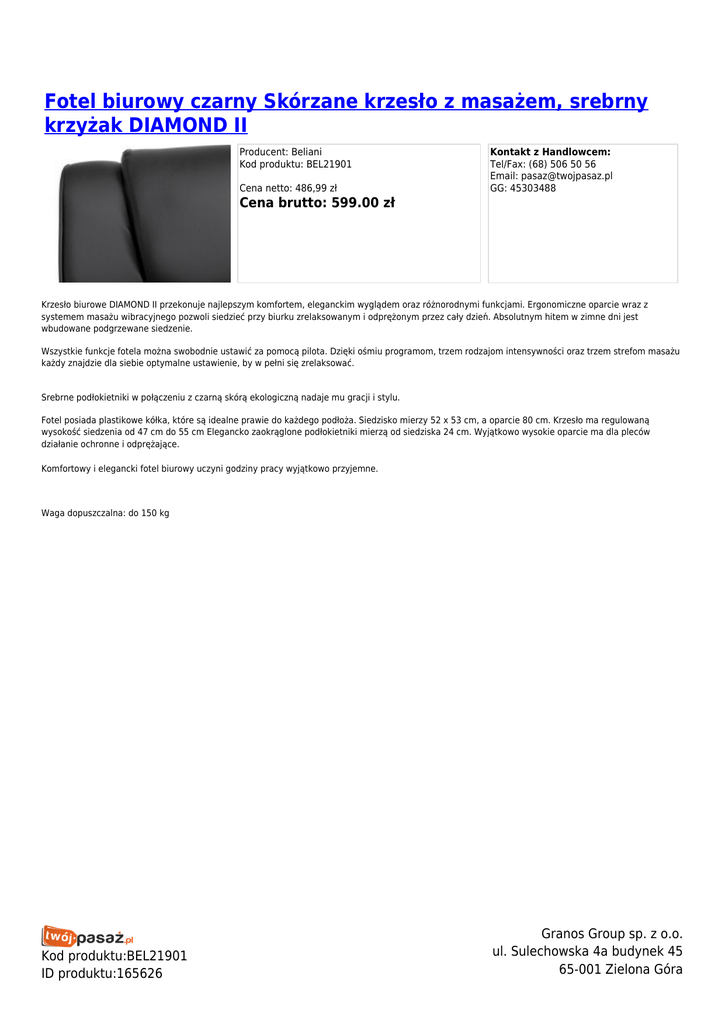 Fotel biurowy czarny Skórzane krzesło z masażem, srebrny krzyżak DIAMOND II Producent: Beliani Kod produktu: BEL21901 Cena netto: 486,99 zł Kontakt z Handlowcem: Tel/Fax: (68) 506 50 56 Email: [email protected] GG: 45303488 Cena brutto: 599.00 zł Krzesło biurowe DIAMOND II przekonuje najlepszym komfortem, eleganckim wyglądem oraz różnorodnymi funkcjami. Ergonomiczne oparcie wraz z systemem masażu wibracyjnego pozwoli siedzieć przy biurku zrelaksowanym i odprężonym przez cały dzień. Absolutnym hitem w zimne dni jest wbudowane podgrzewane siedzenie. Wszystkie funkcje fotela można swobodnie ustawić za pomocą pilota. Dzięki ośmiu programom, trzem rodzajom intensywności oraz trzem strefom masażu każdy znajdzie dla siebie optymalne ustawienie, by w pełni się zrelaksować. Srebrne podłokietniki w połączeniu z czarną skórą ekologiczną nadaje mu gracji i stylu. Fotel posiada plastikowe kółka, które są idealne prawie do każdego podłoża. Siedzisko mierzy 52 x 53 cm, a oparcie 80 cm. Krzesło ma regulowaną wysokość siedzenia od 47 cm do 55 cm Elegancko zaokrąglone podłokietniki mierzą od siedziska 24 cm. Wyjątkowo wysokie oparcie ma dla pleców działanie ochronne i odprężające. Komfortowy i elegancki fotel biurowy uczyni godziny pracy wyjątkowo przyjemne. Waga dopuszczalna: do 150 kg Kod produktu:BEL21901 ID produktu:165626 Granos Group sp. z o.o. ul. Sulechowska 4a budynek 45 65-001 Zielona Góra